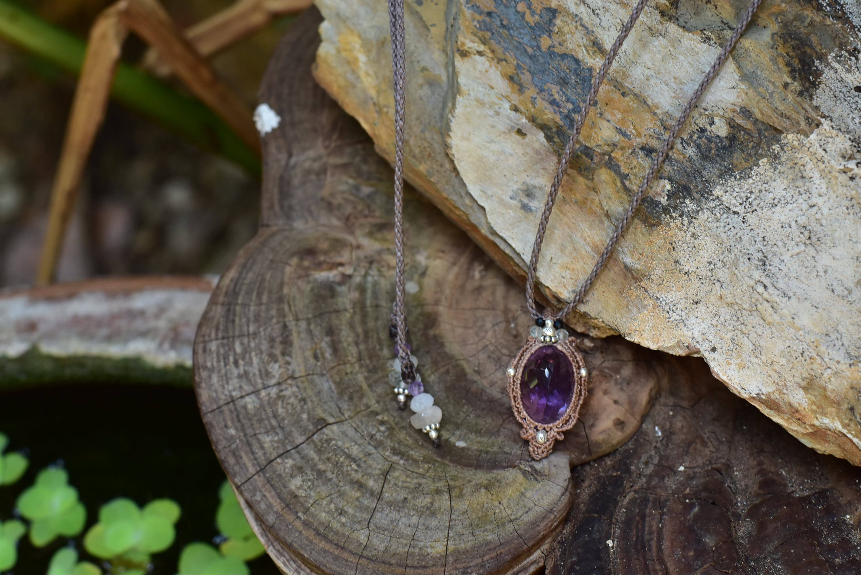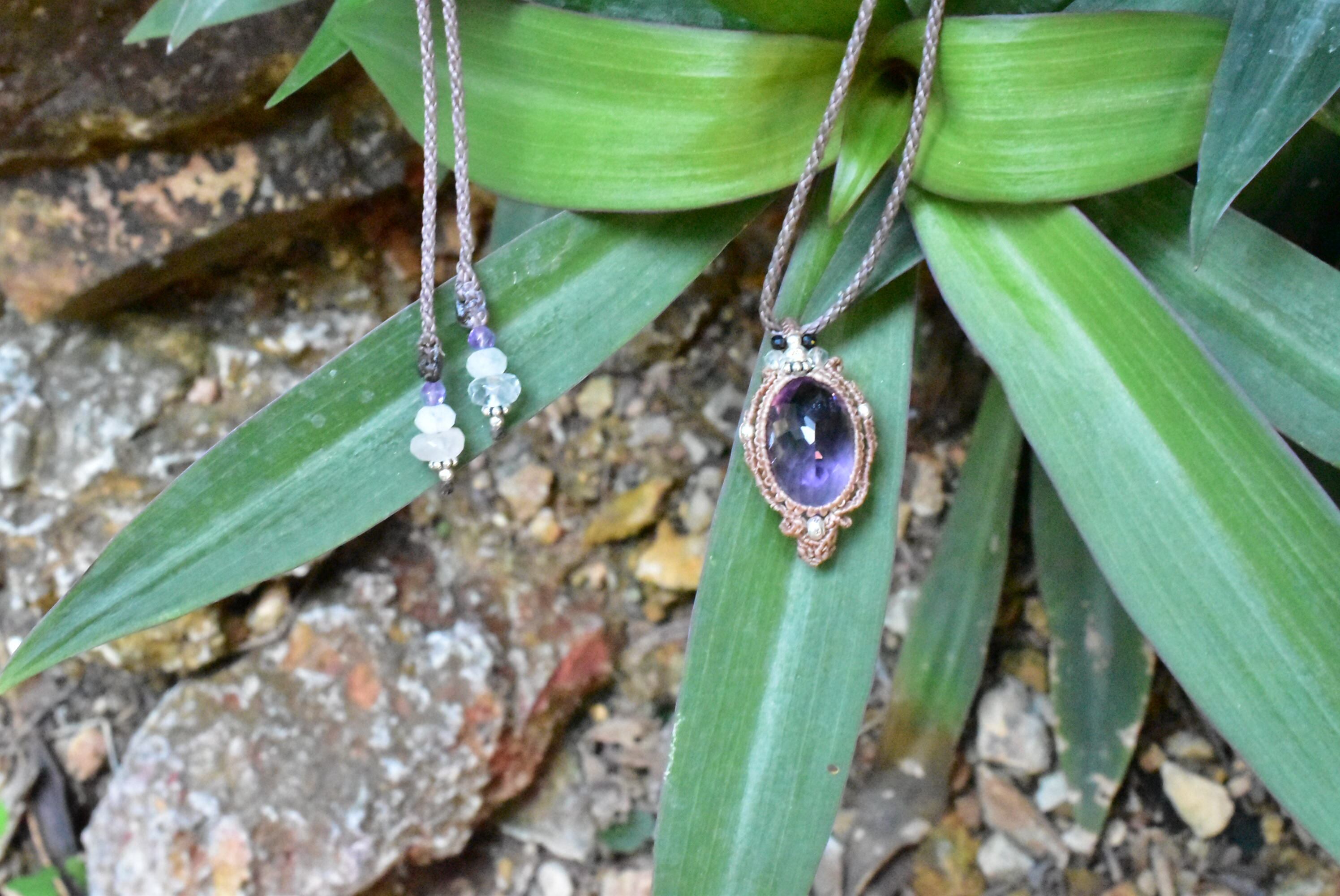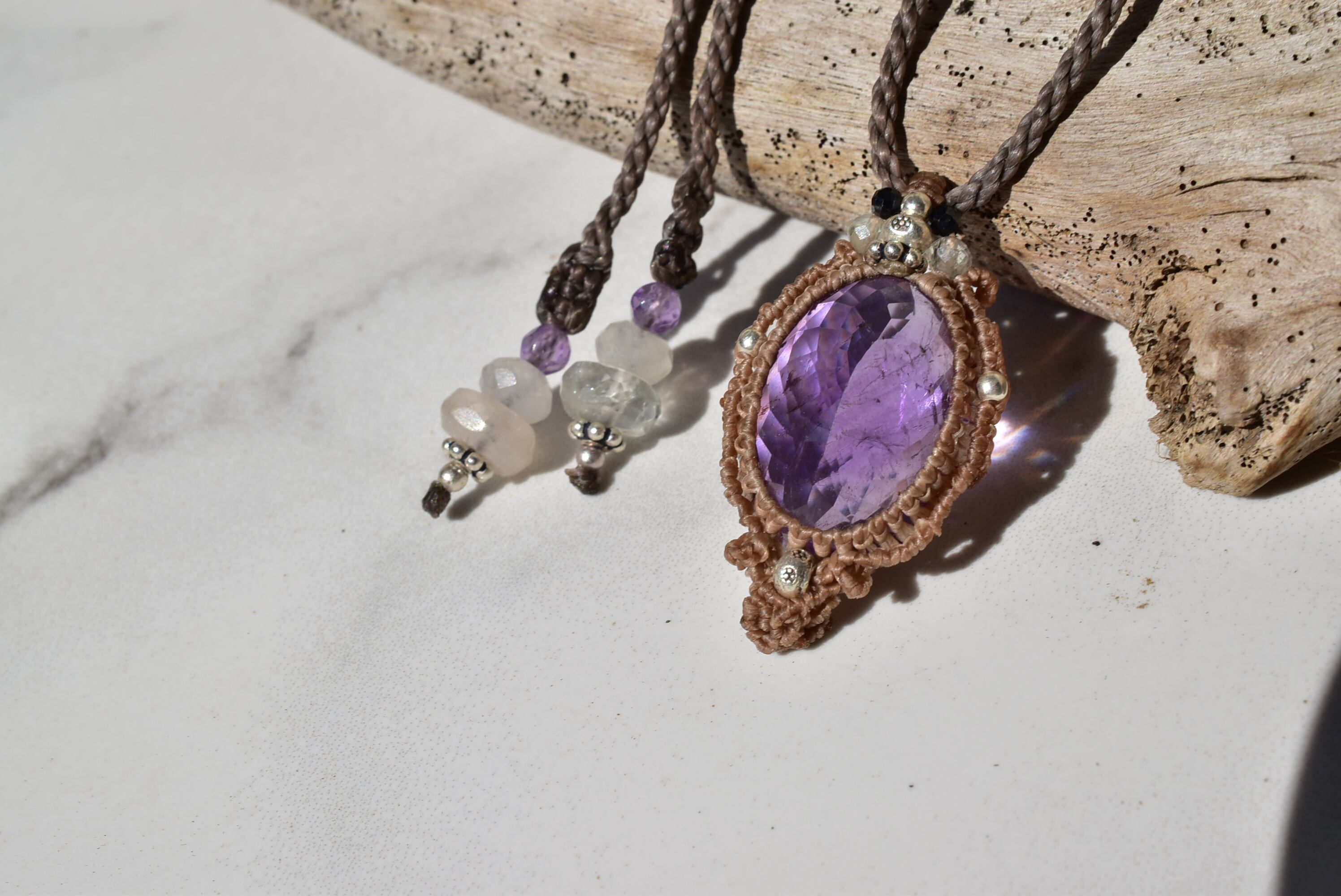 このたびはそんなファセットカットアメジストを石の世界を中心に考えながら、マクラメ編み装飾を施しました。