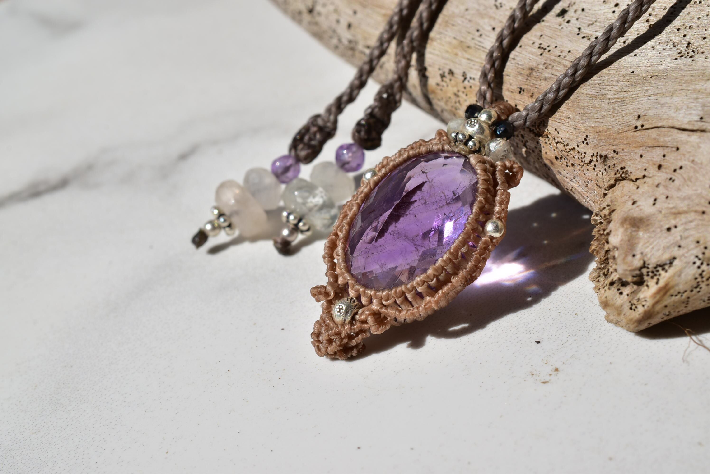 細かいカットが施された面を表にしてこのたびマクラメ編みペンダントに仕上げさせてもらったファセットカットアメジスト。ぷっくりとした厚みもあり、よくみるとルースの中の自然のクラック層から虹インクルージョンもチラホラと見ることができます。