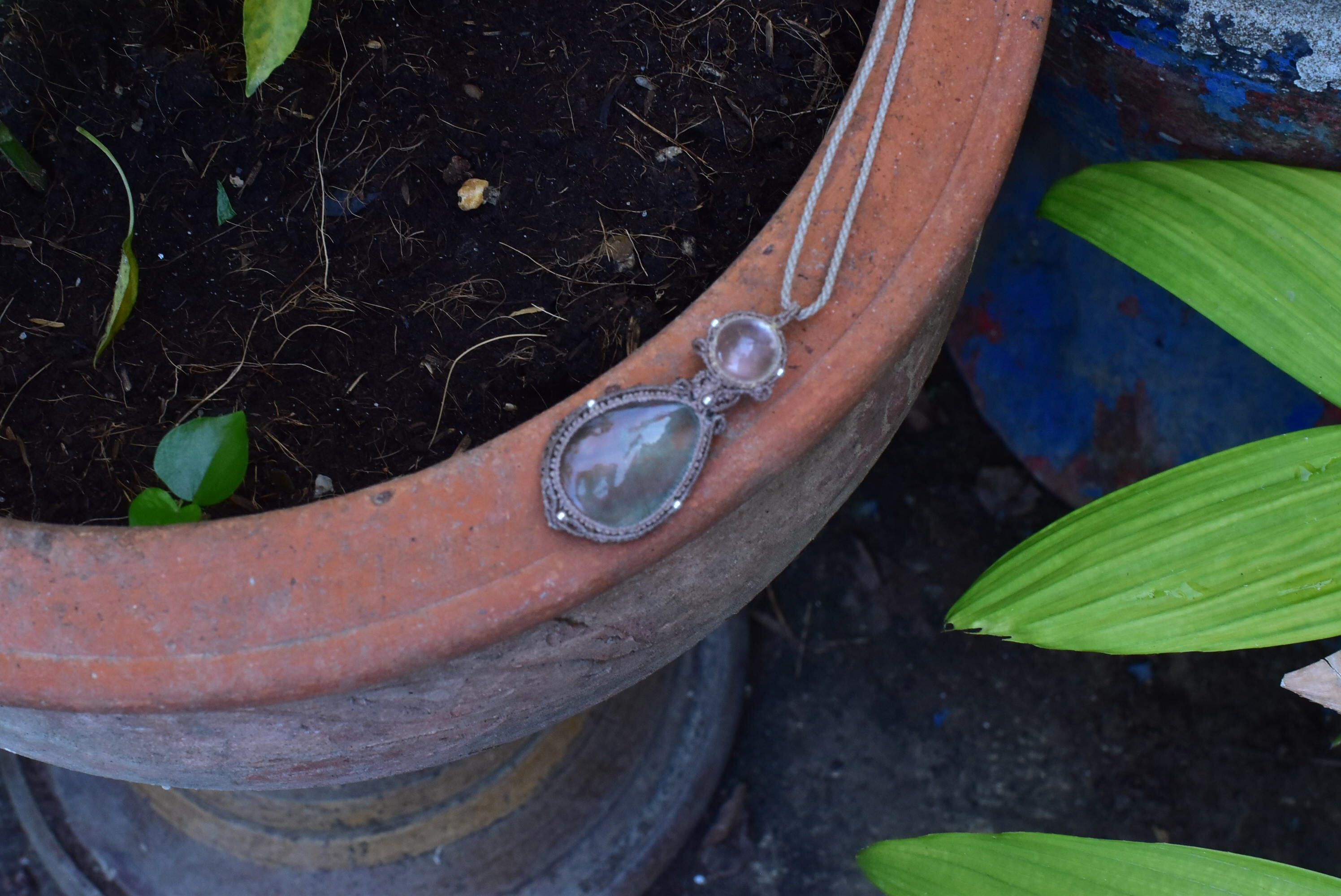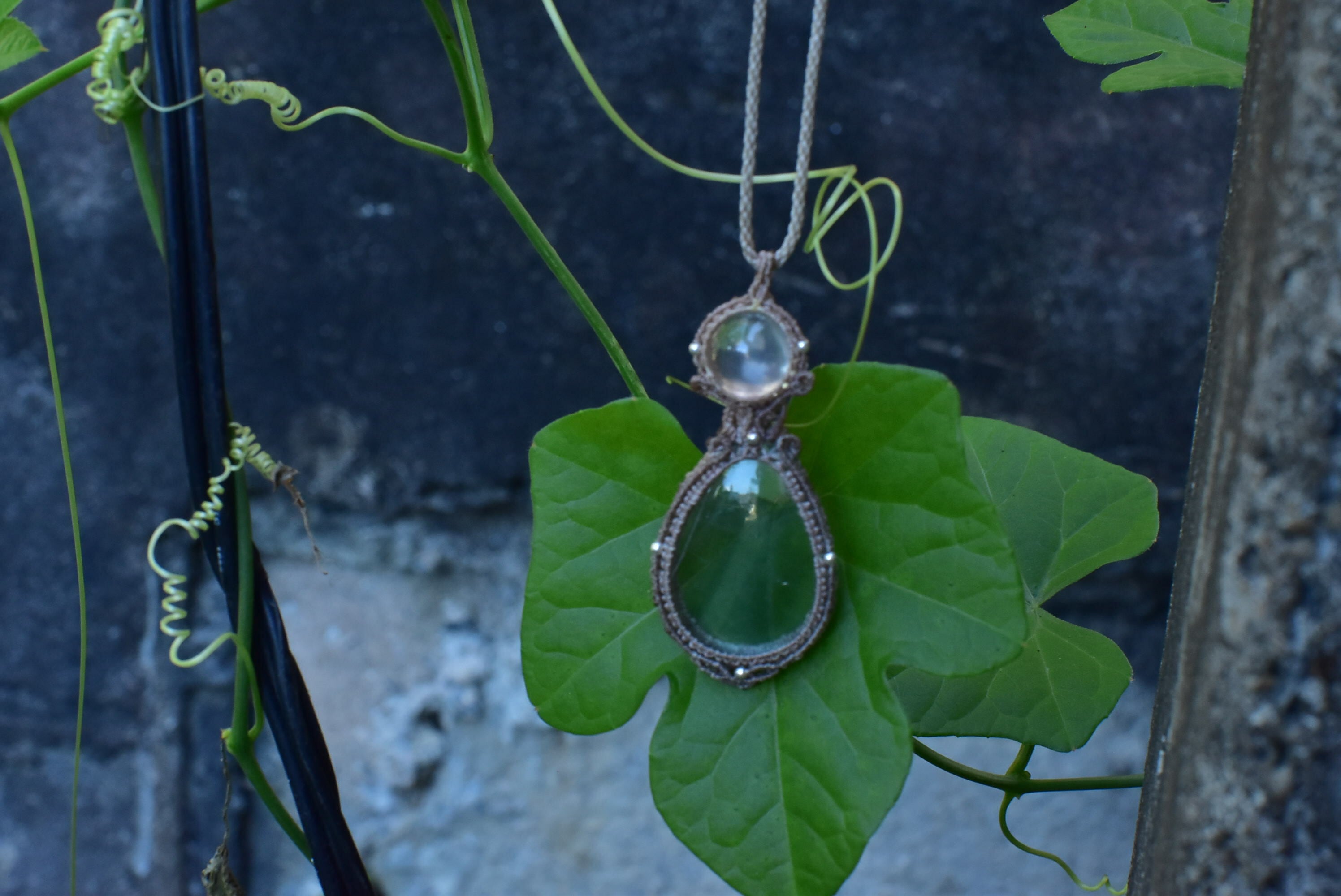 ◆このたびは生成り、カフェオレ色の蝋引き糸を使用しマクラメ編み装飾を施しました。