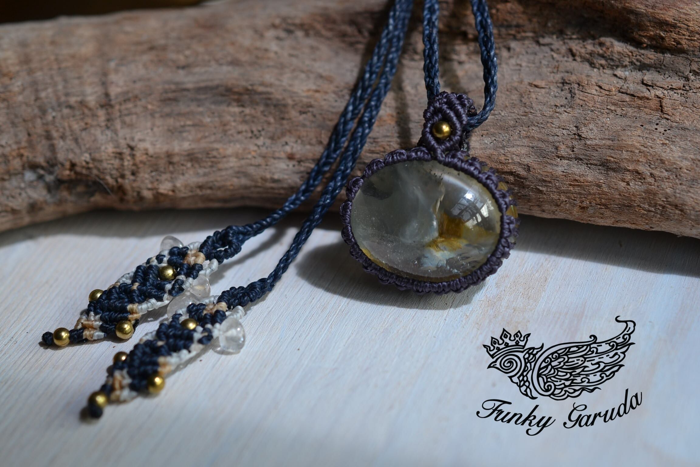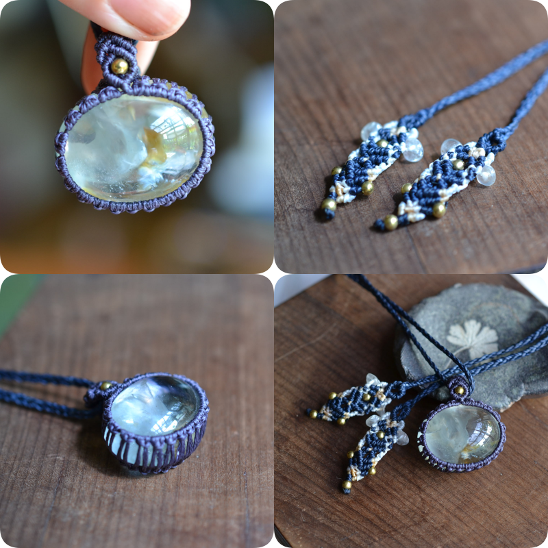 ネックレスを装着したときに、背守りとなる紐の先のエンド部分にはクリアクォーツビーズと真鍮ビーズも一緒に編み込んでマクラメ編み装飾を施しました。