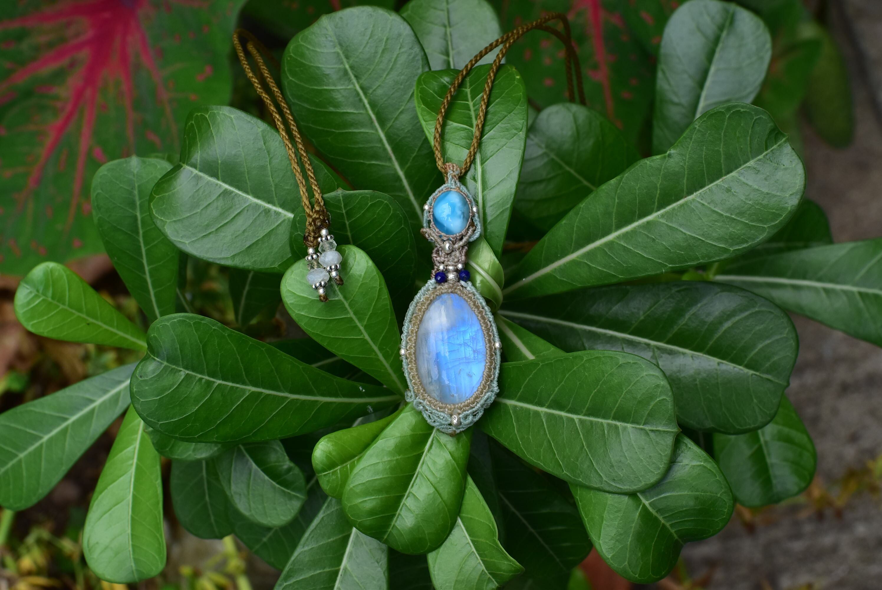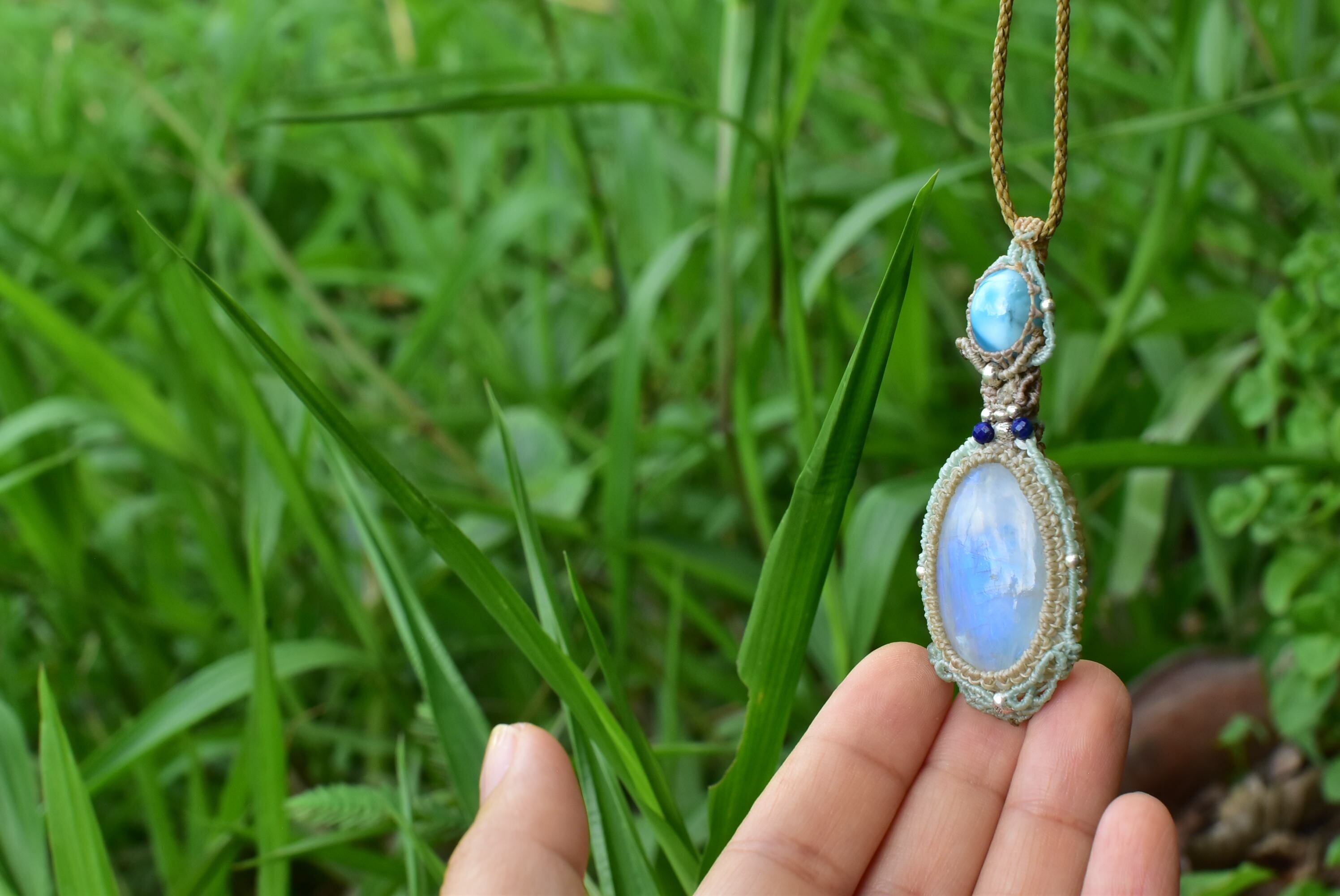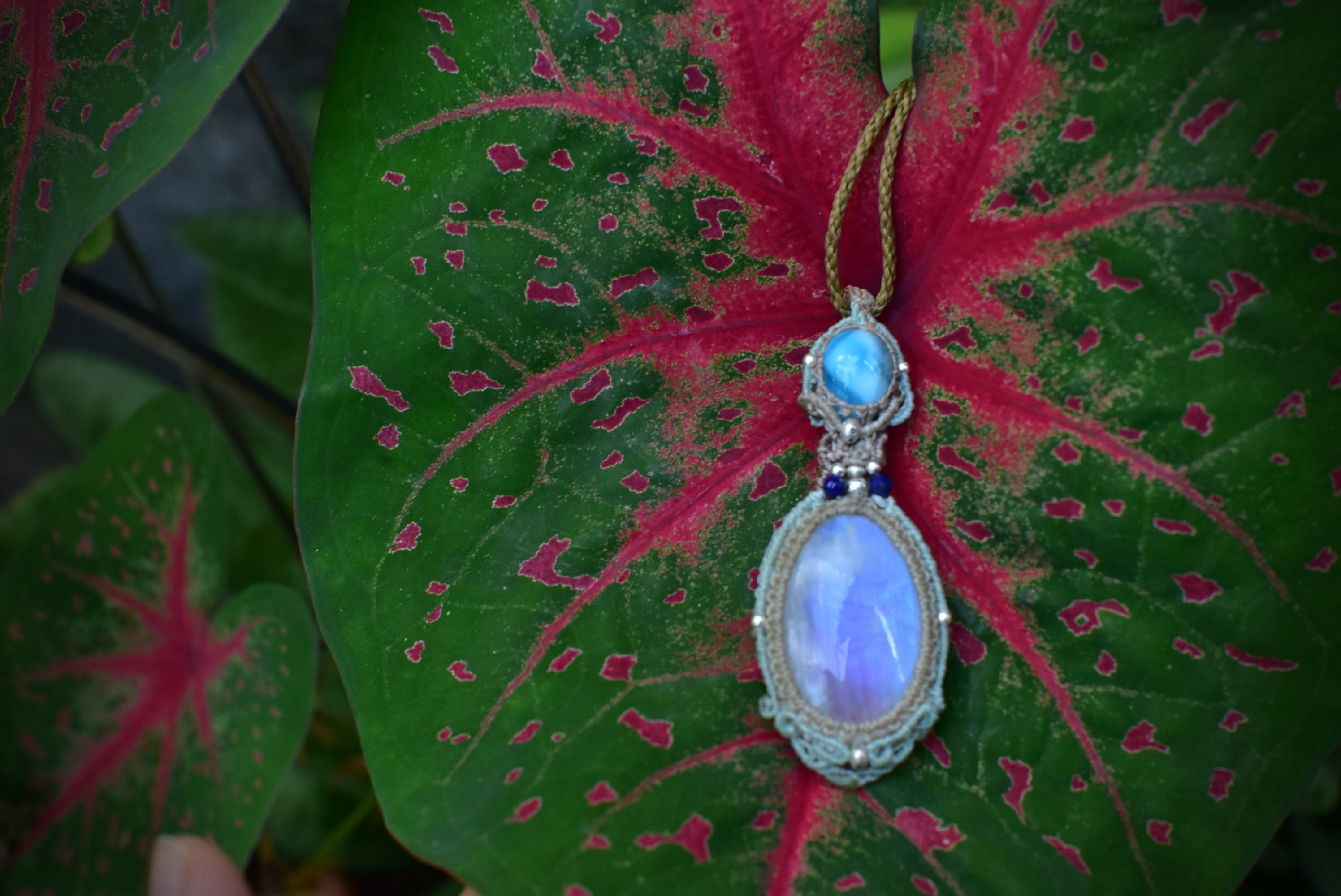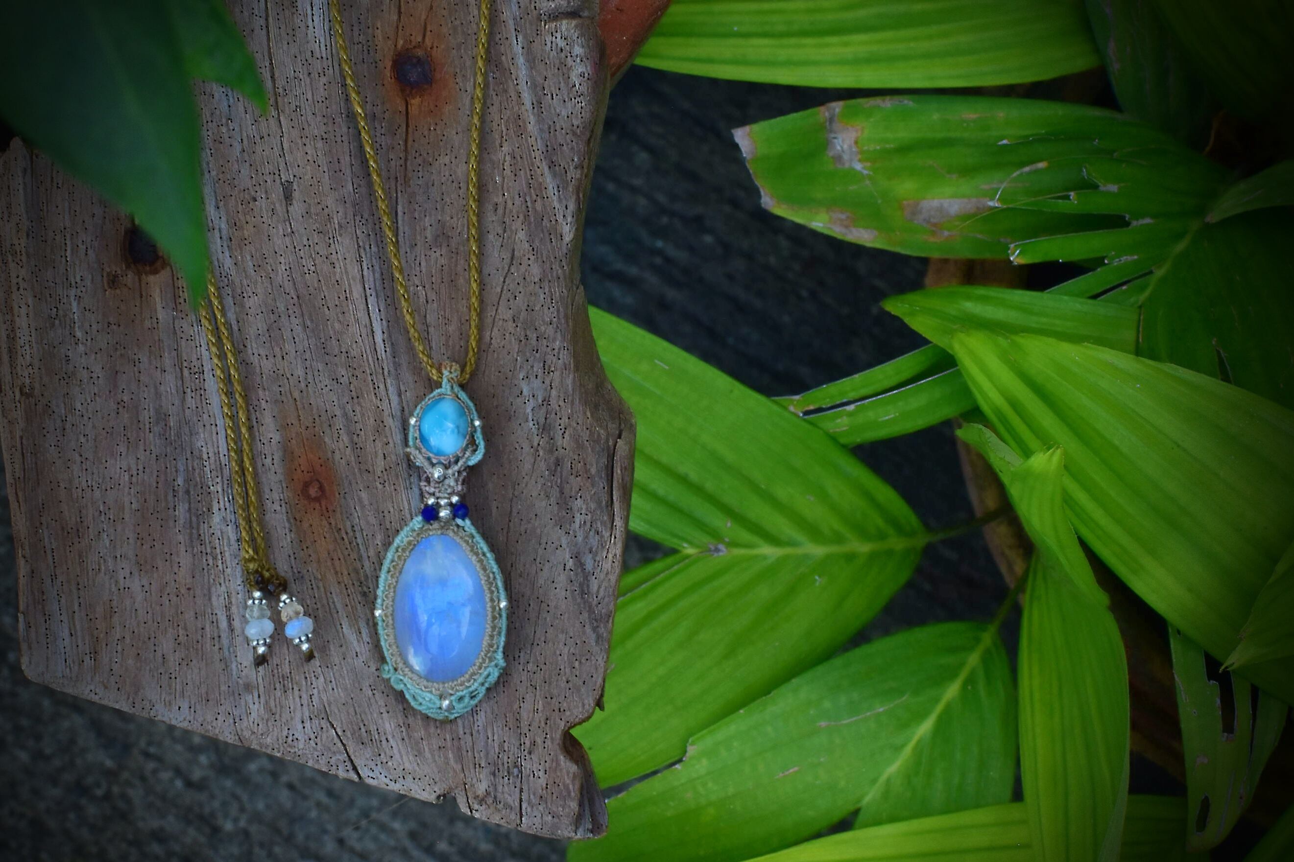 波と月★高品質★ラリマーとブルームーンストーン マクラメペンダントlari037