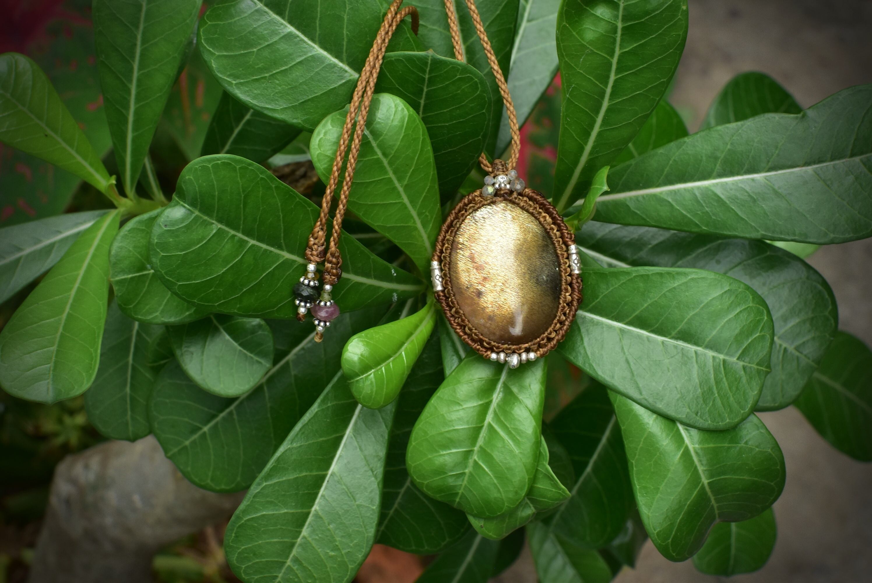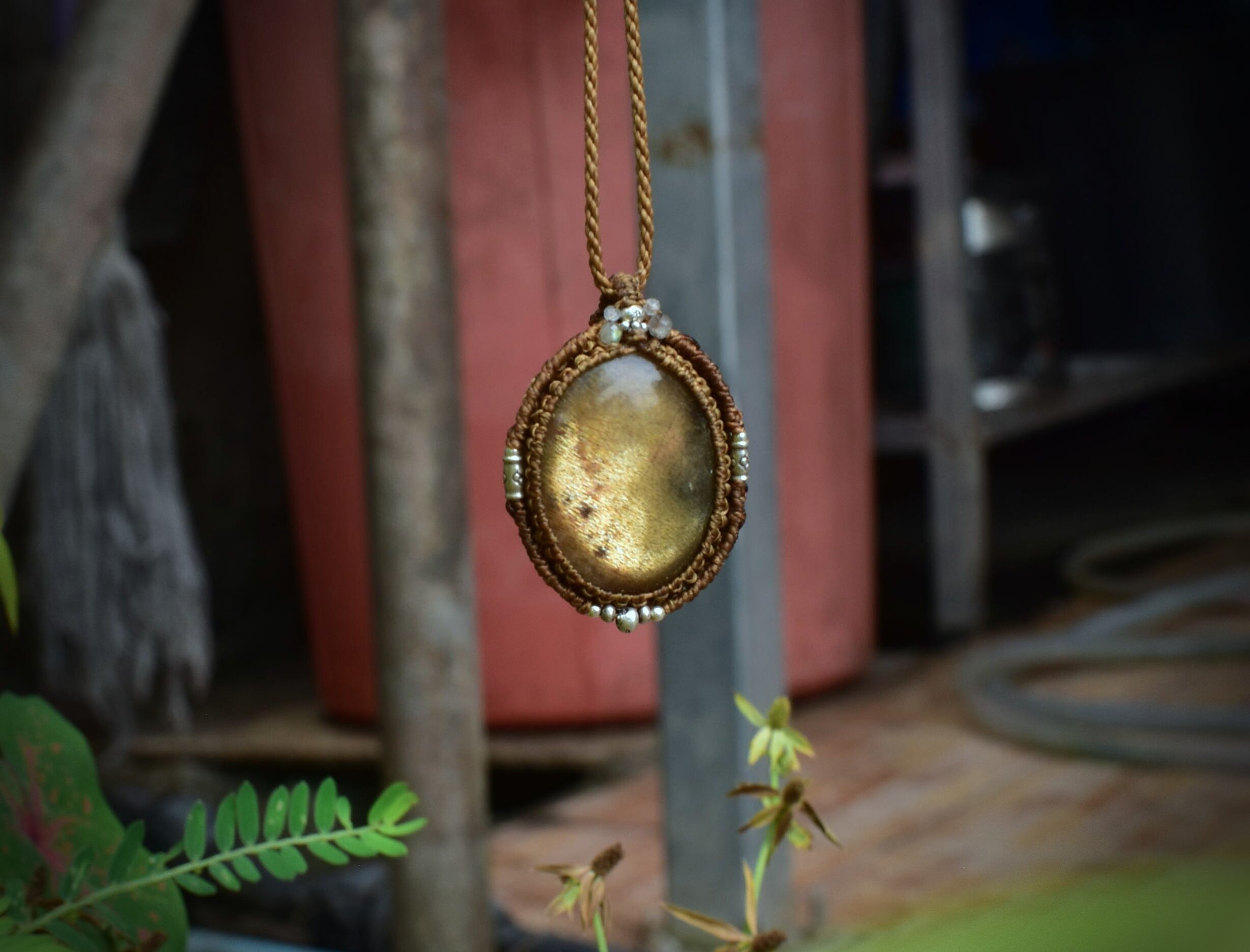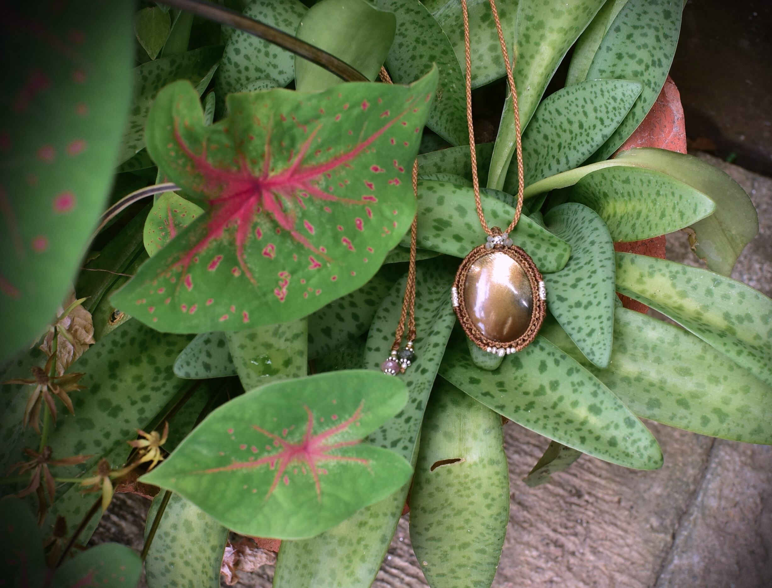 高貴なゴールドシラーを見ることができる大きなゴールデンサンストーンをこのたび手に入れることができましたのでシンプルにマクラメペンダントに仕上げました。