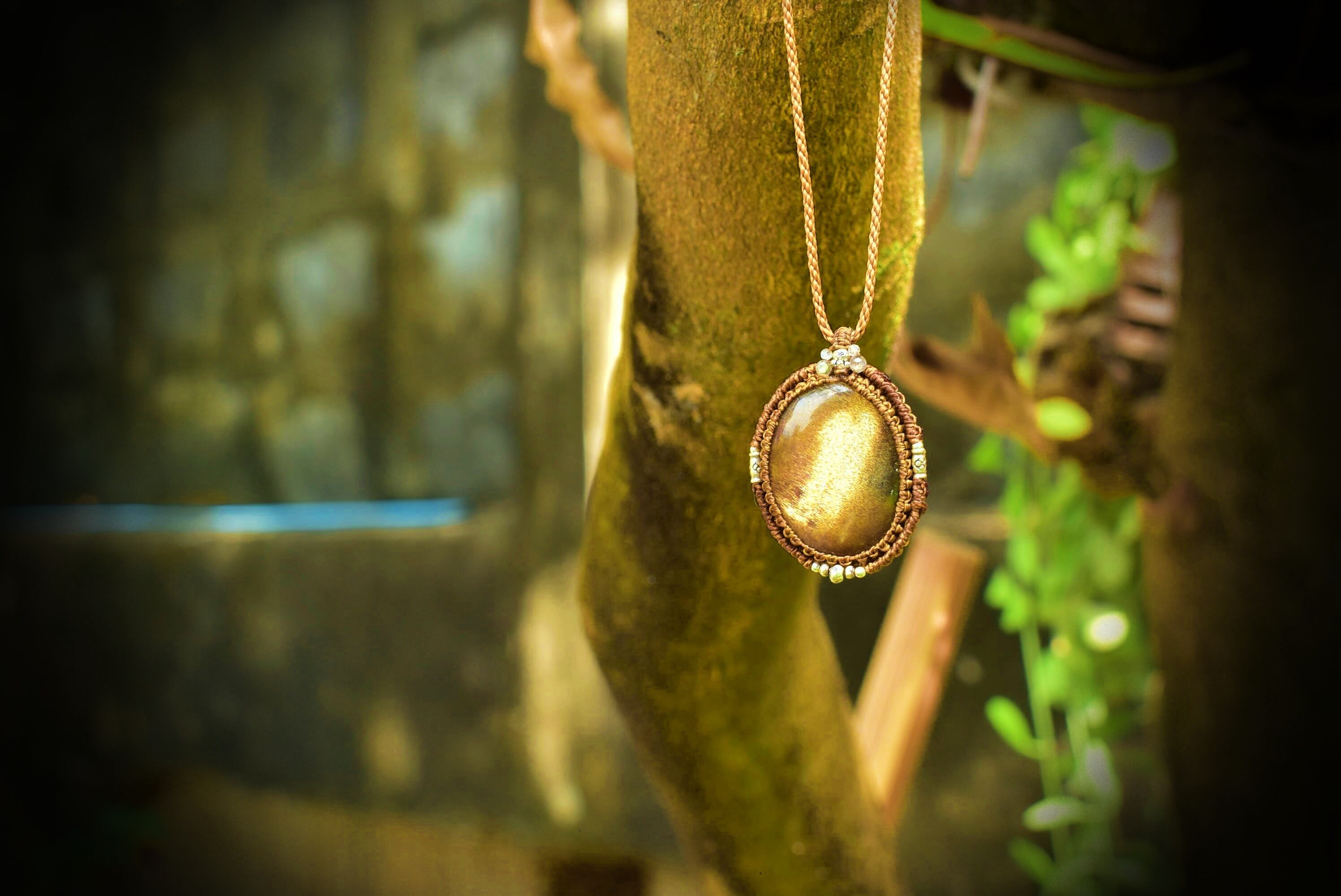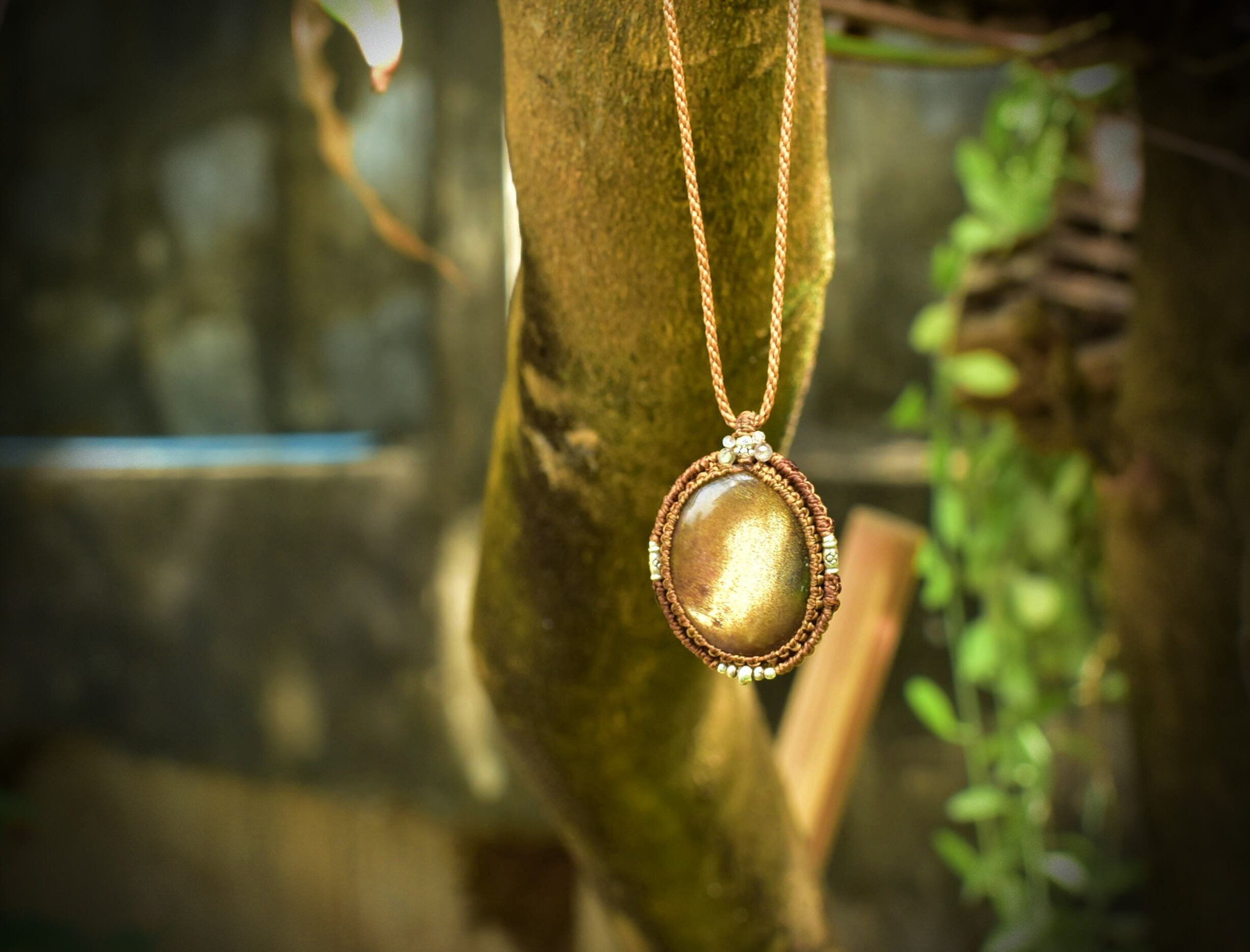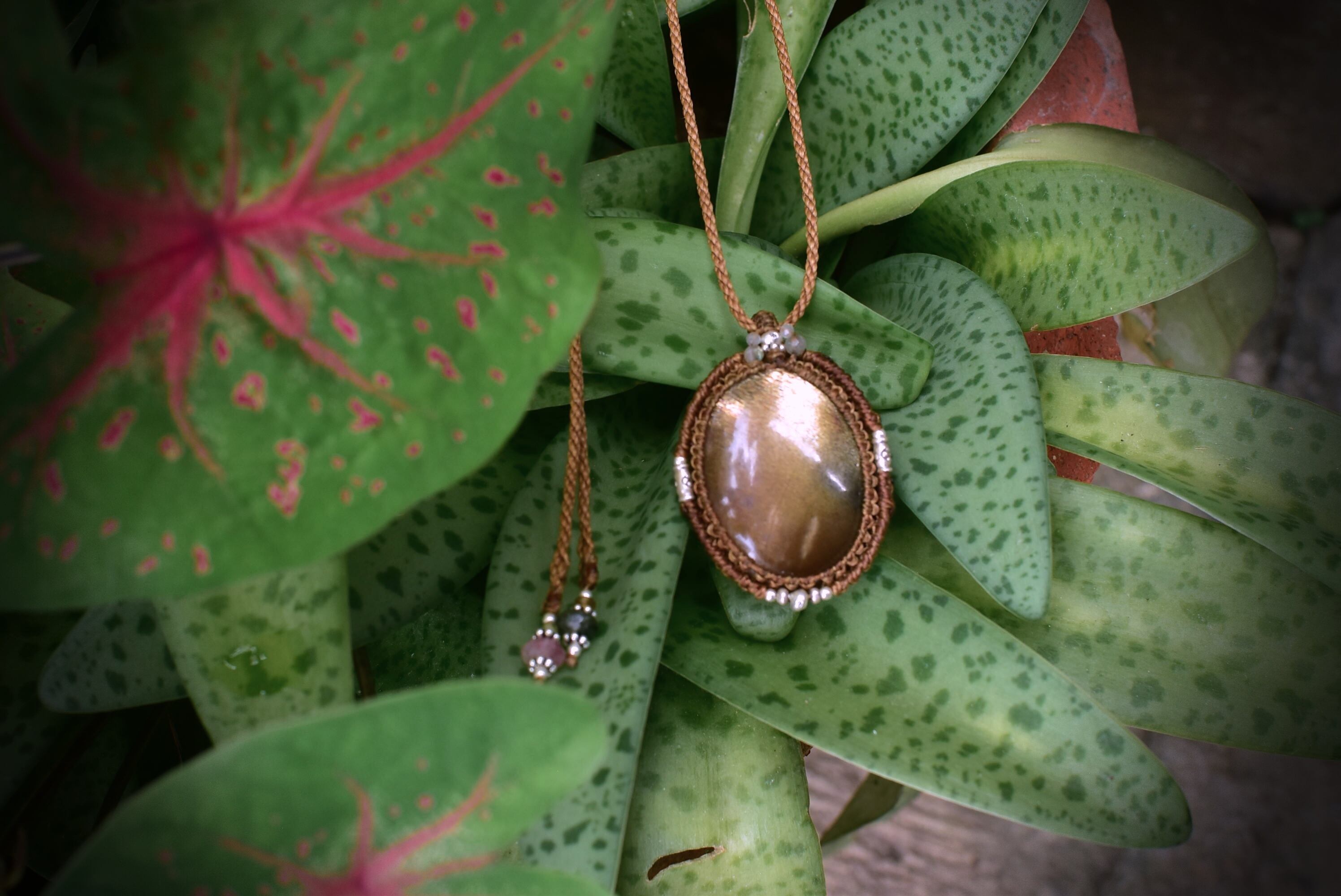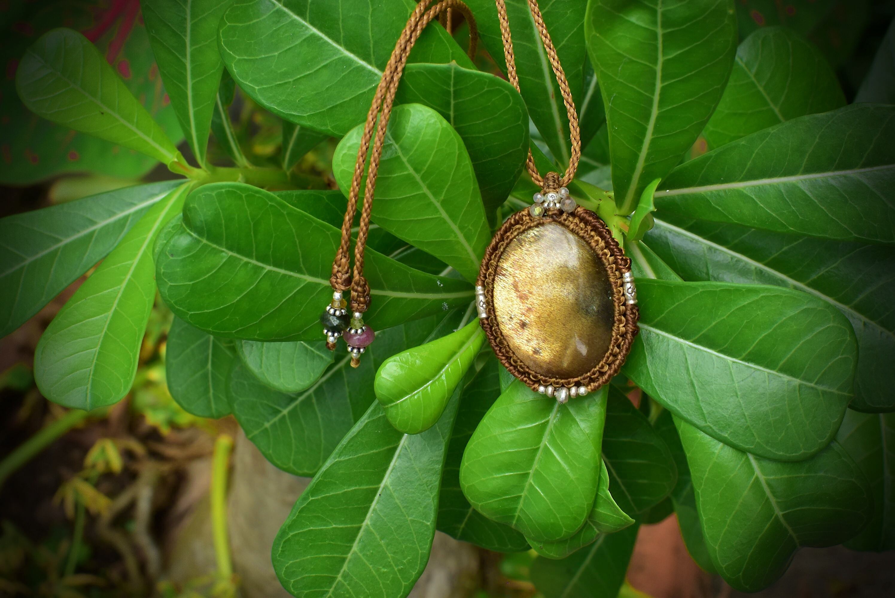 高貴なゴールドシラーを見ることができる大きなゴールデンサンストーンをこのたび手に入れることができましたのでシンプルにマクラメペンダントに仕上げました。