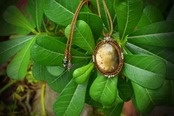 ◆このたびはゴールドブラウン色の蝋引き糸を使用しマクラメ編み装飾を施しました。
