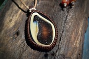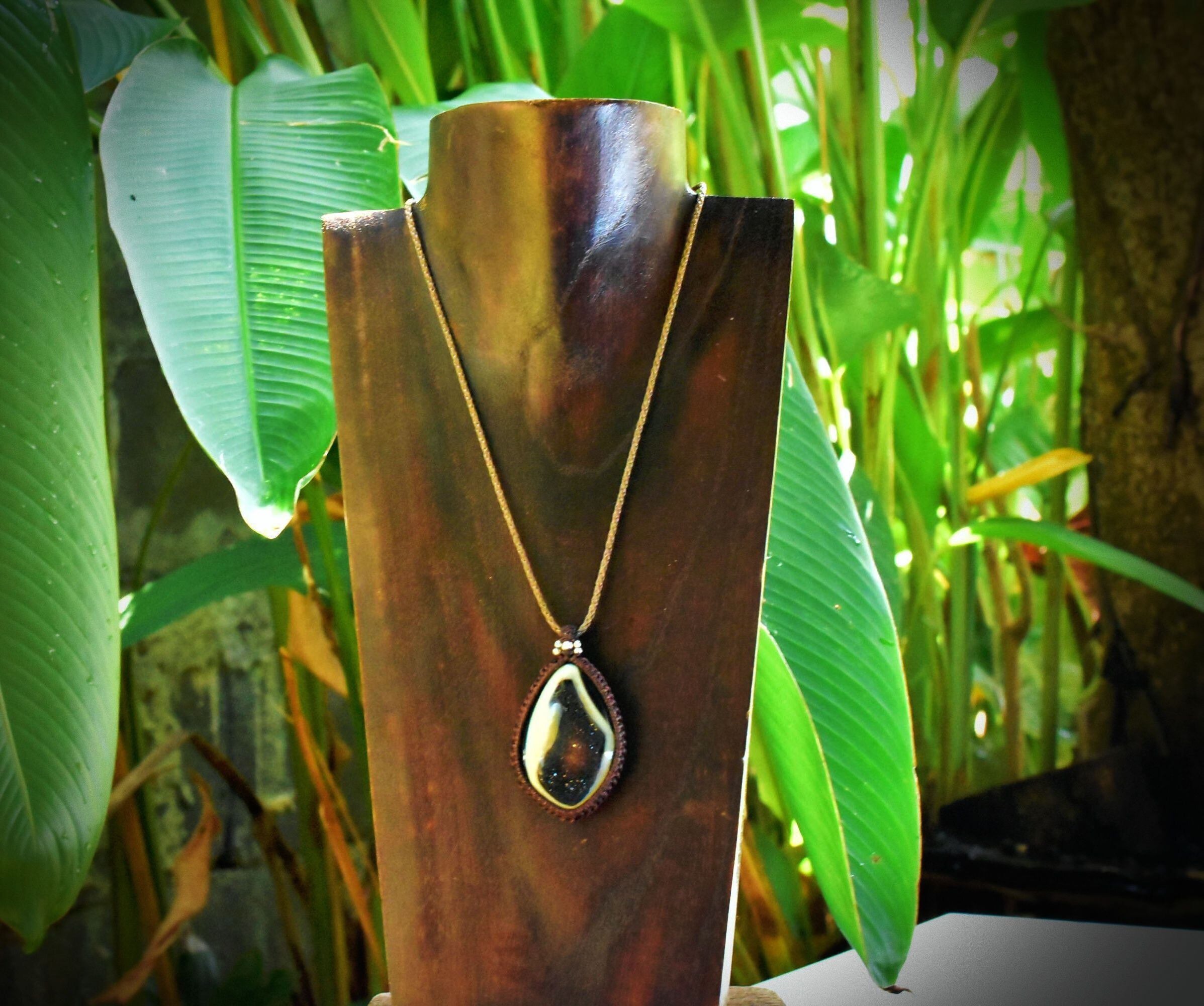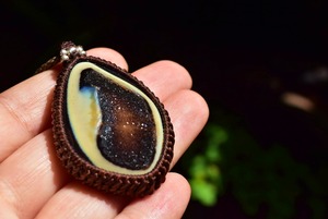 アゲートと同系色のブラウン色の蝋引き糸を使用して、シンプルにマクラメペンダントに仕上げました。