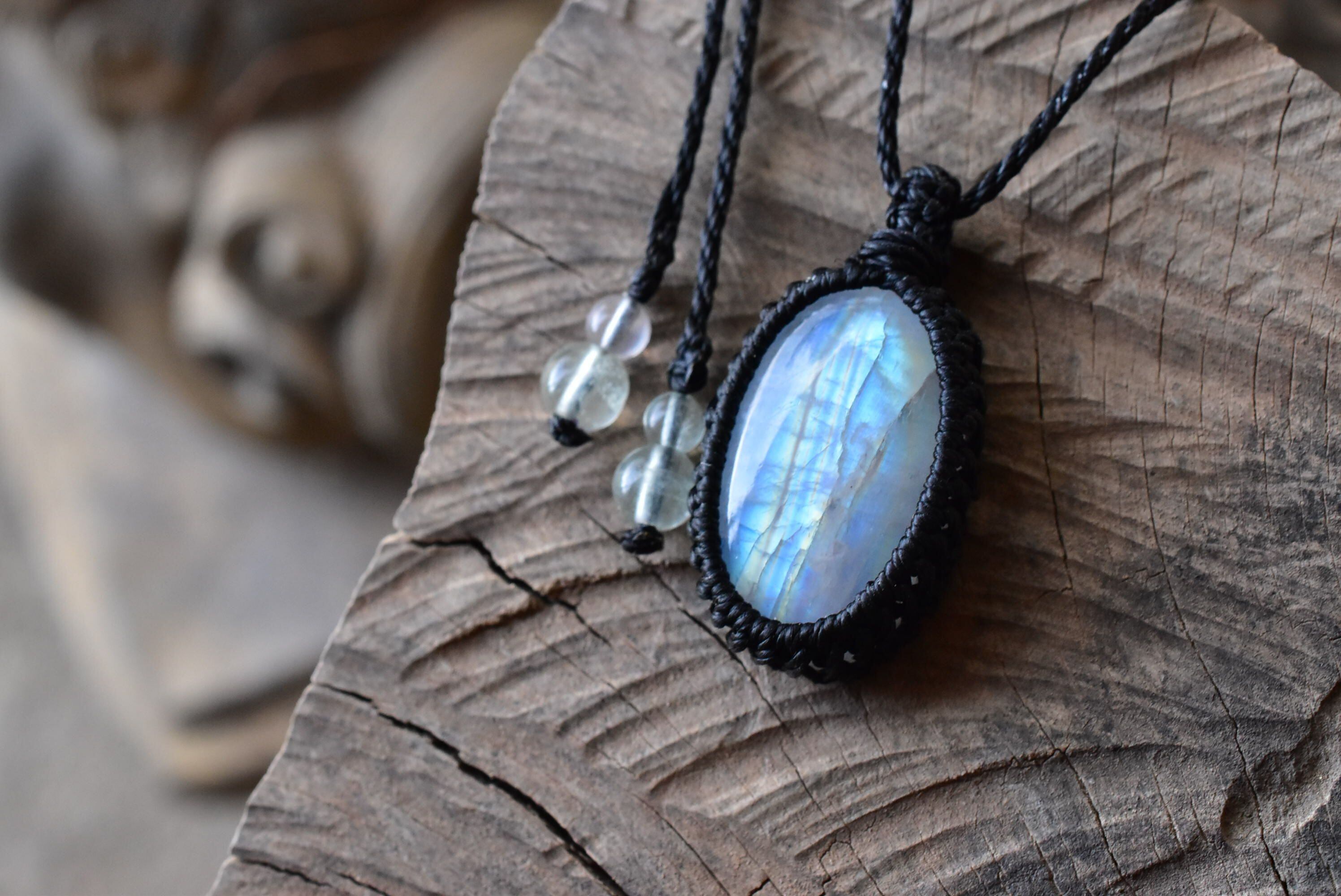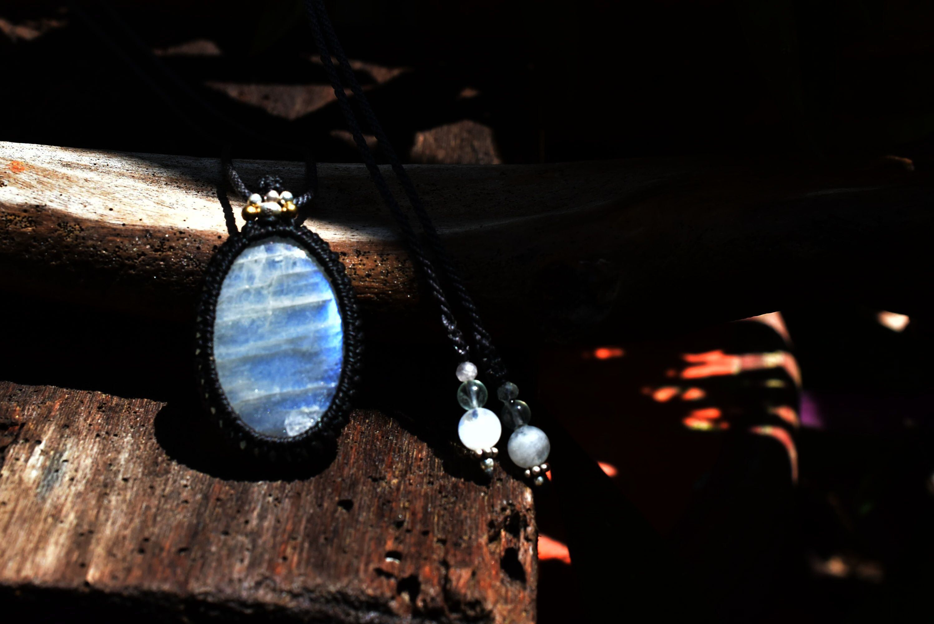 光を反射して、キラリと華やかなシラーが印象的な天然石をシンプルにマクラメペンダントに仕上げました。