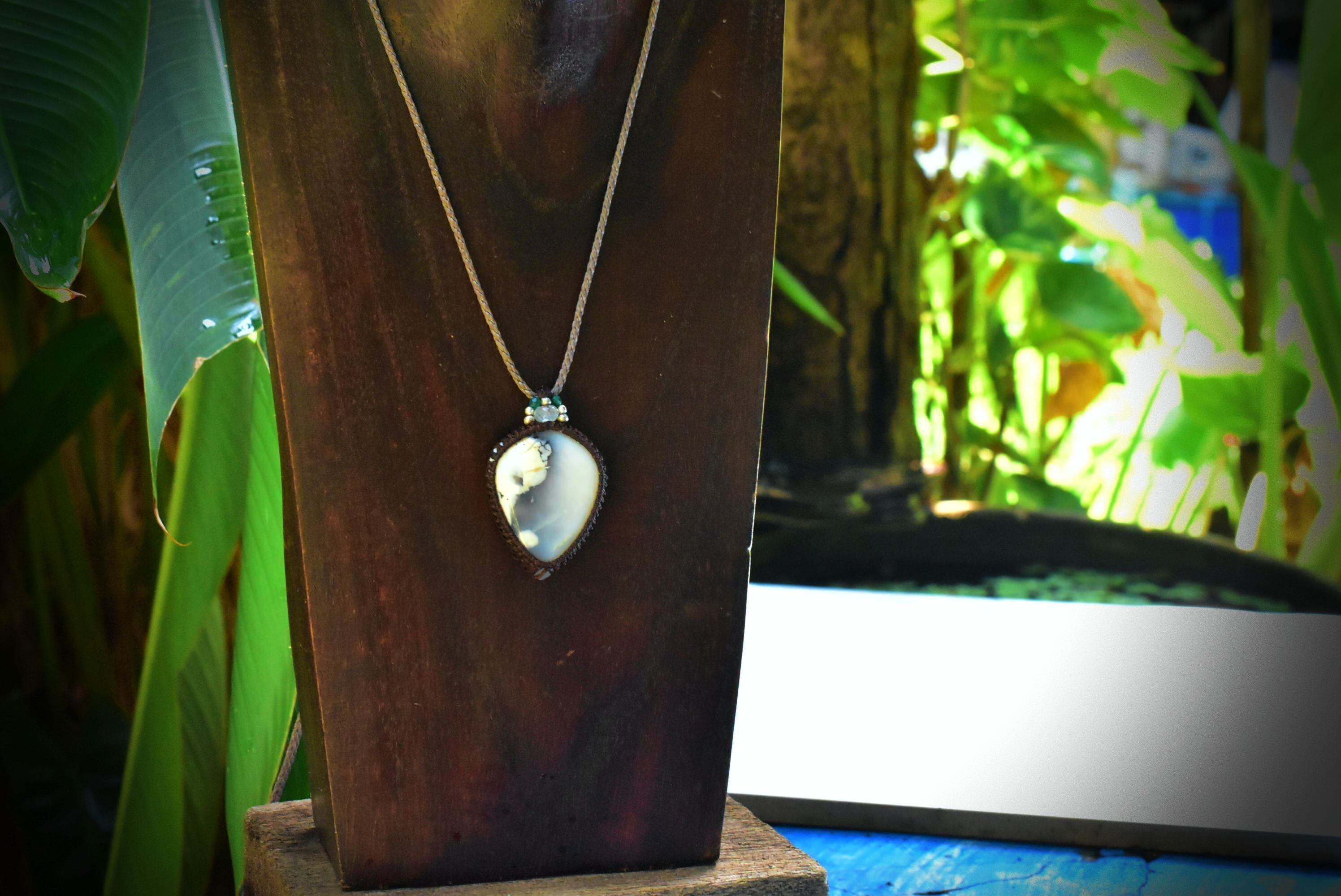 ◆このたびはコーヒーブラウン、ダブグレイ色の蝋引き糸を使用しマクラメ編み装飾を施しました。