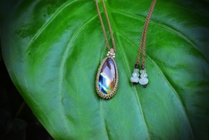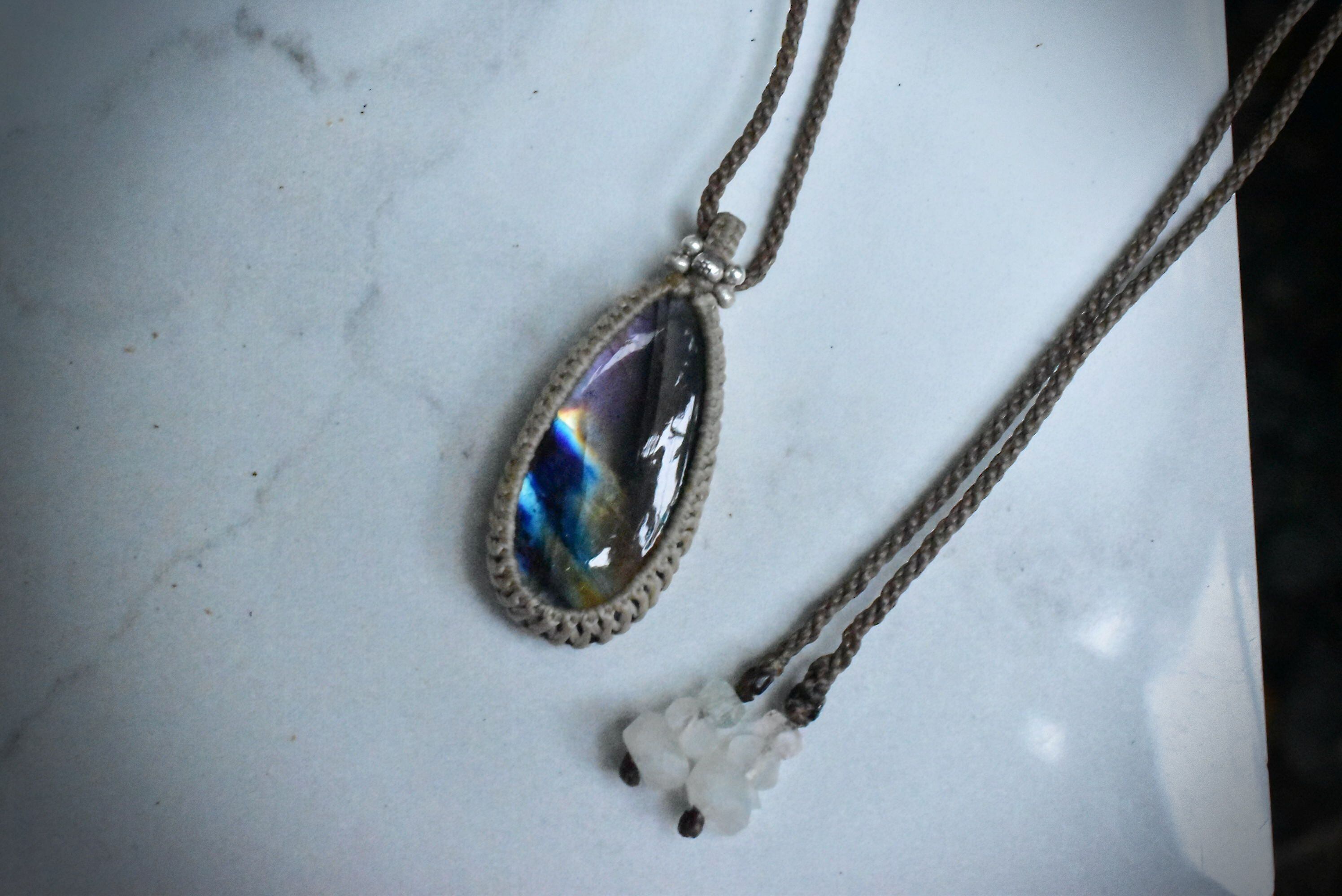 透明感あるレアなパープルのラブラドライトに、ブルー、イエロー、オレンジとグラデーション模様が流れるようにくっきり入った天然石