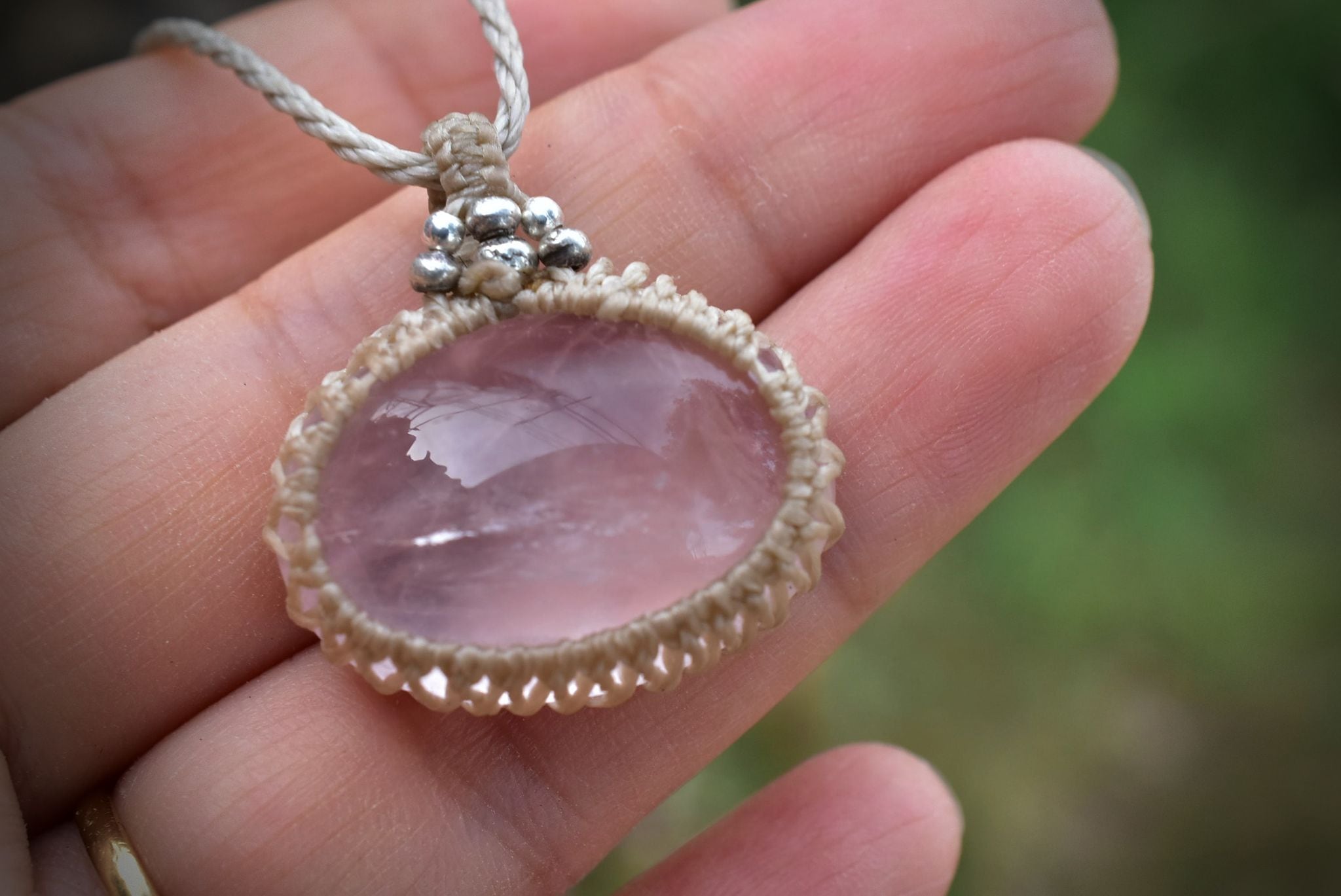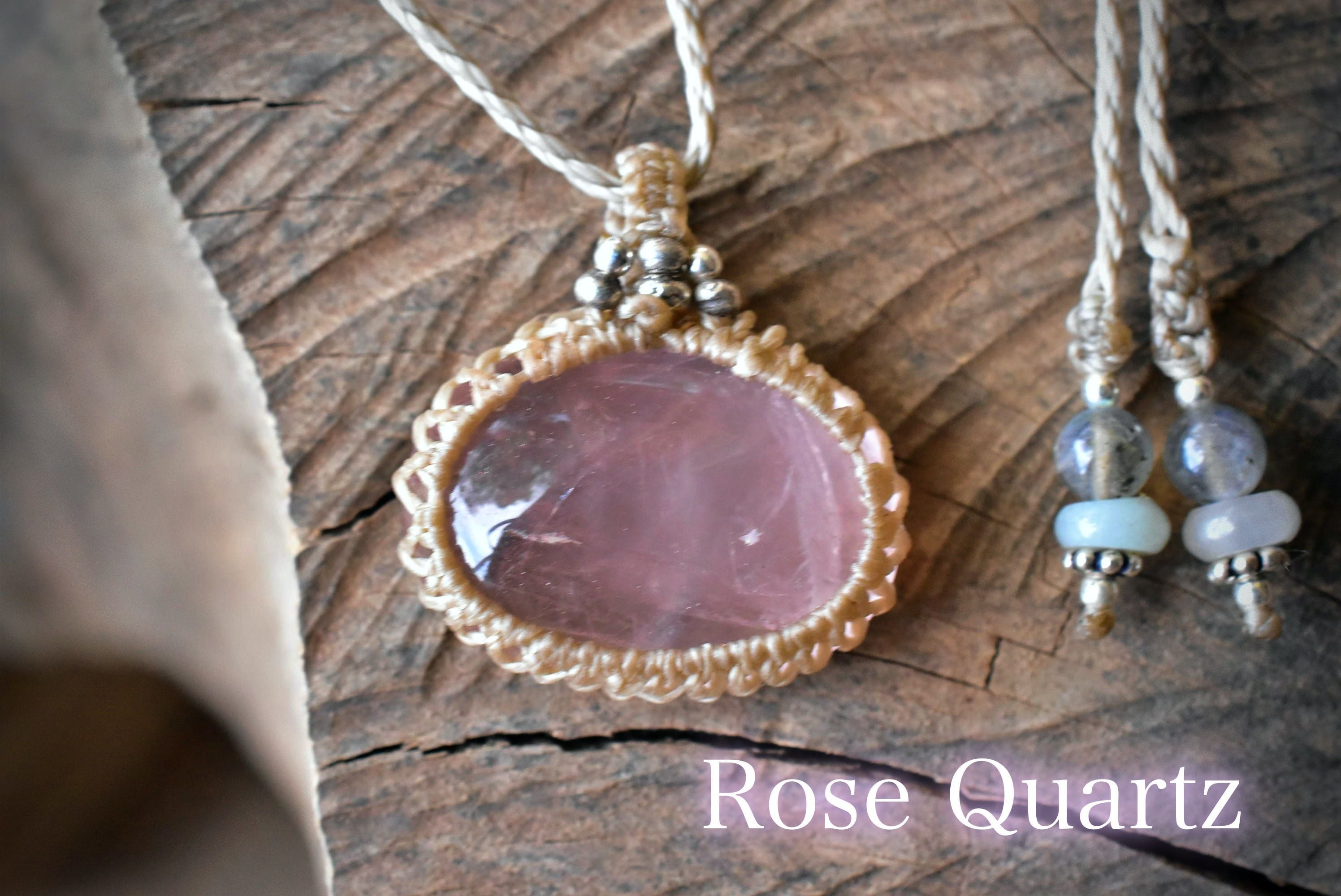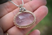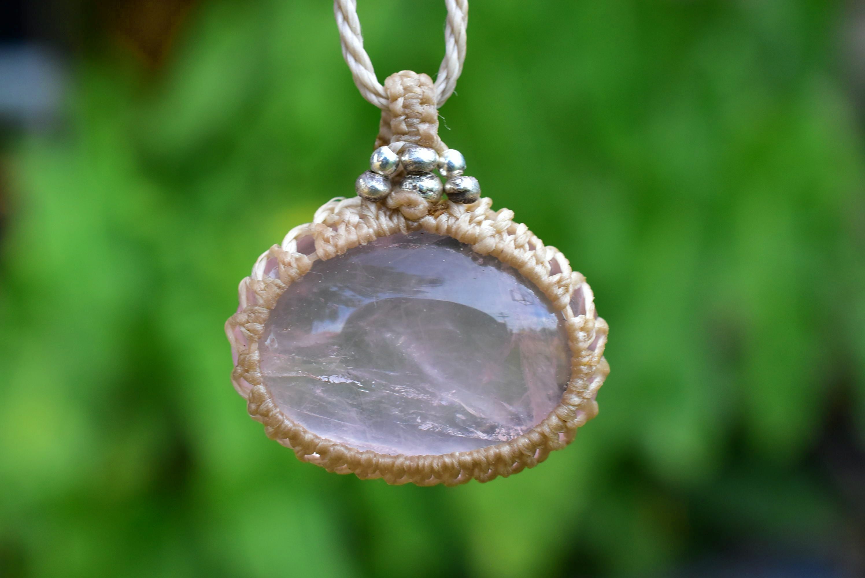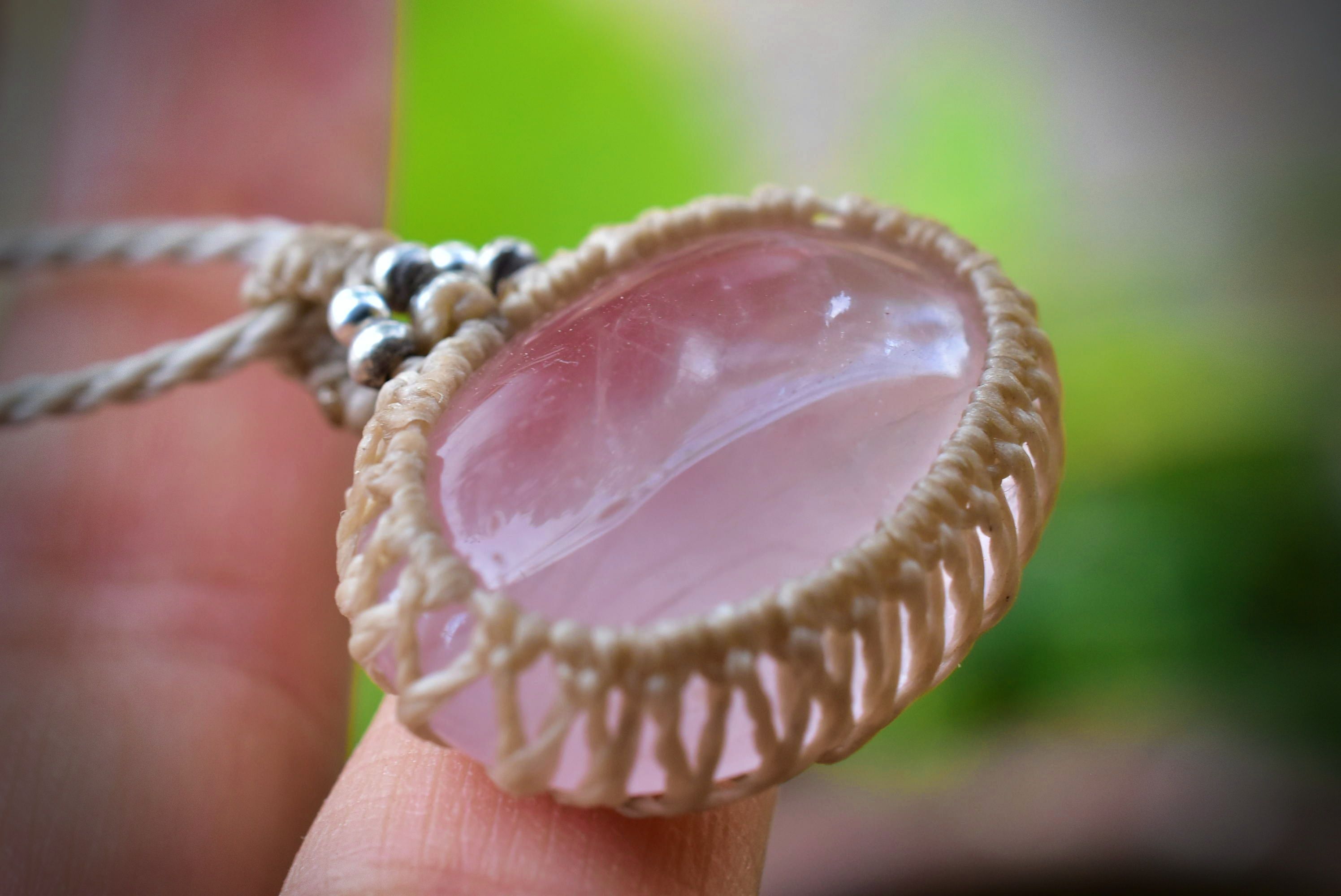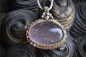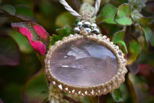 ローズクォーツの優しい雰囲気を生かしたマクラメペンダントに仕上げました。
