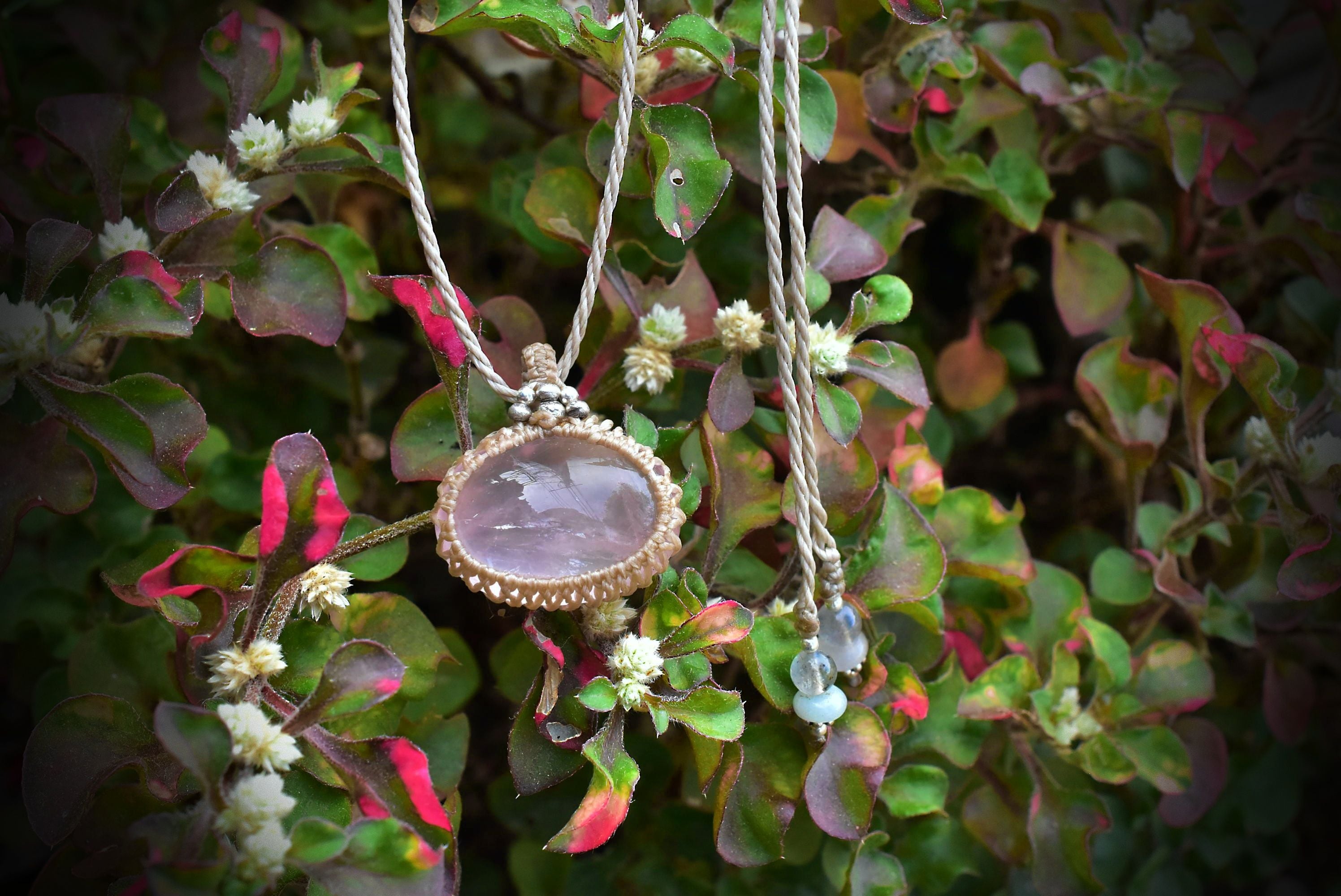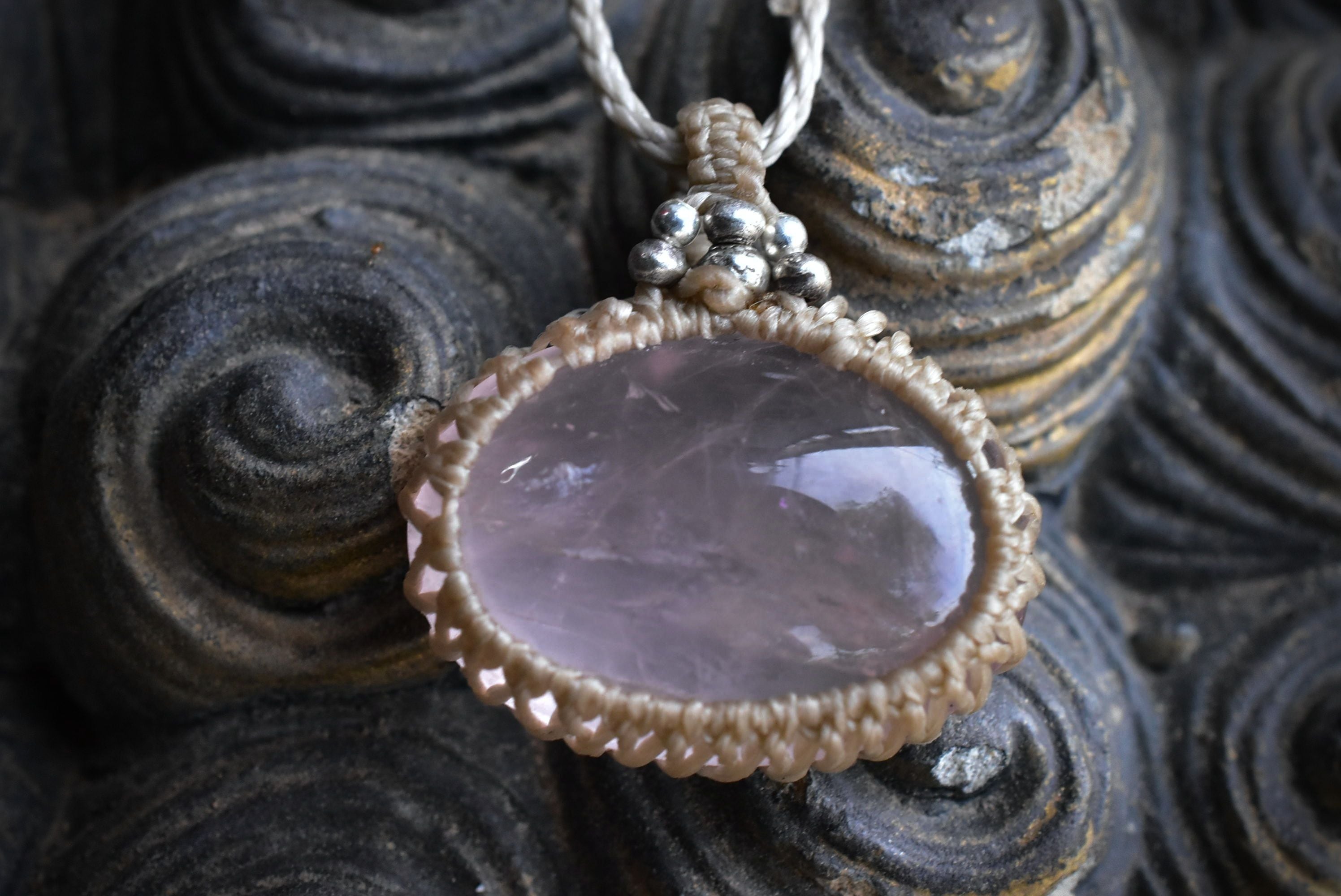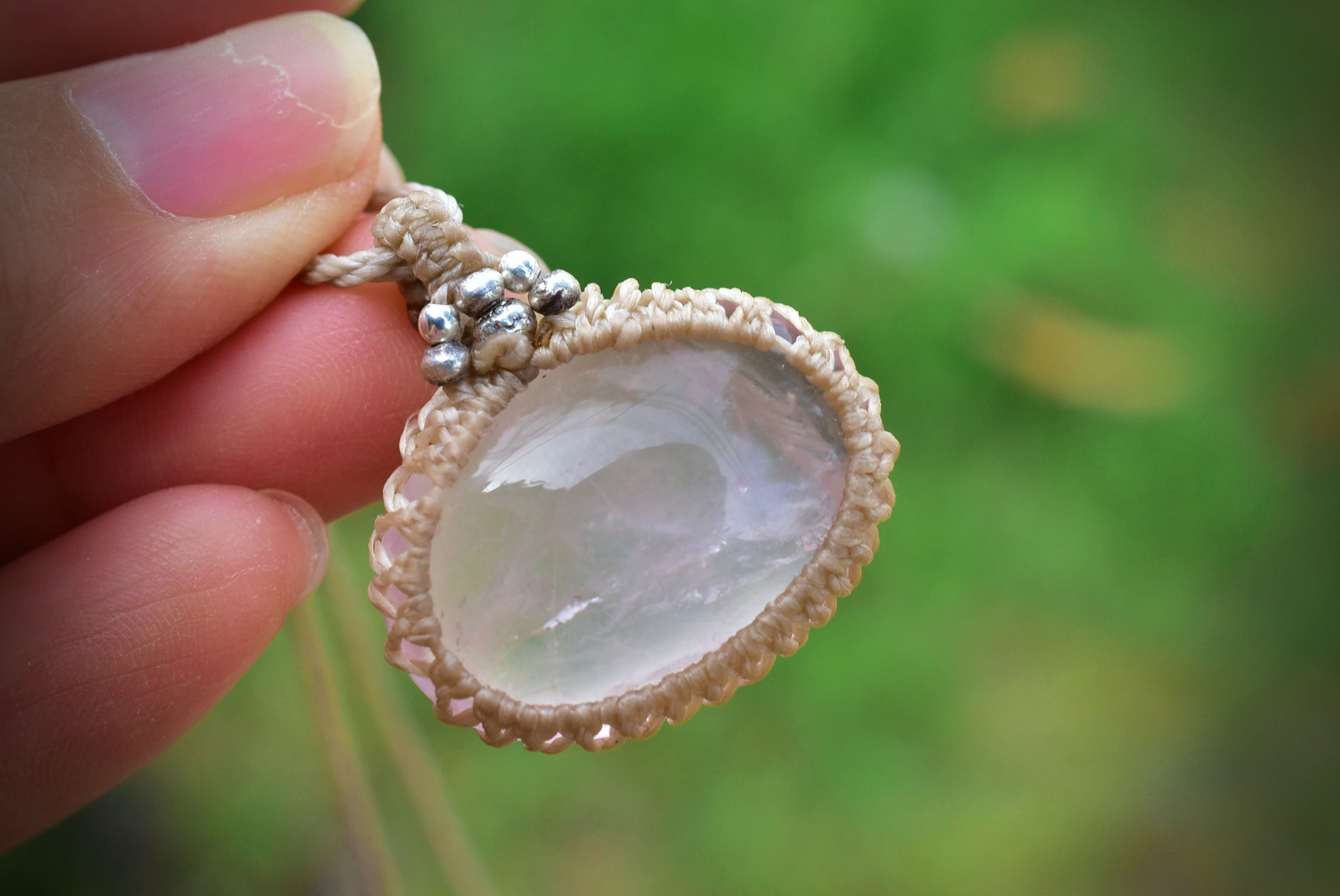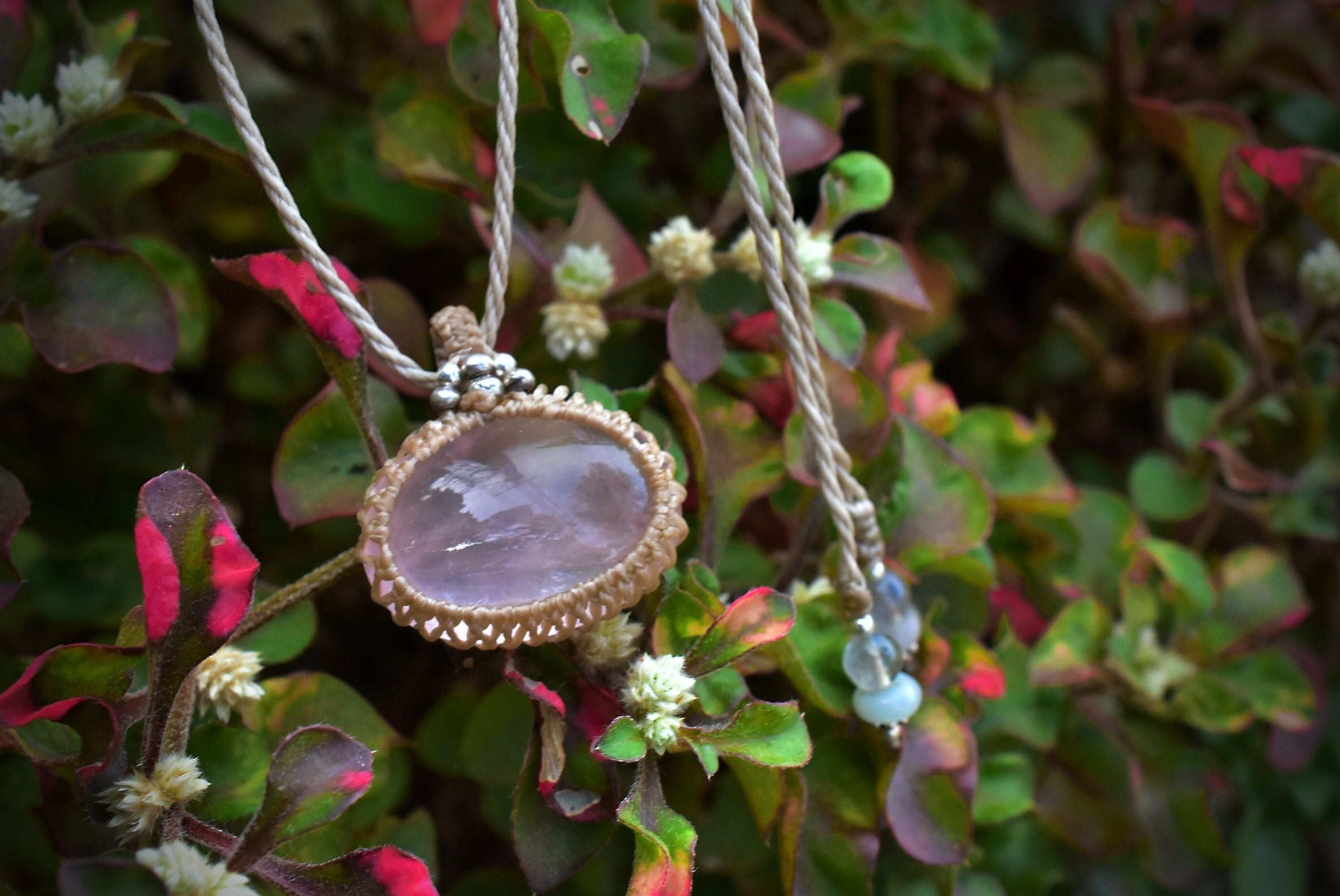 ローズクォーツの優しい雰囲気を生かしたマクラメペンダントに仕上げました。