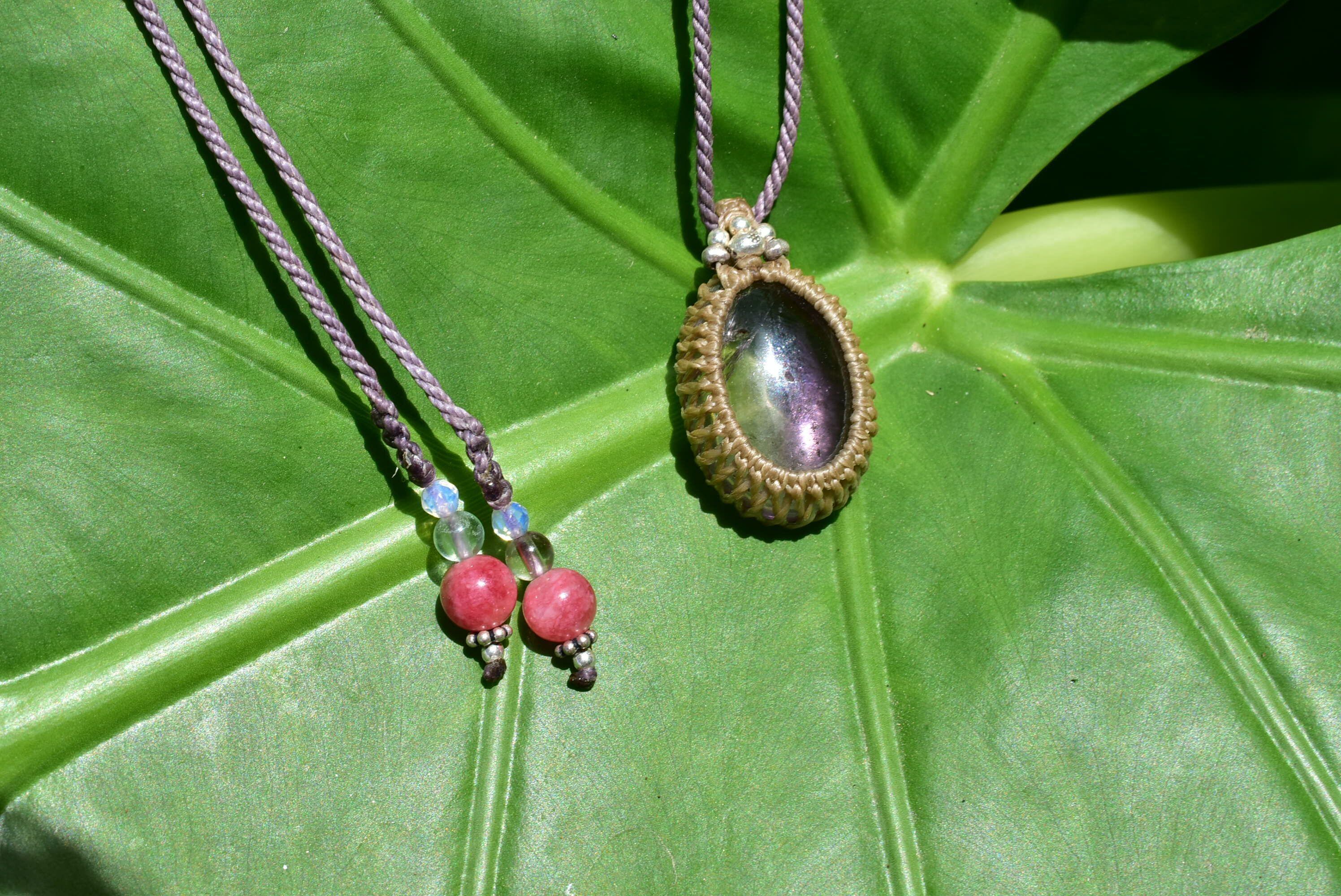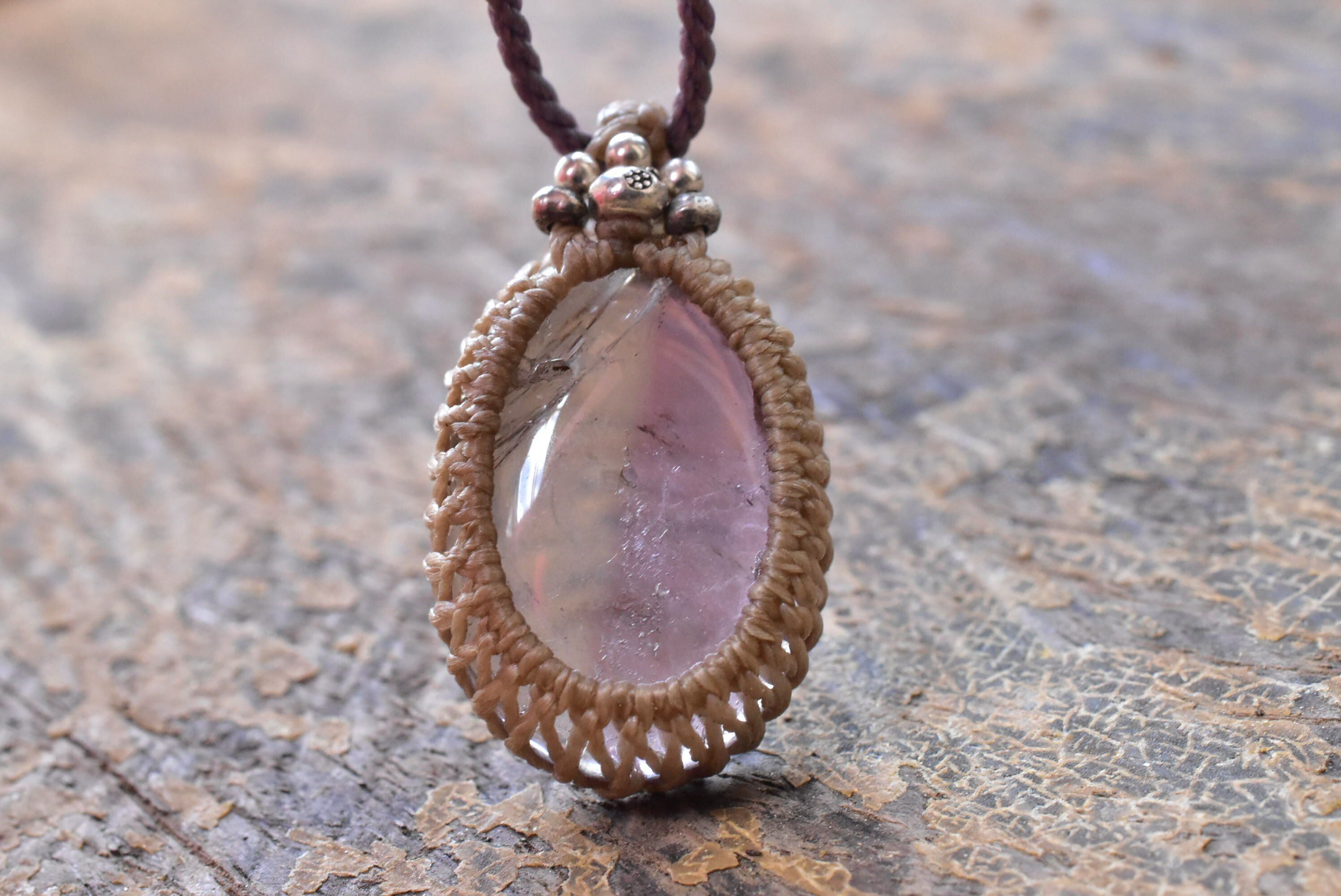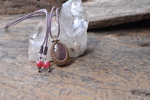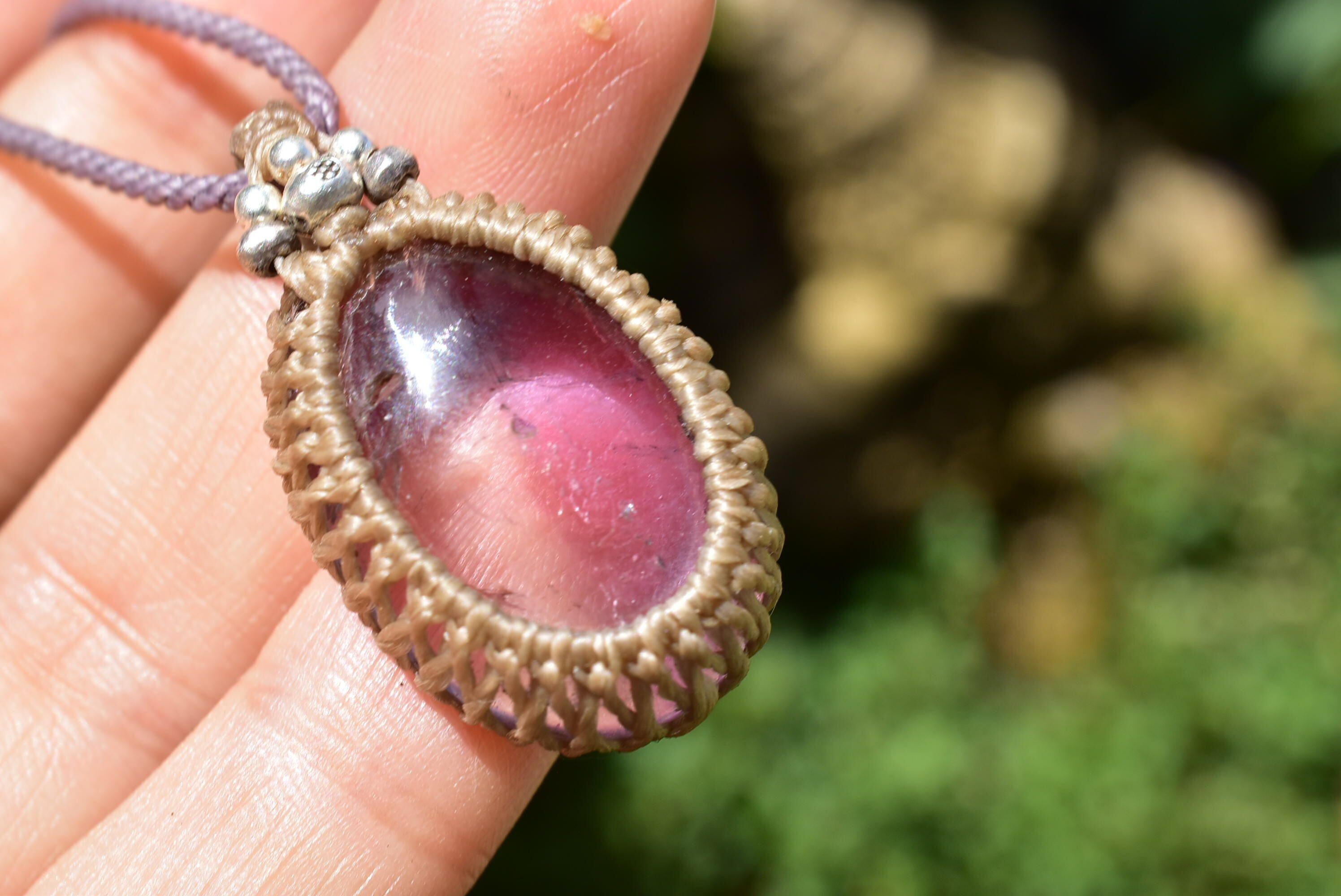 アメジストとシトリン部分が分かれたモダンなバイカラー水晶をシンプルなマクラメペンダントに仕上げました。