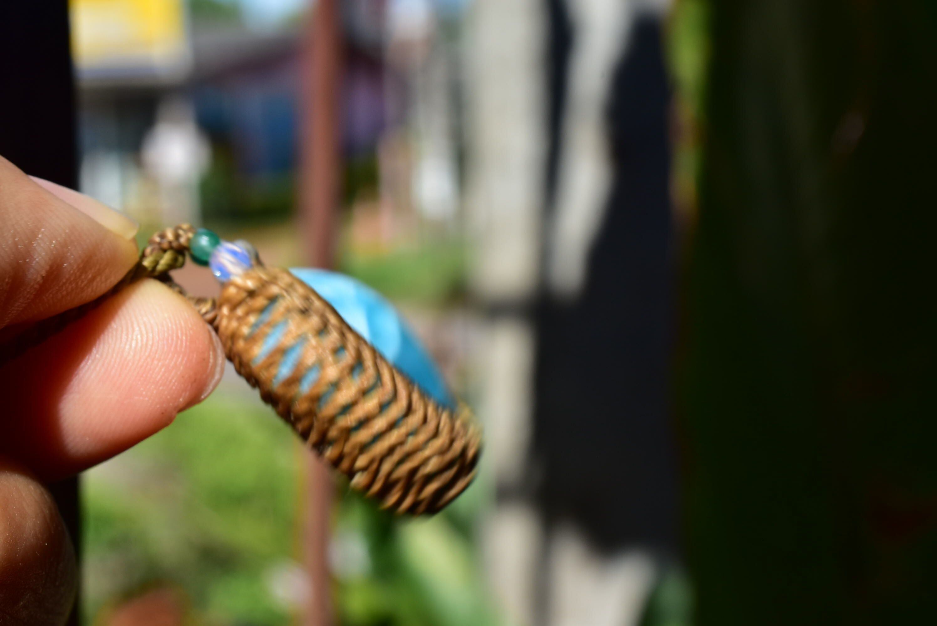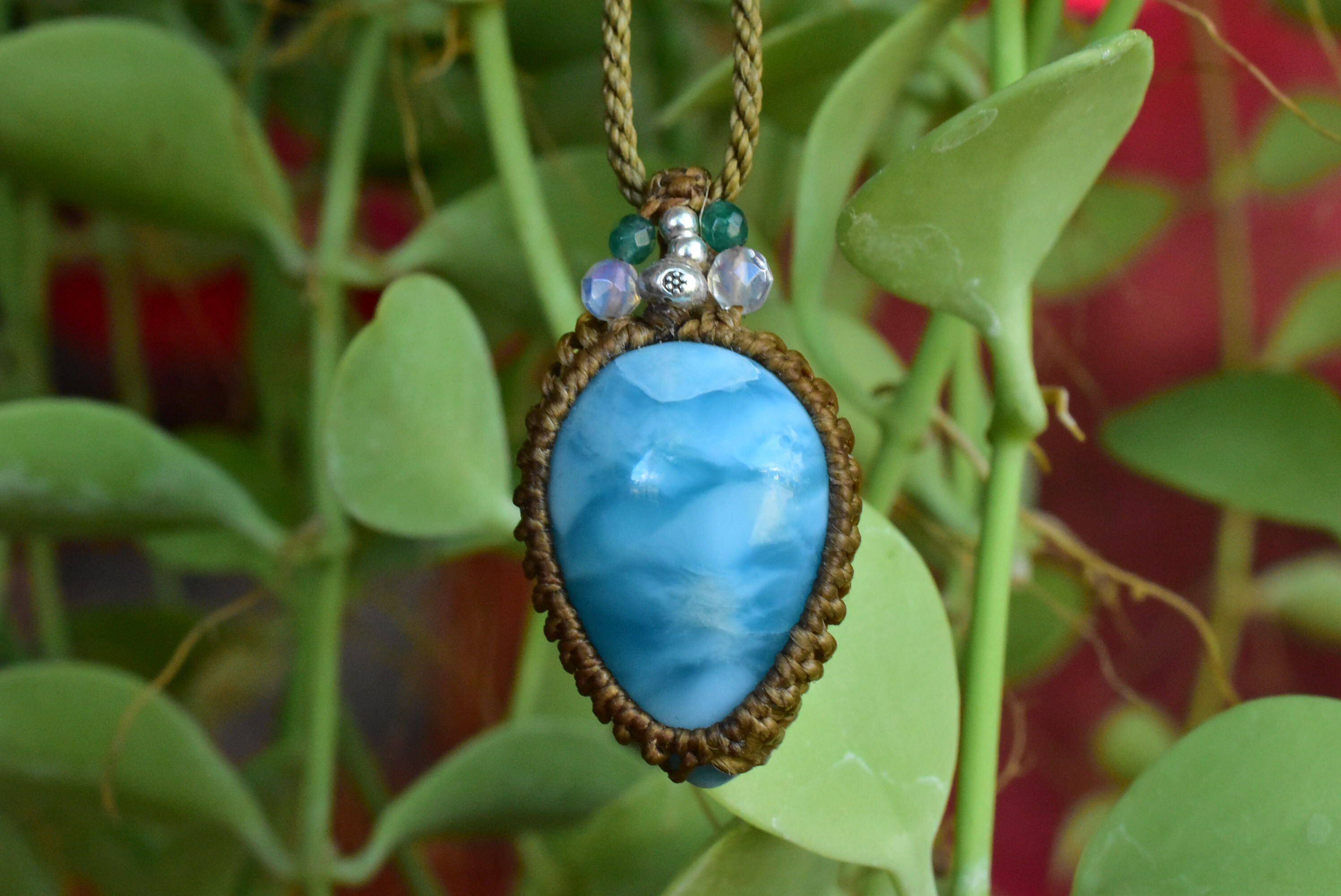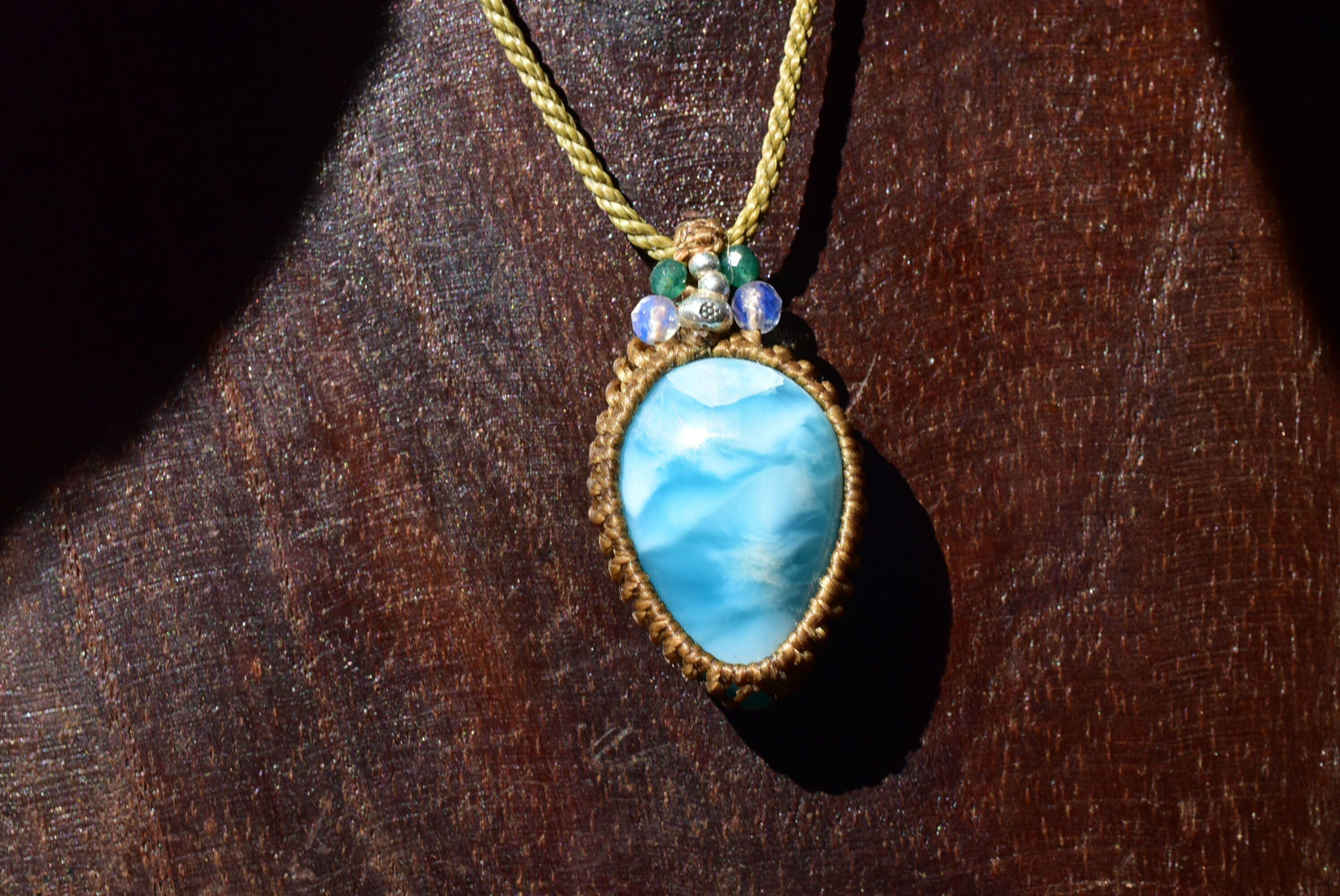 このたび、青く透き通る穏やかな波模様がイメージされるラリマーをシンプルなマクラメペンダントに仕上げました。ディープなブルーカラーはラリマーの品質が良い証です。