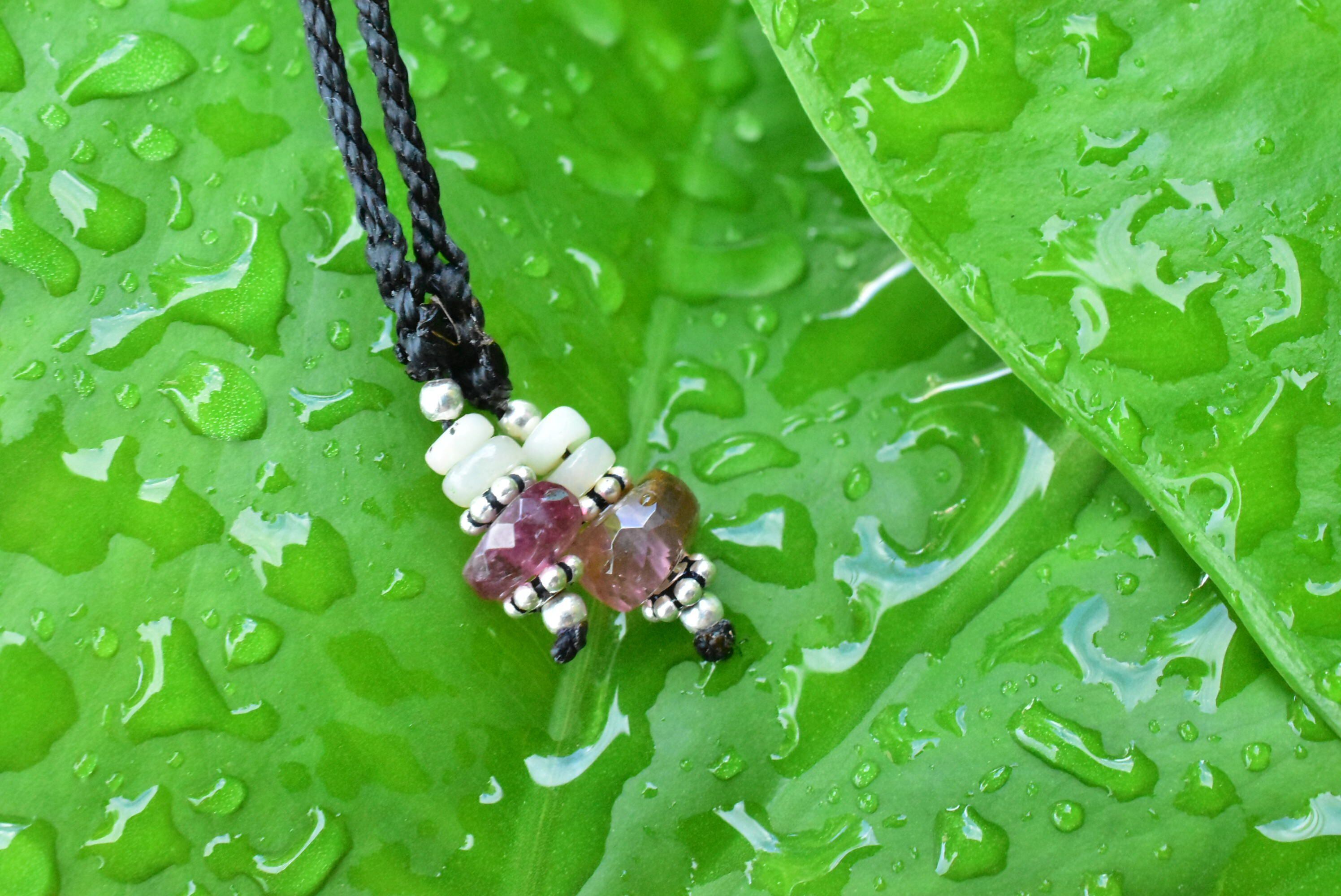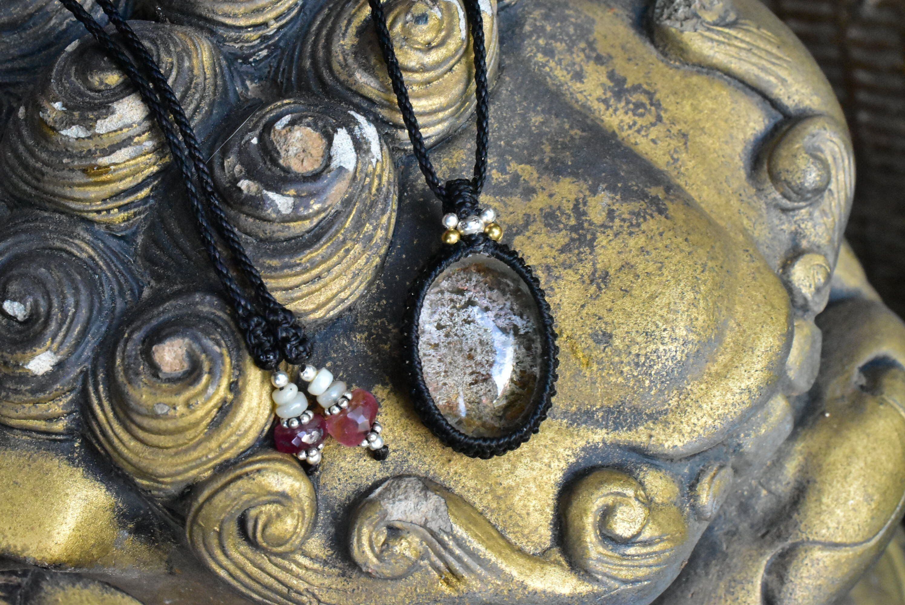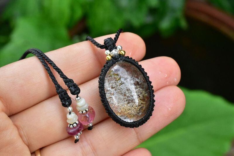 水晶の優しい世界が引き立つように、シンプルなマクラメ編みペンダントに仕上げました。