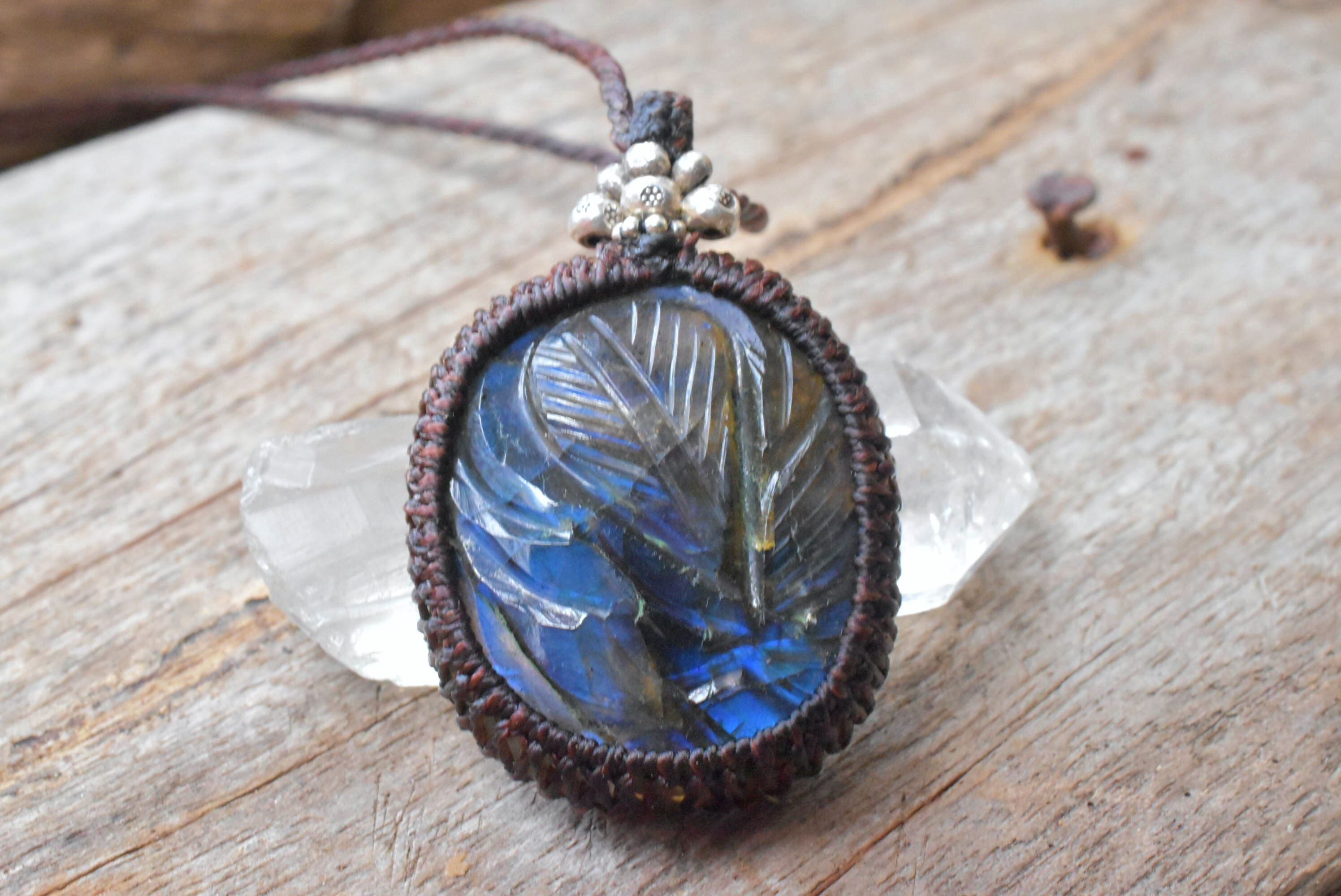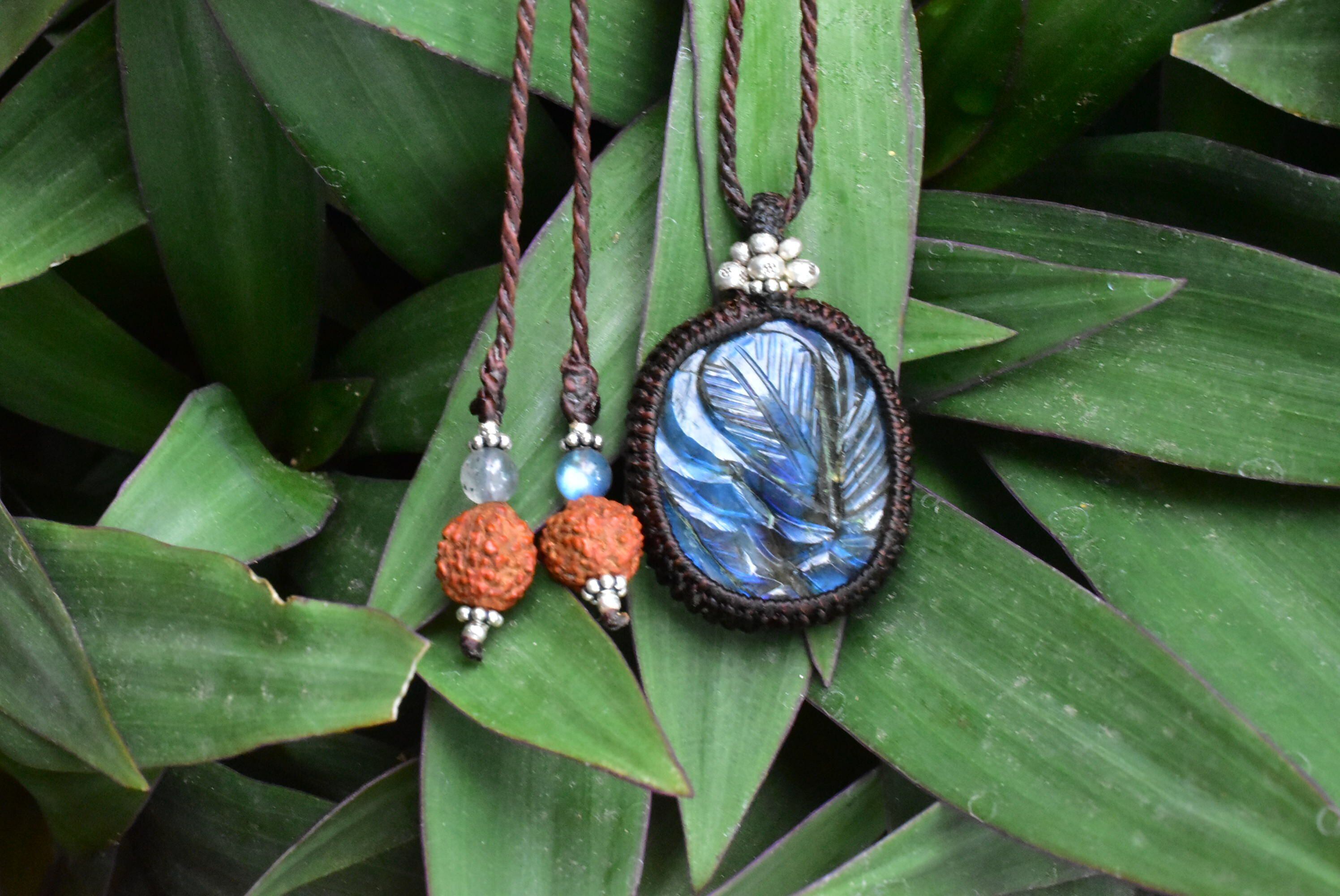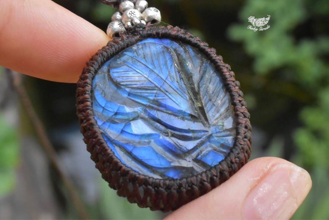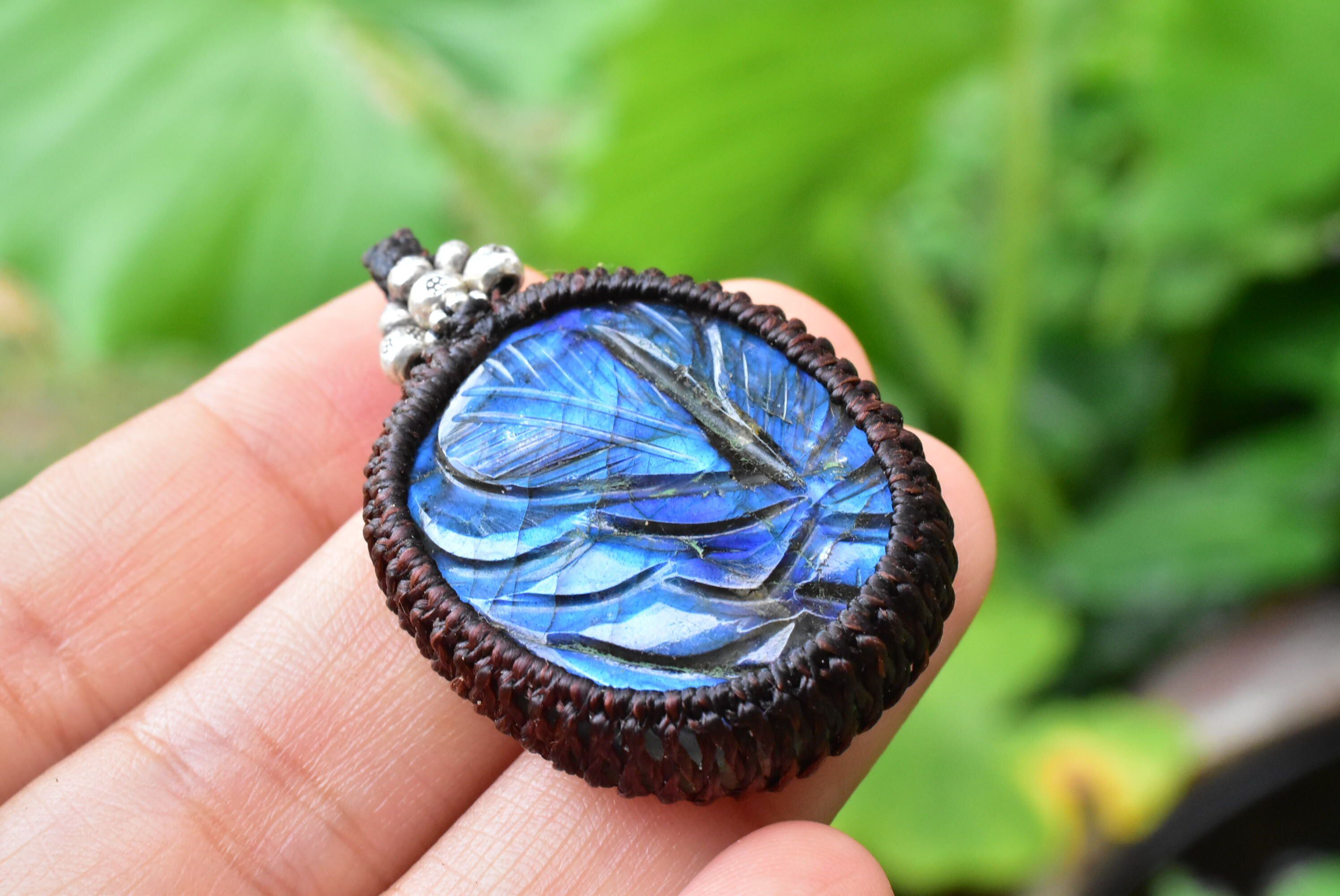 青藍色の草木★カービング★ラブラドライト マクラメペンダントlay005