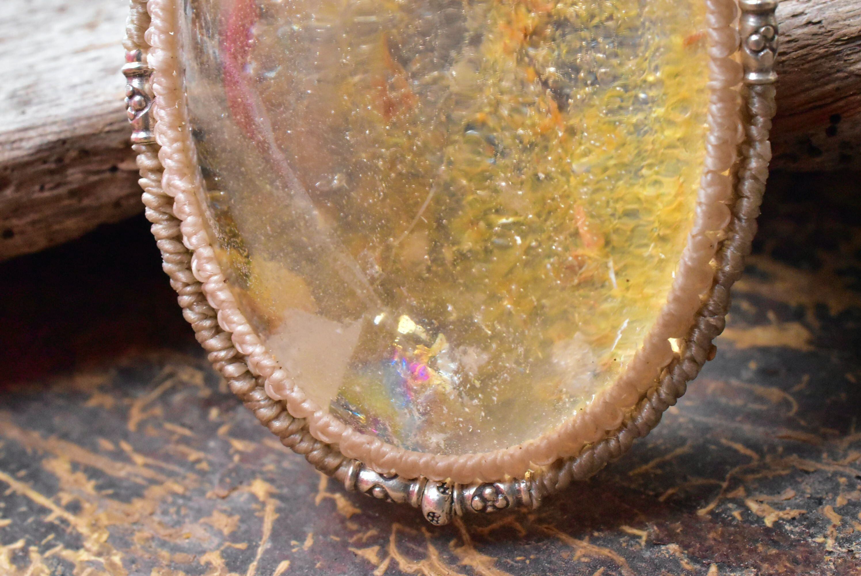 イエローベースの水晶の中に気泡、クラック、虹の背景となって幻想的な景色を作り上げています。