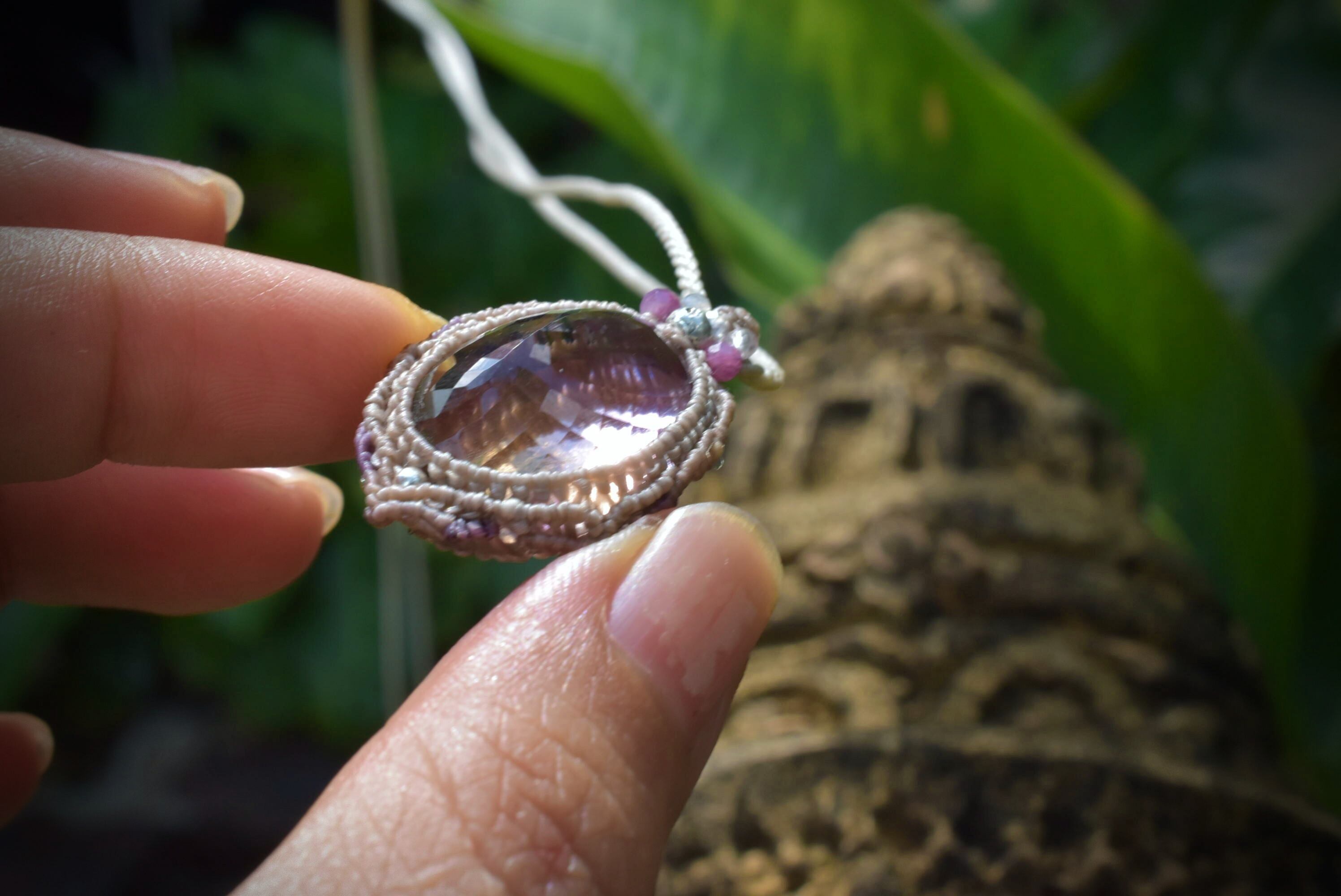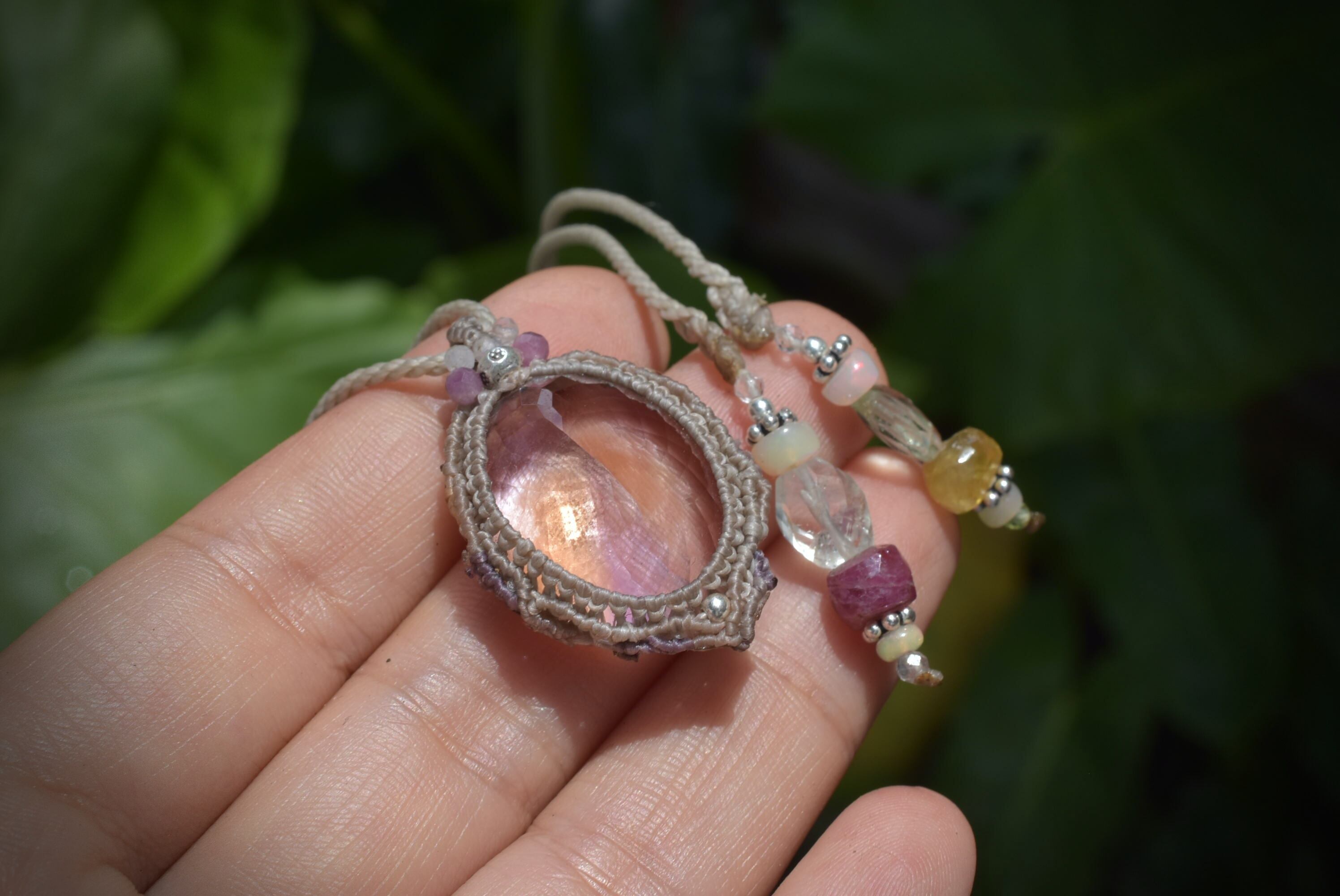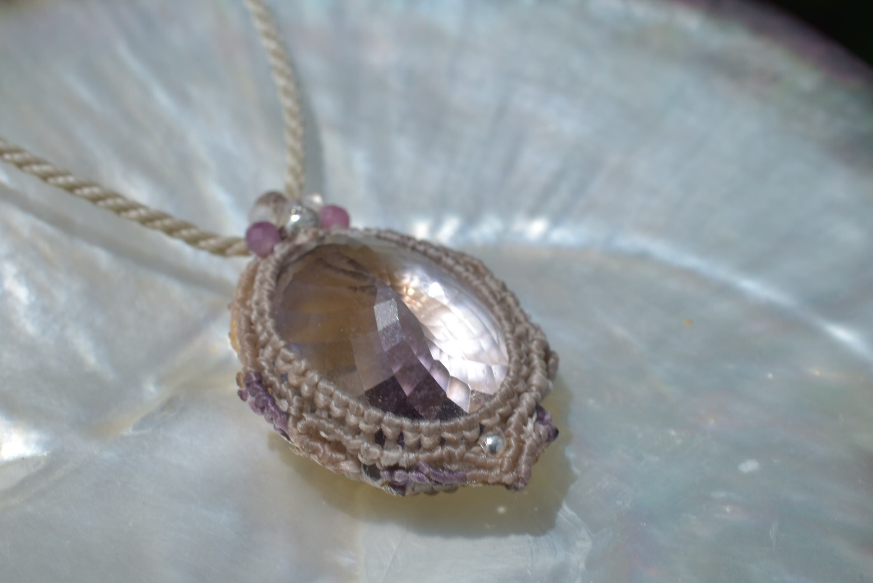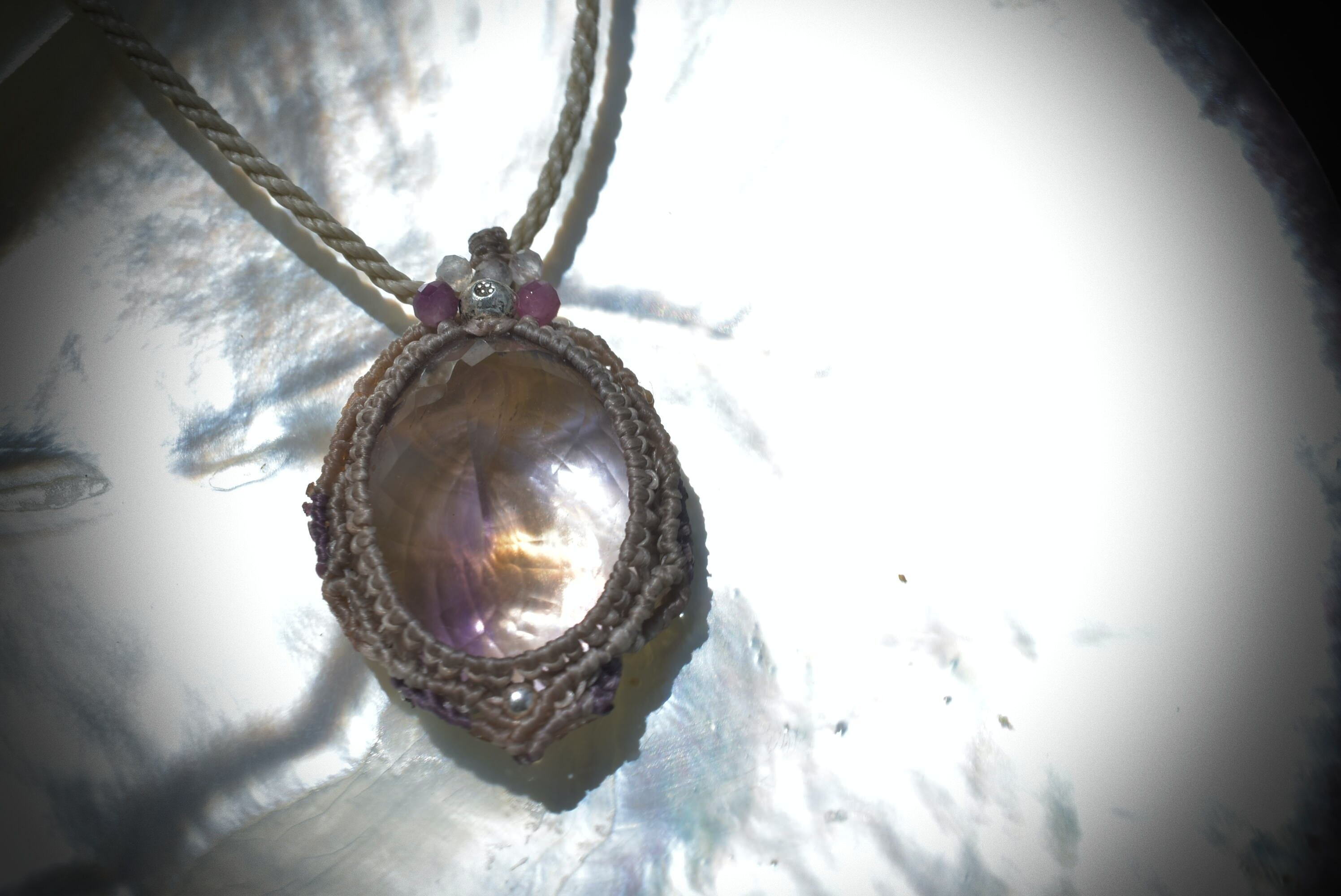 シトリン部分とアメトリン部分の2つが混じり合う色味のアメトリンならではの色みと艶、そして透明感あるものをマクラメ編み装飾を施してペンダントに仕上げました。