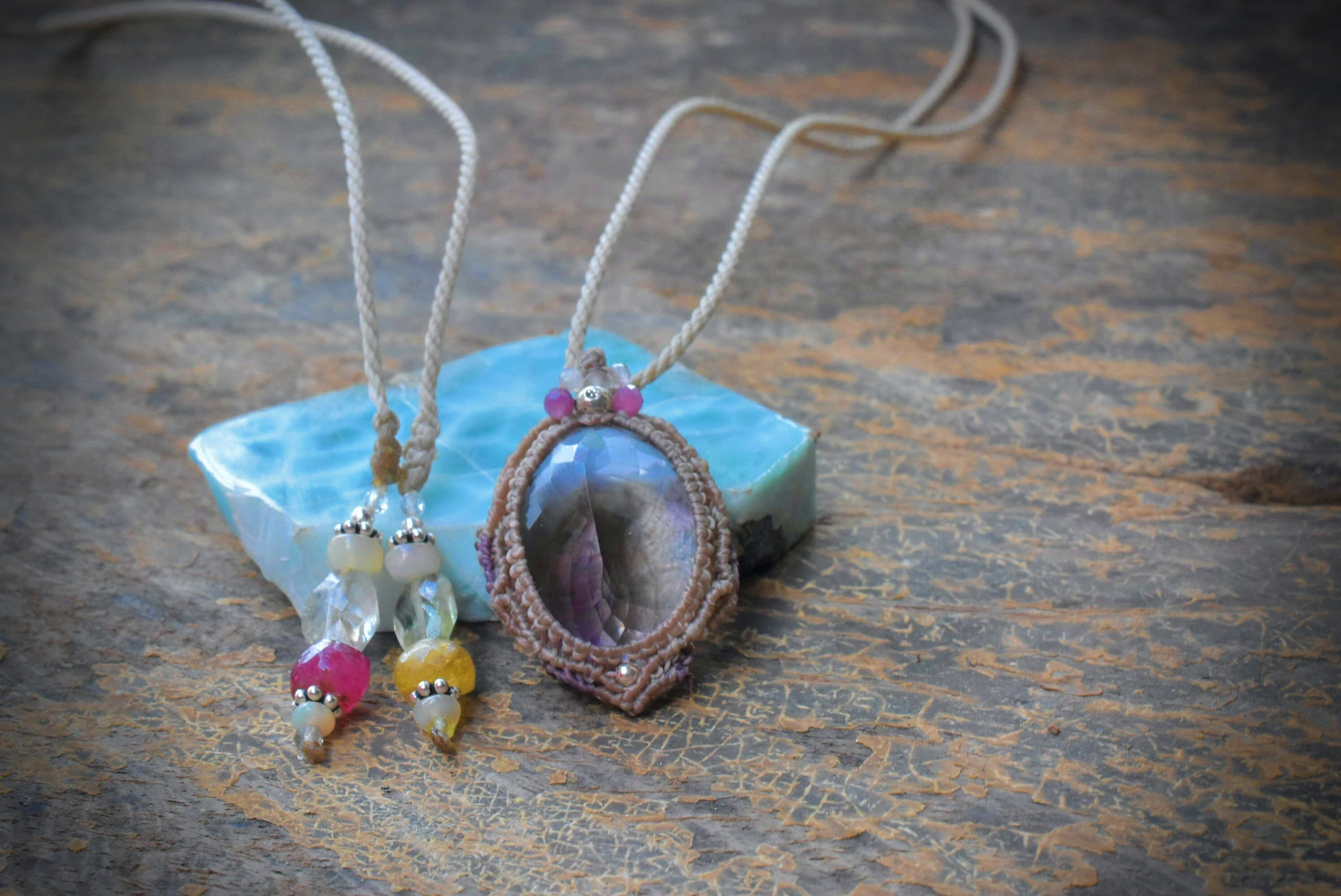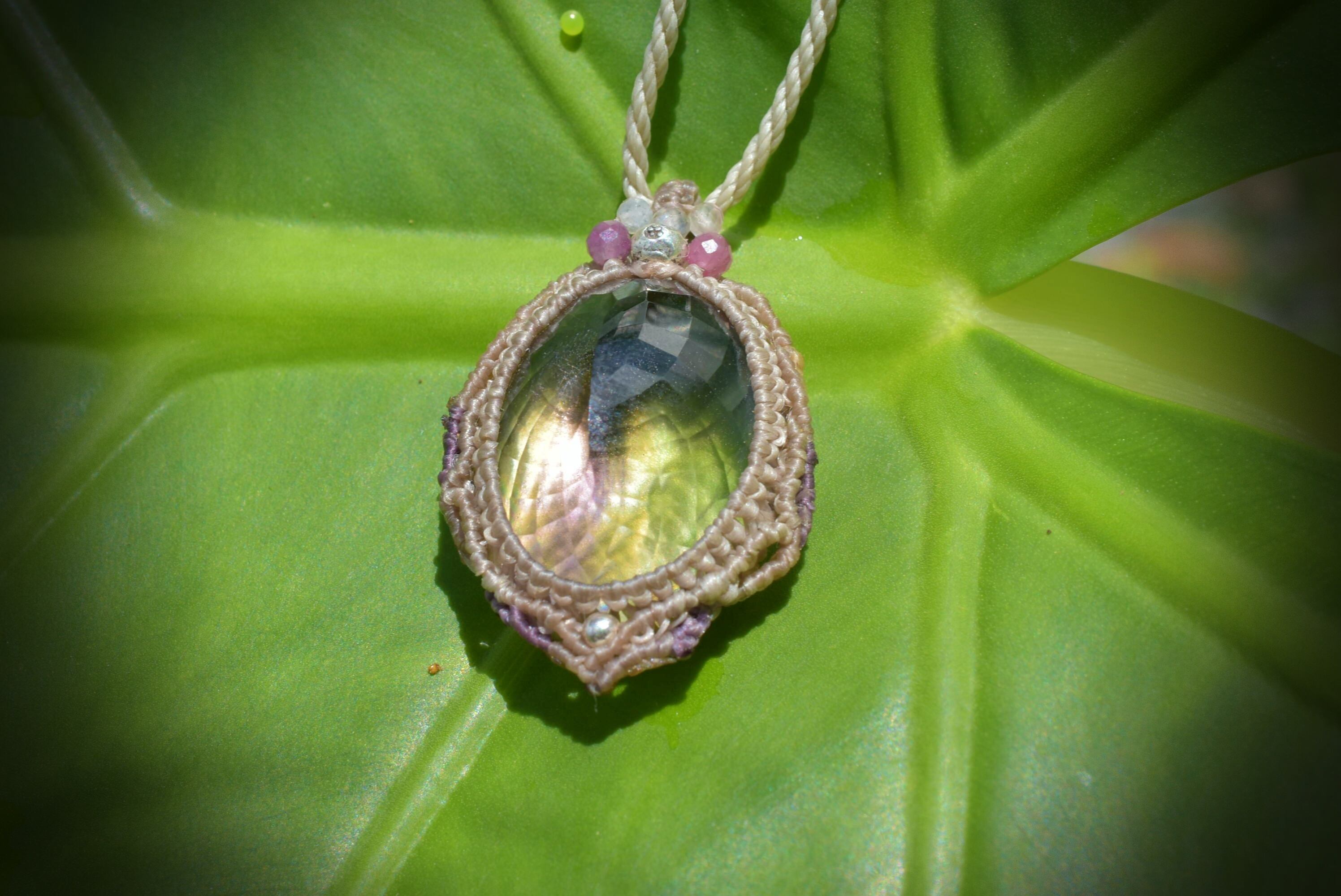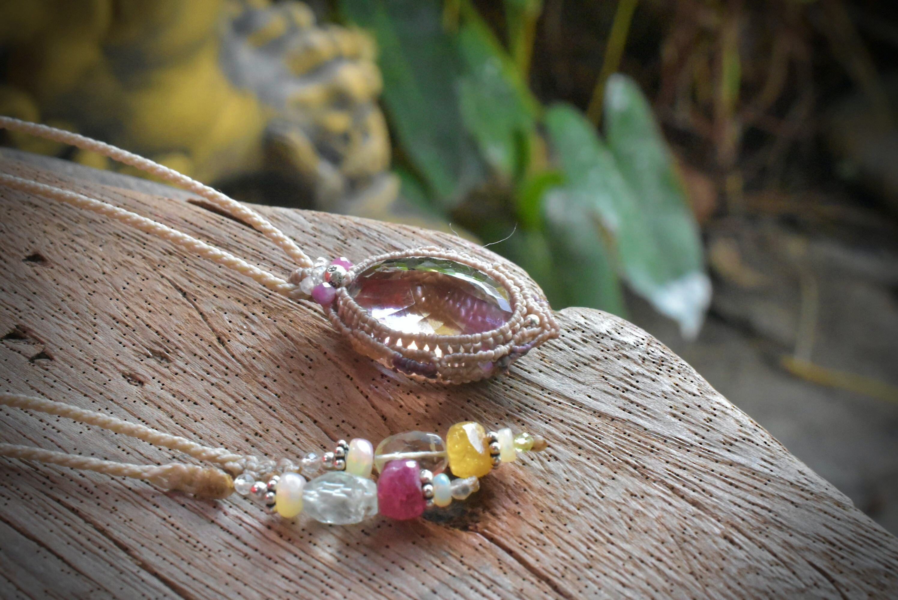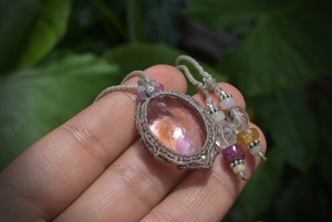 シトリン部分とアメトリン部分の2つが混じり合う色味のアメトリンならではの色みと艶、そして透明感あるものをマクラメ編み装飾を施してペンダントに仕上げました。
