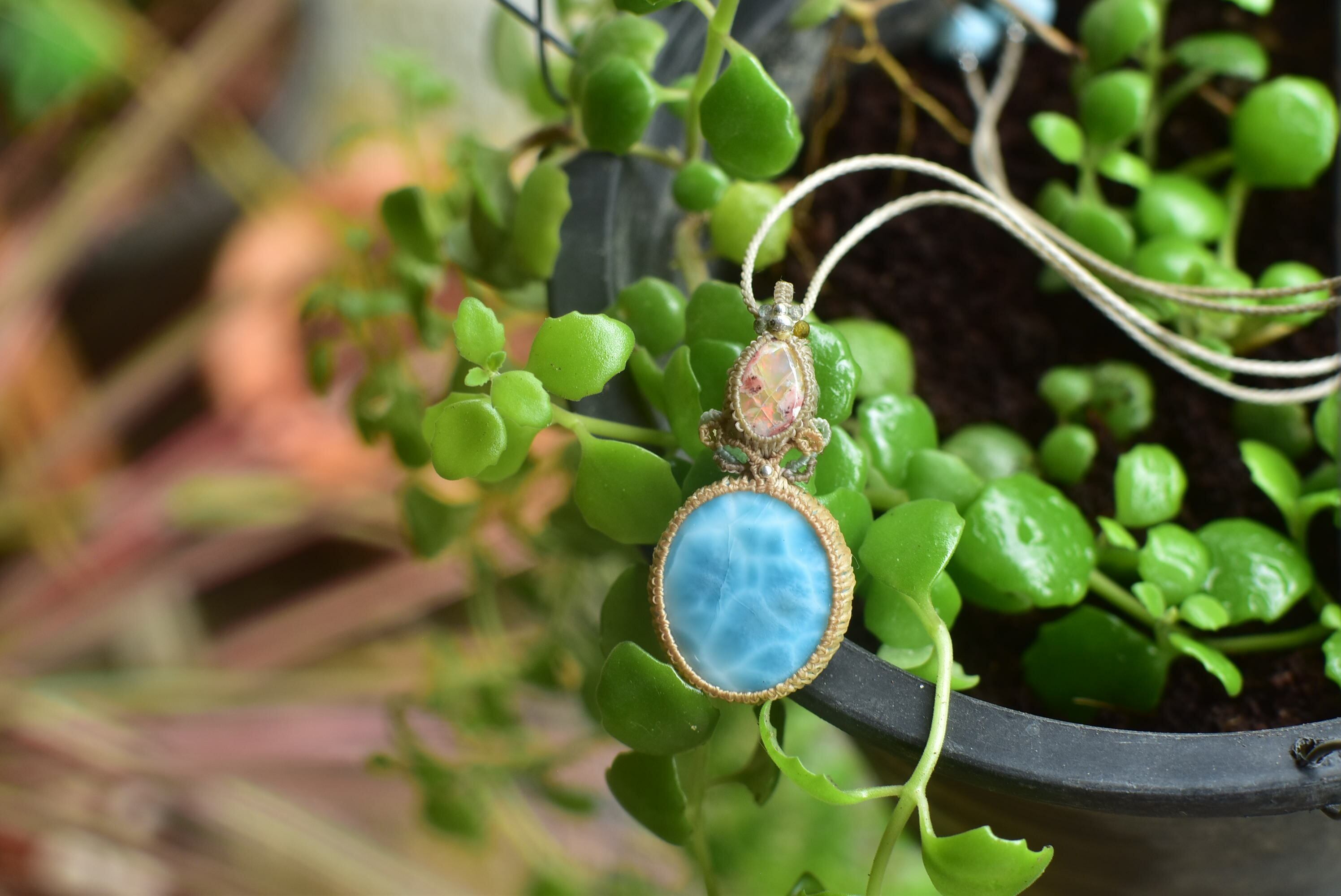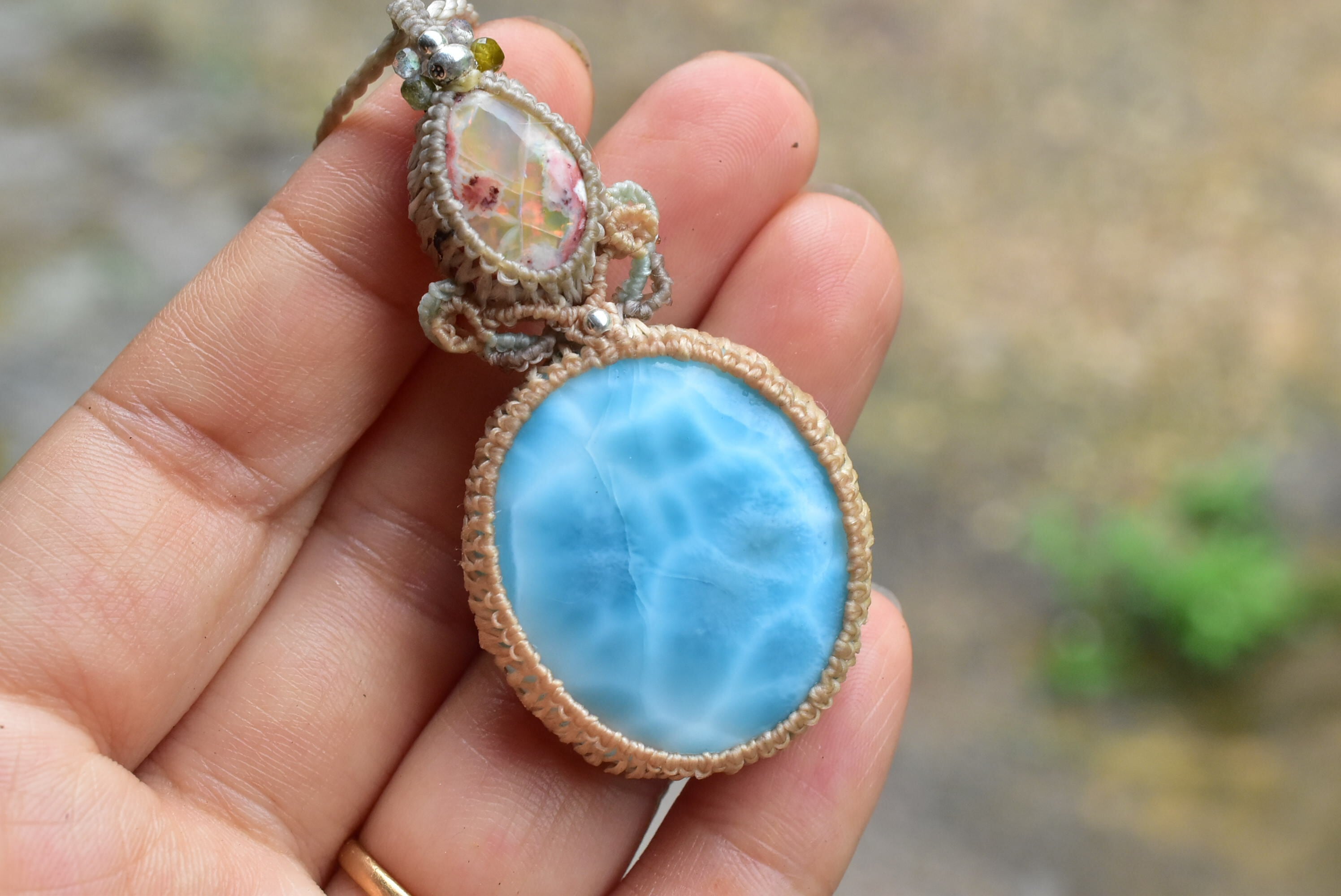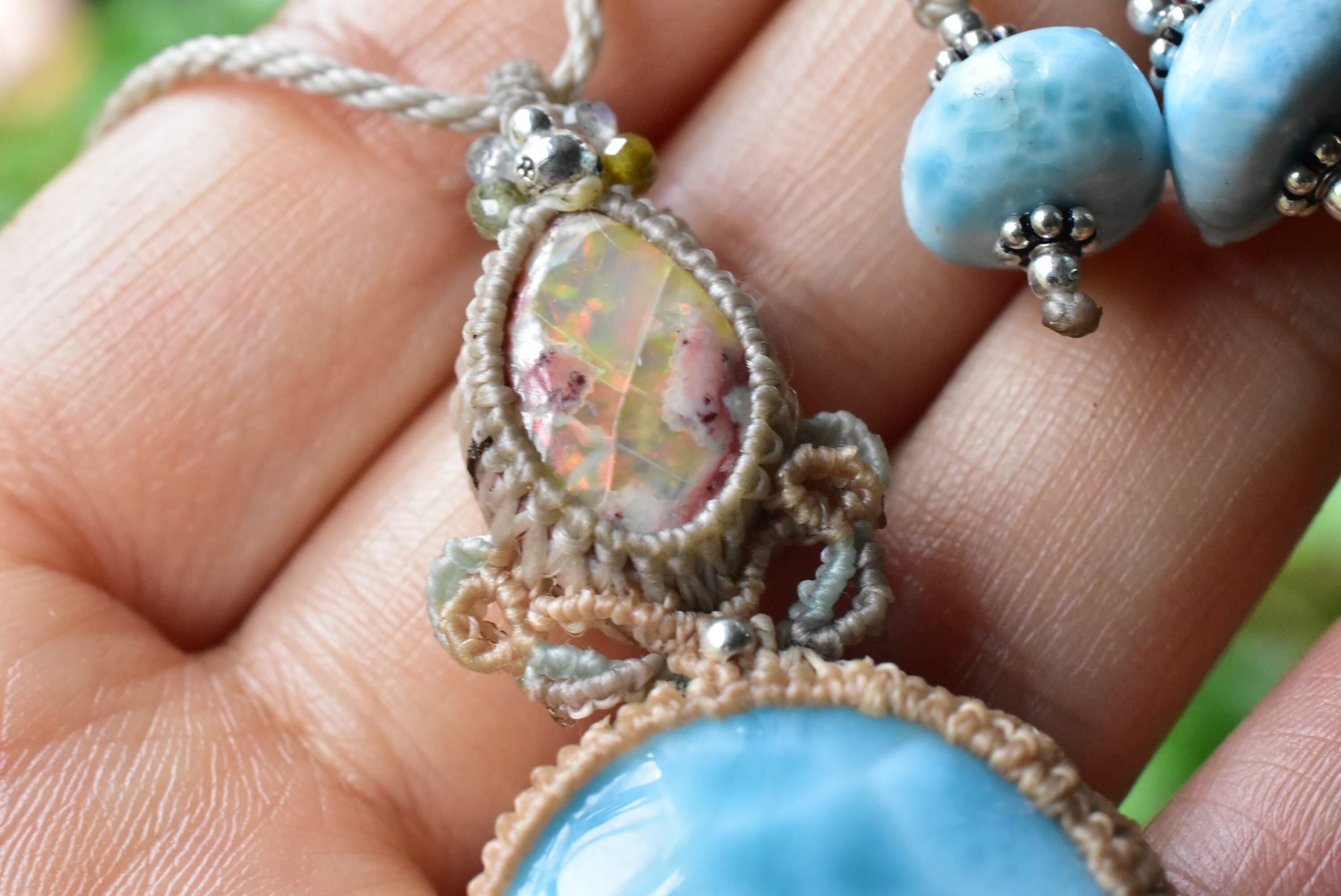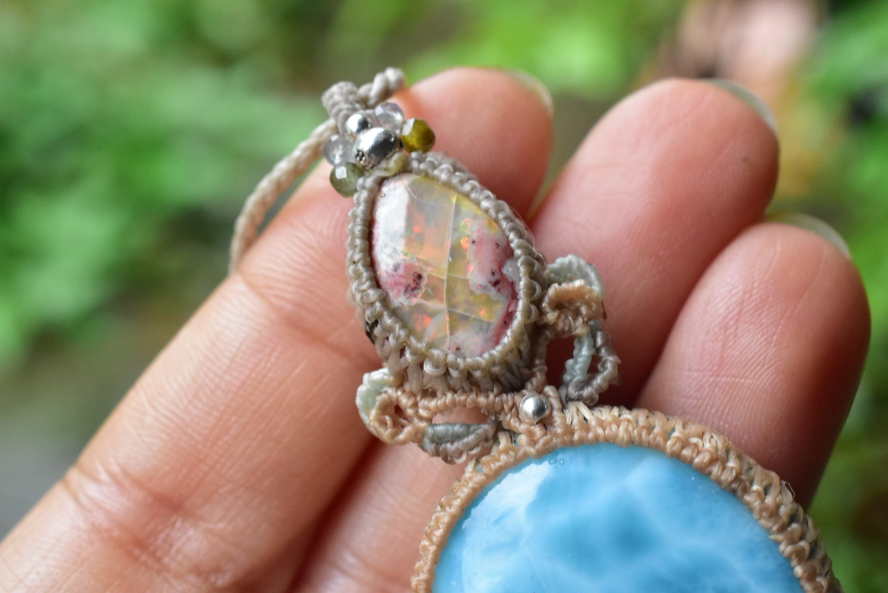 高品質ラリマーとカンテラオパールのピンクプリズム マクラメペンダントlari037