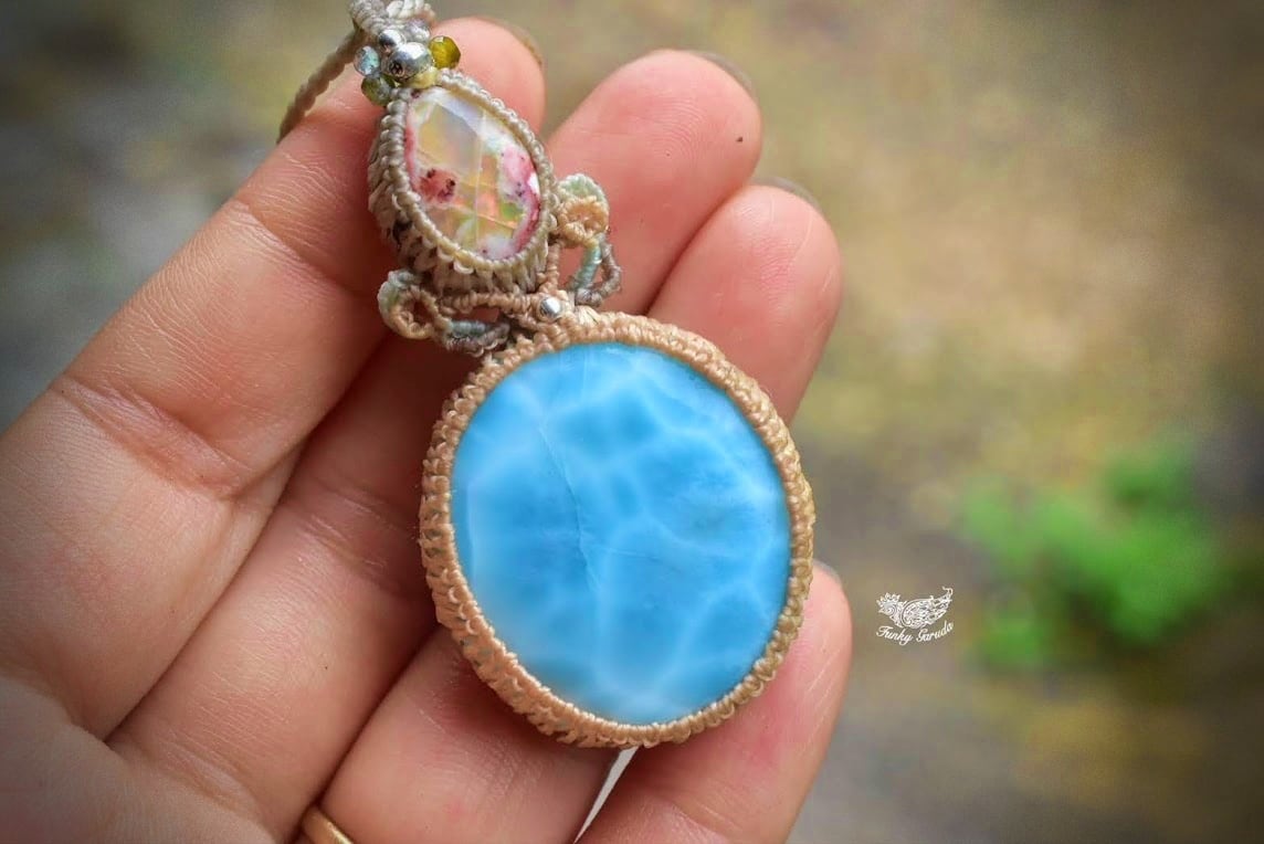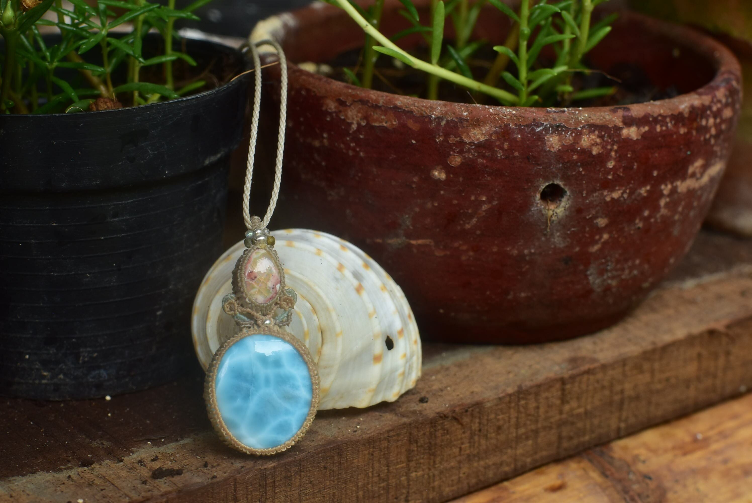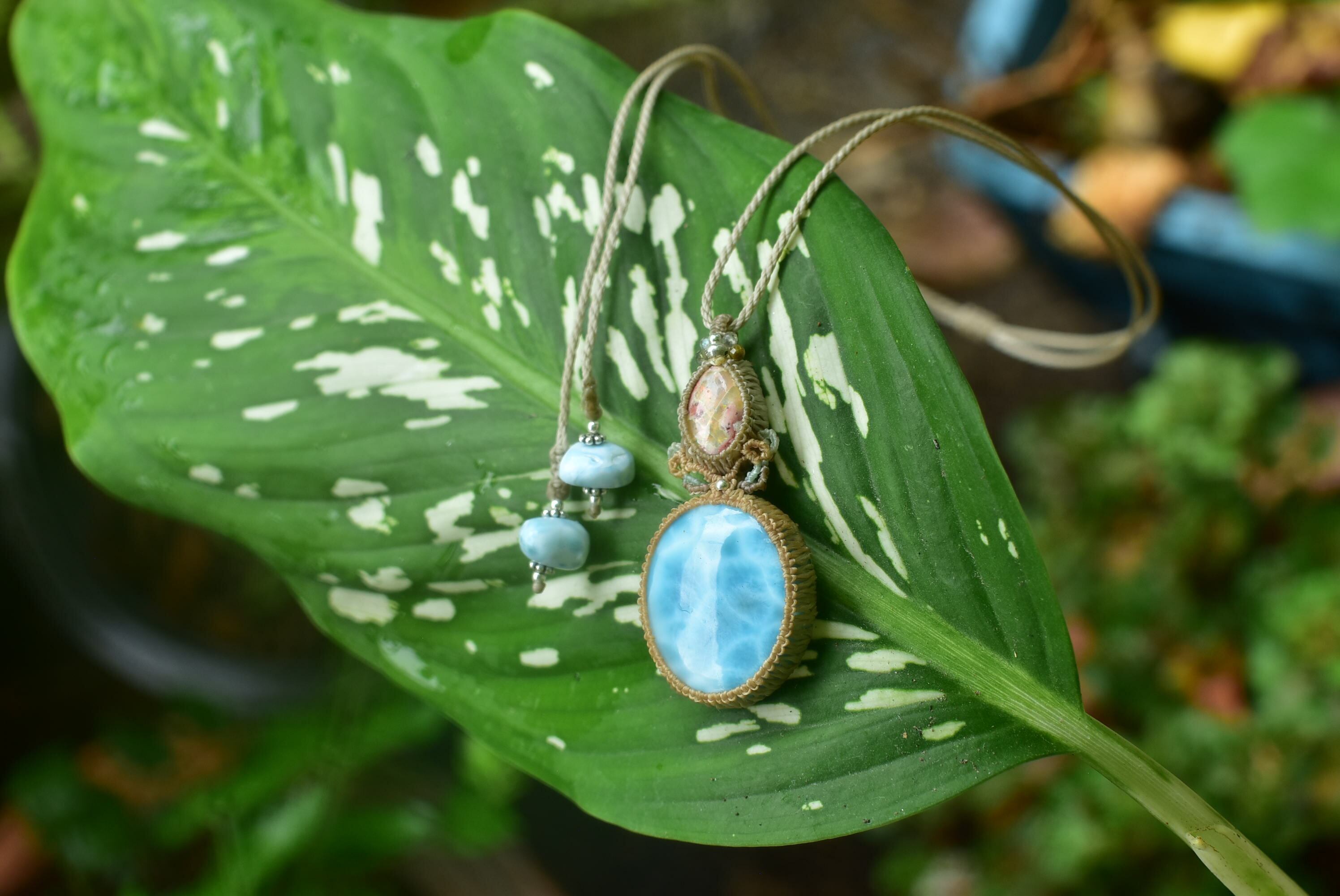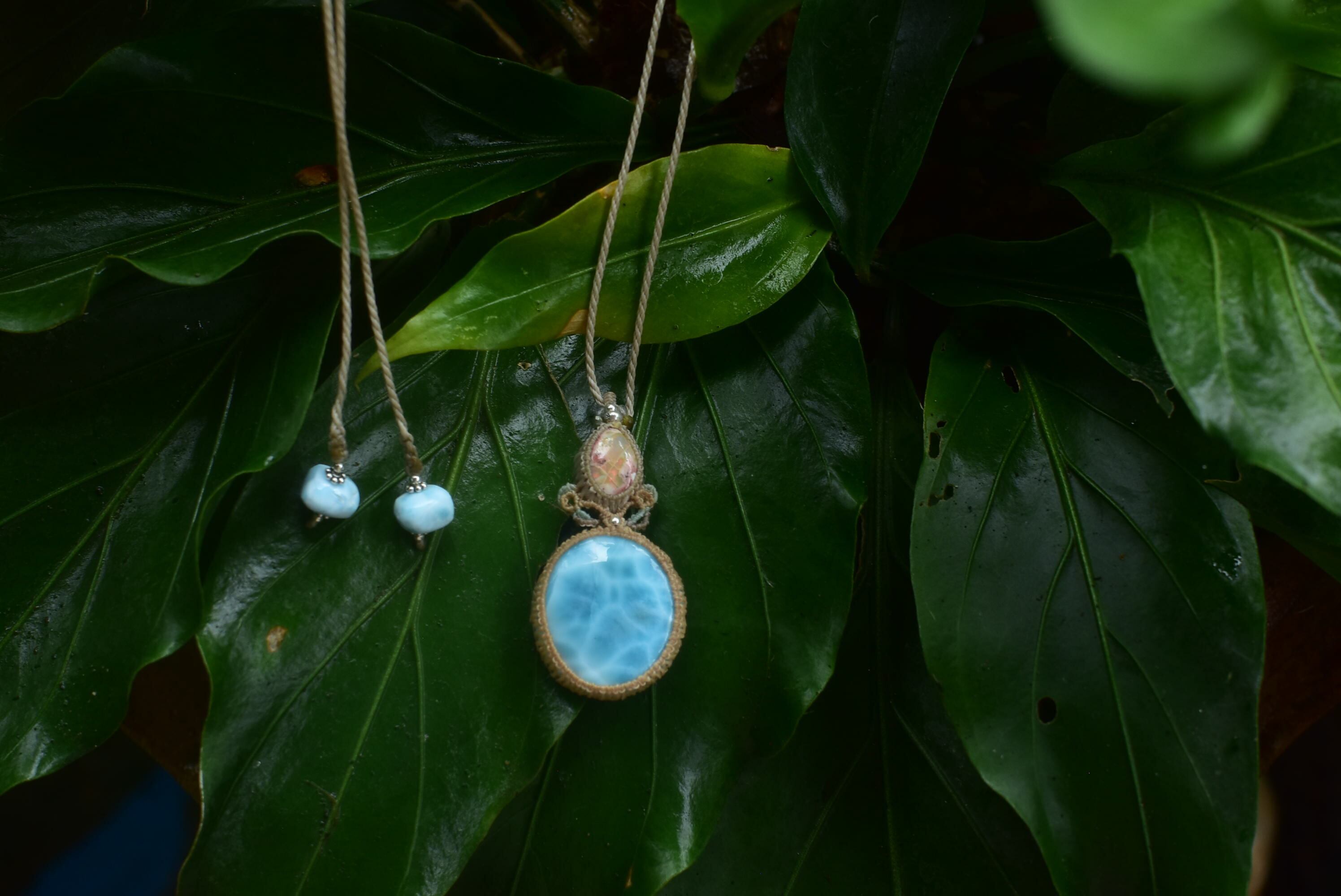 高品質ラリマーとカンテラオパールのピンクプリズム マクラメペンダントlari037