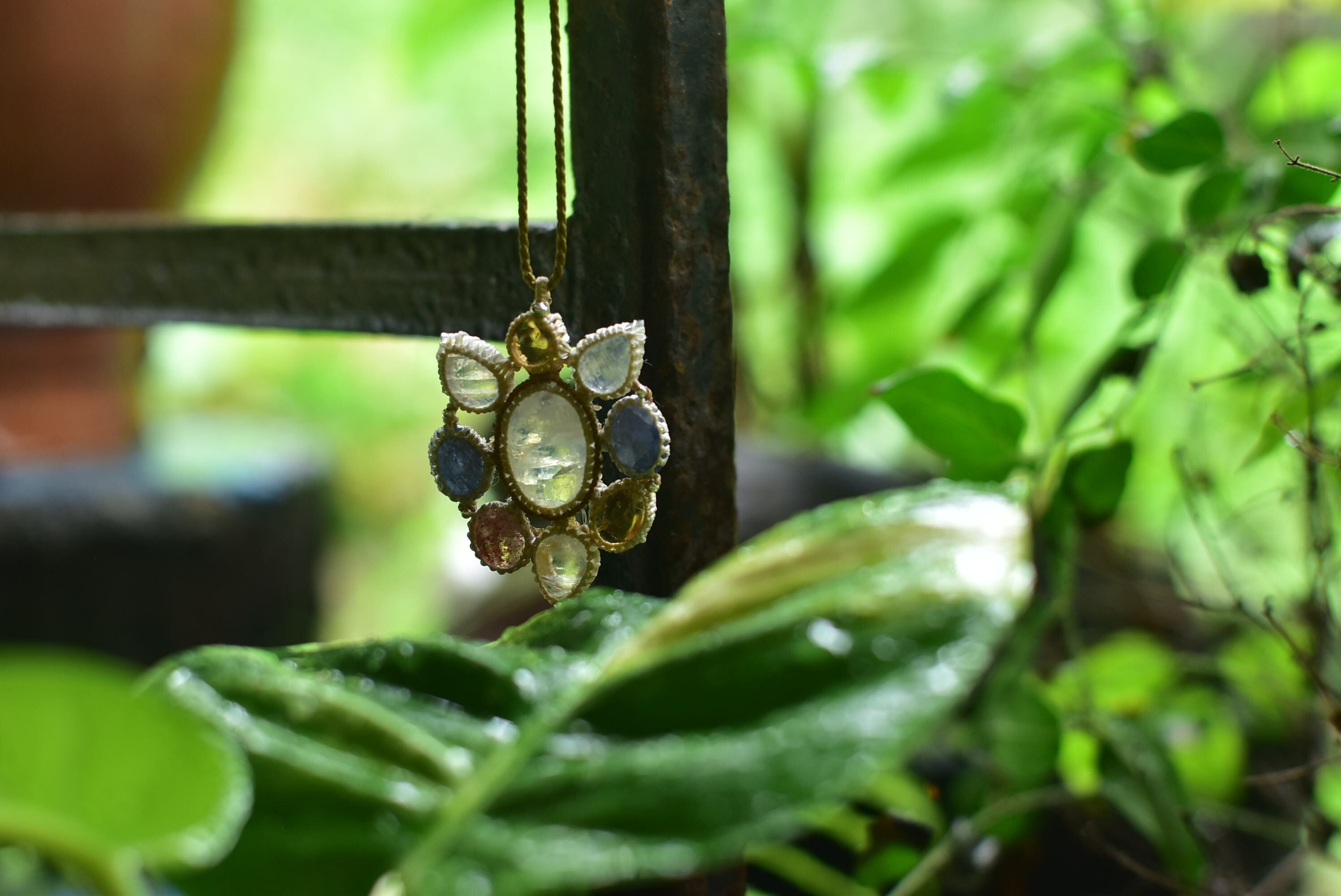 ブルーシラーが妖艶な色合いのレインボームーンストーンを土台に小さな石を結んでひとつにしたお花ペンダントを仕上げました。どちらかというと流星のようなイメージに。