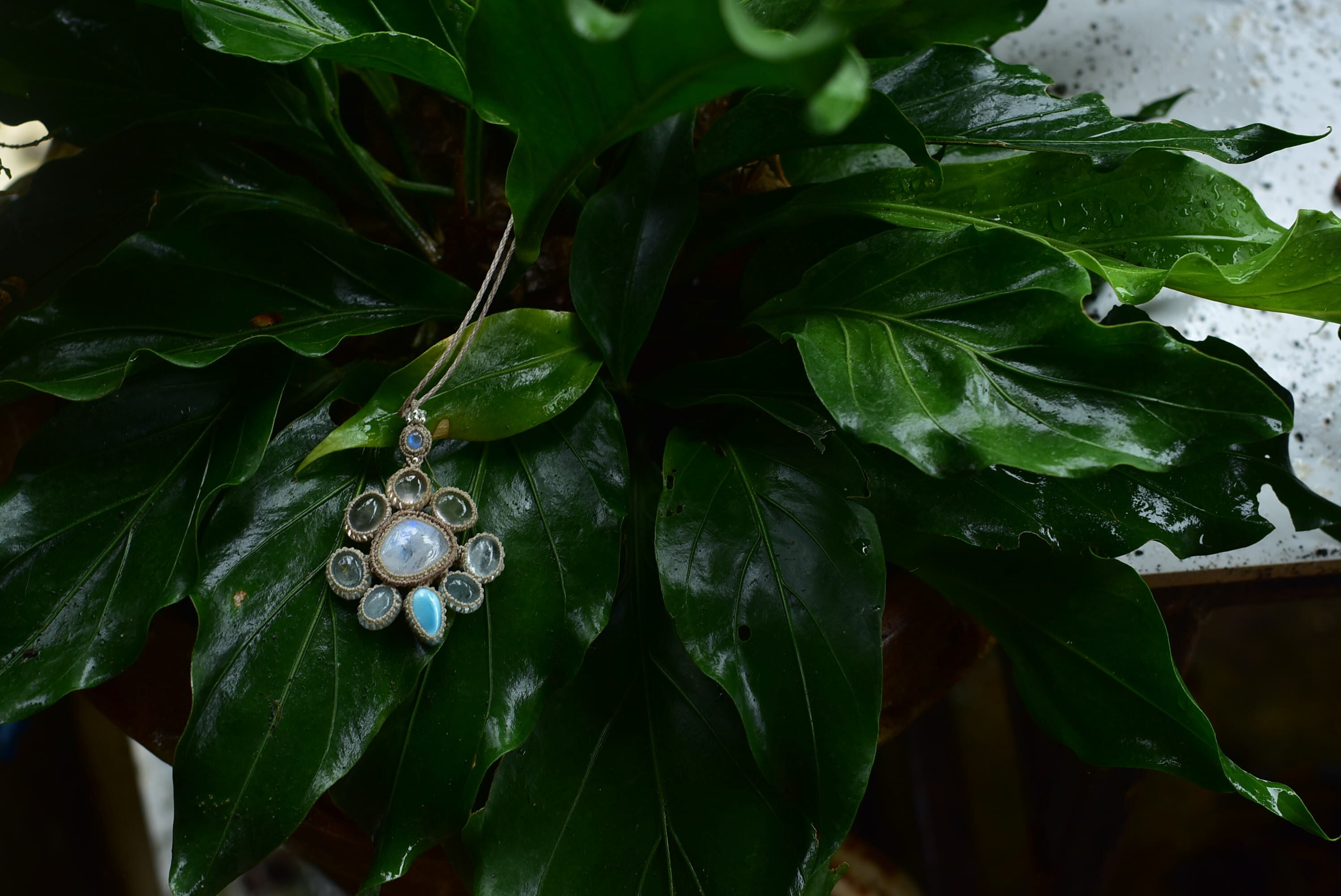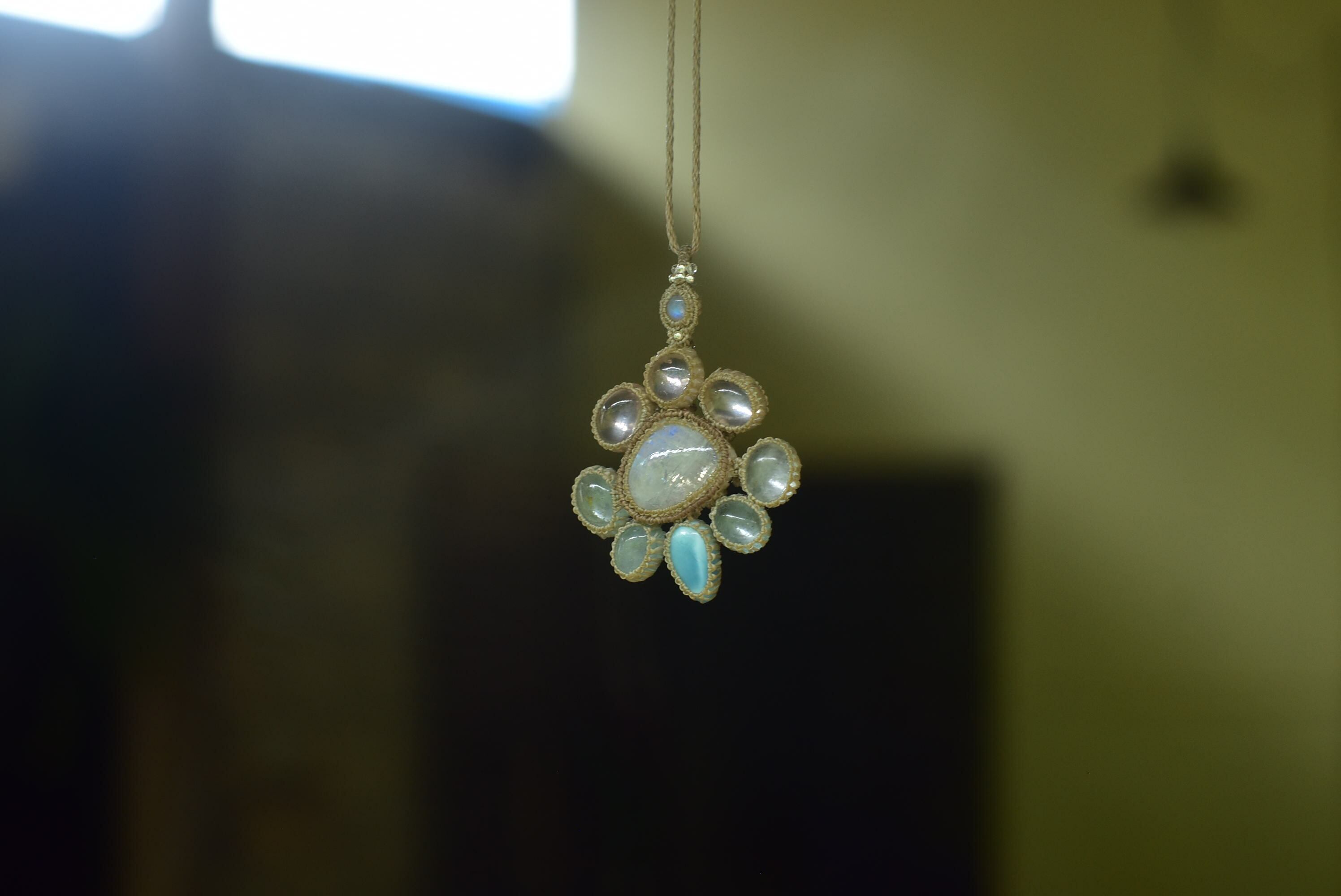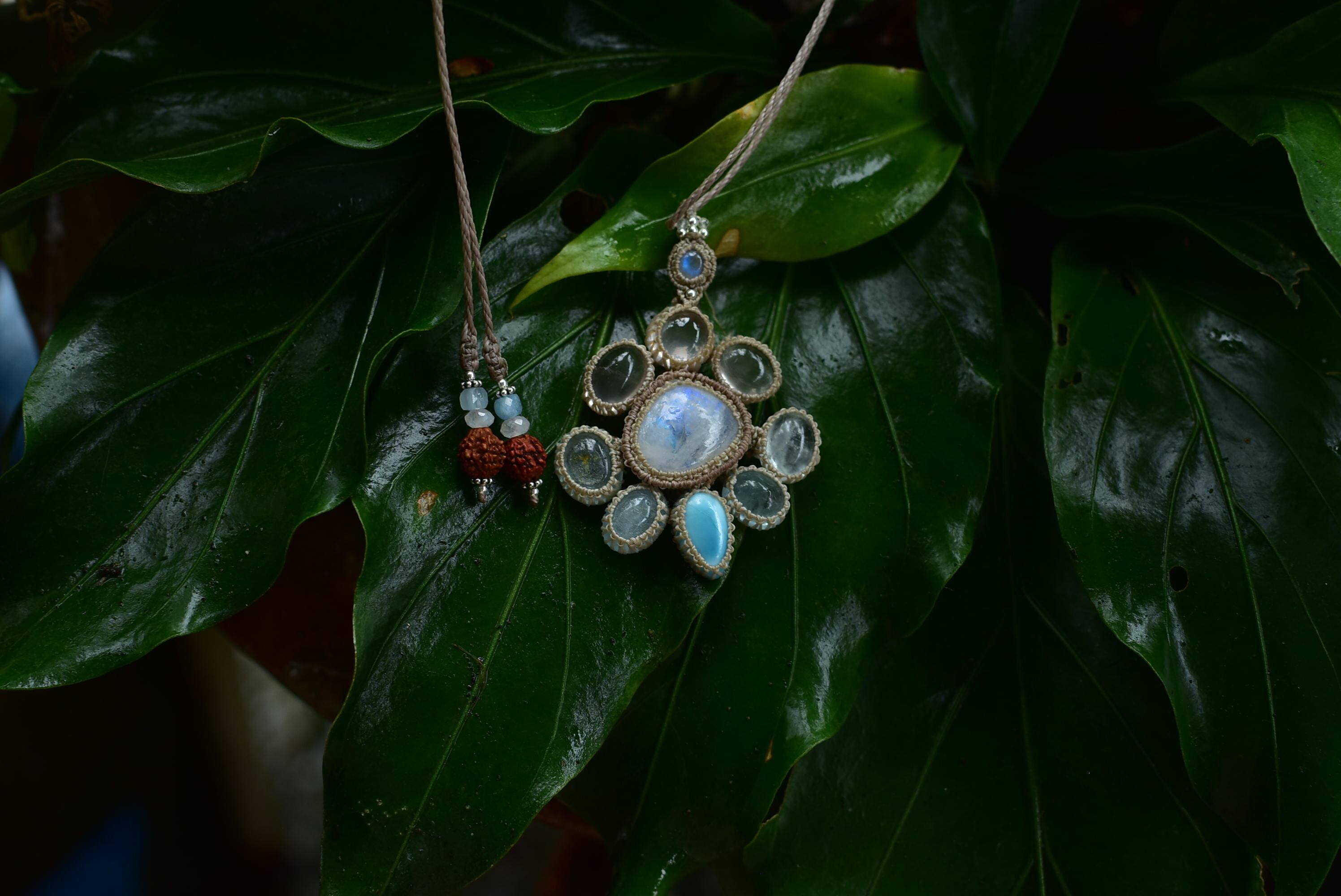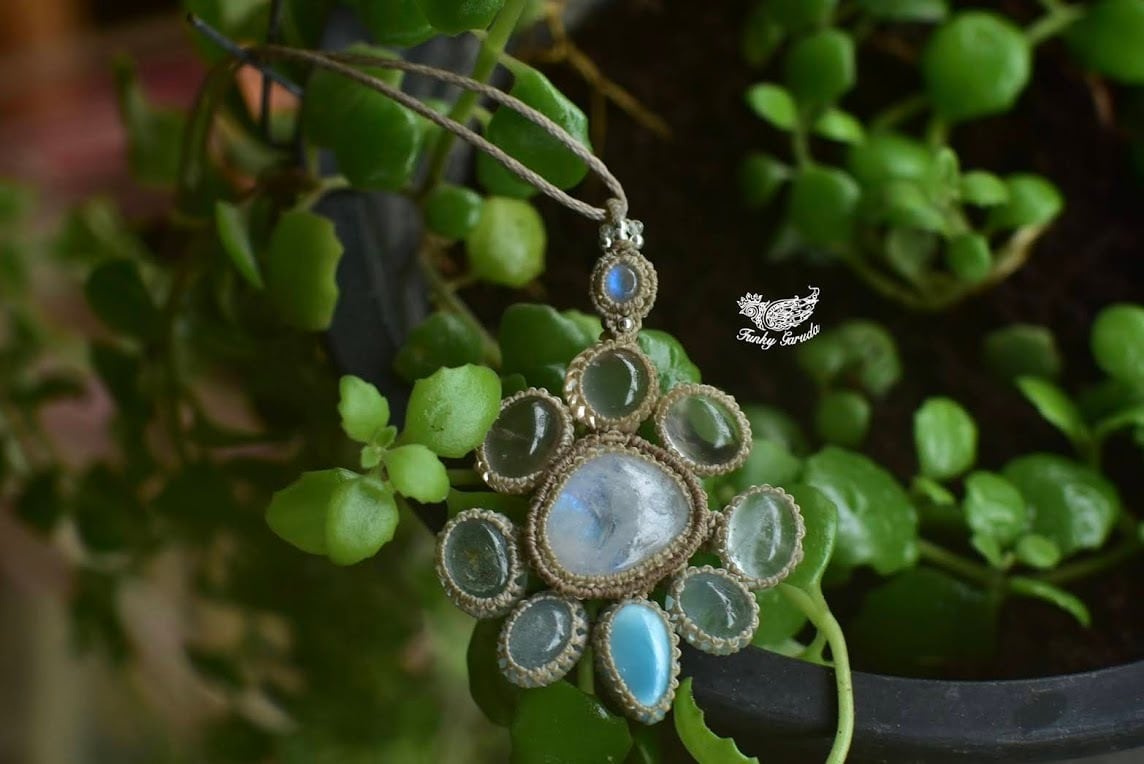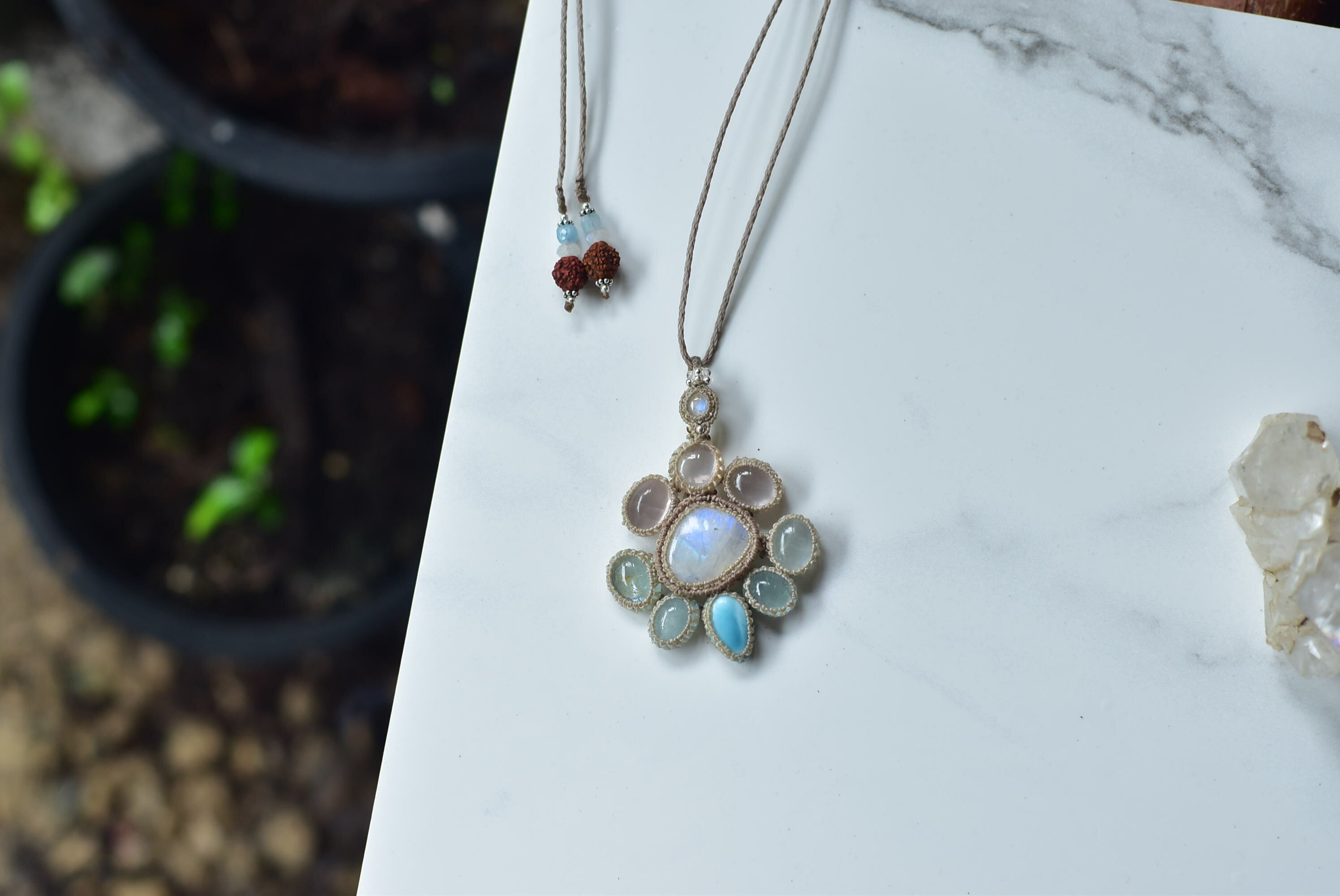艶やかな星★スターローズクォーツ ラリマー レインボームーンストーン マクラメペンダントmoon047