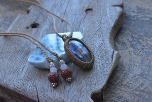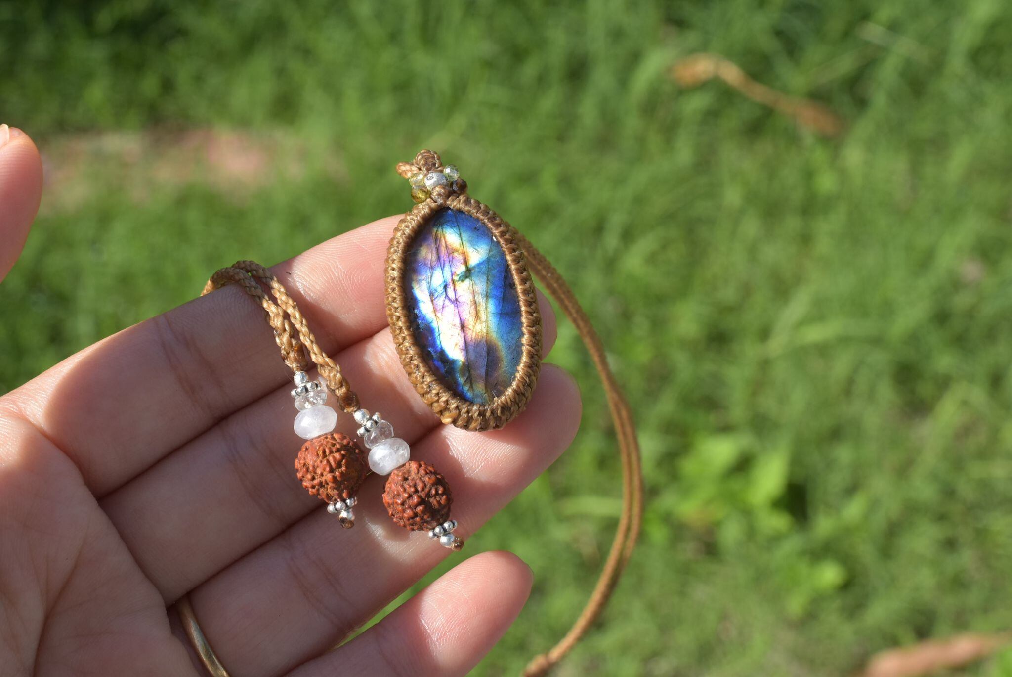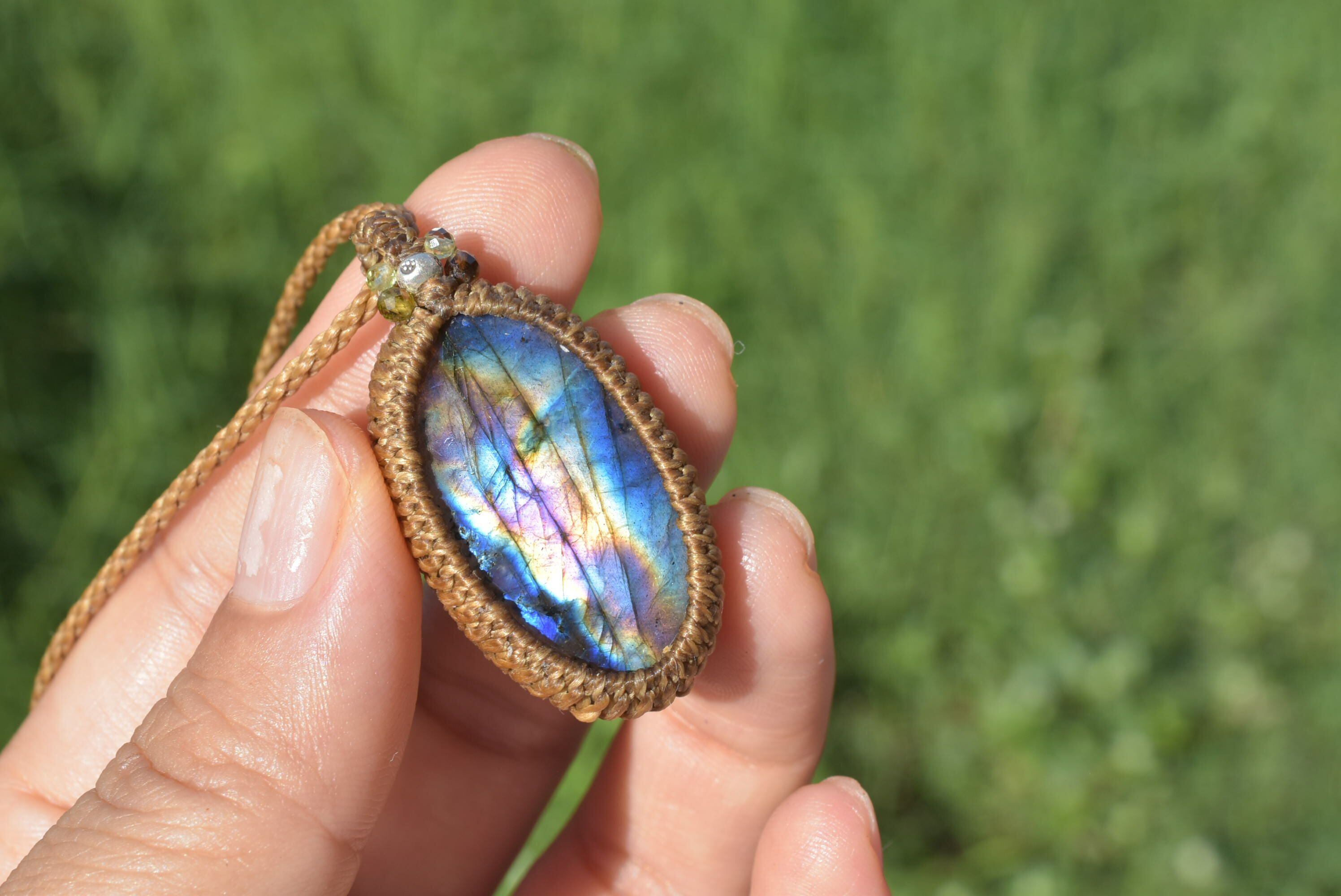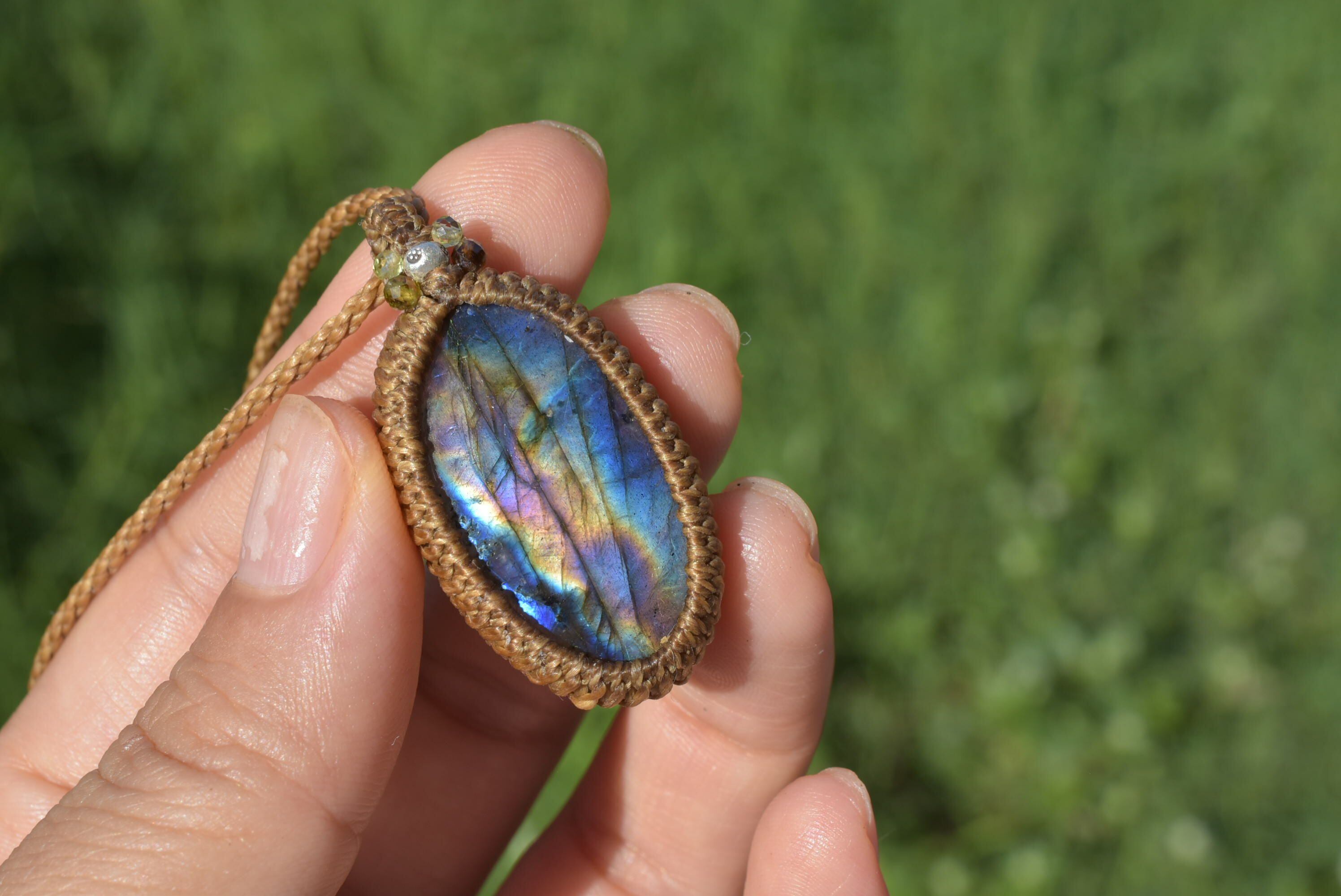 光を反射して、ピンク、パープル、オレンジなどの彩色がくっきり現れる神々しいラブラドライトをシンプルなマクラメペンダントに仕上げました。