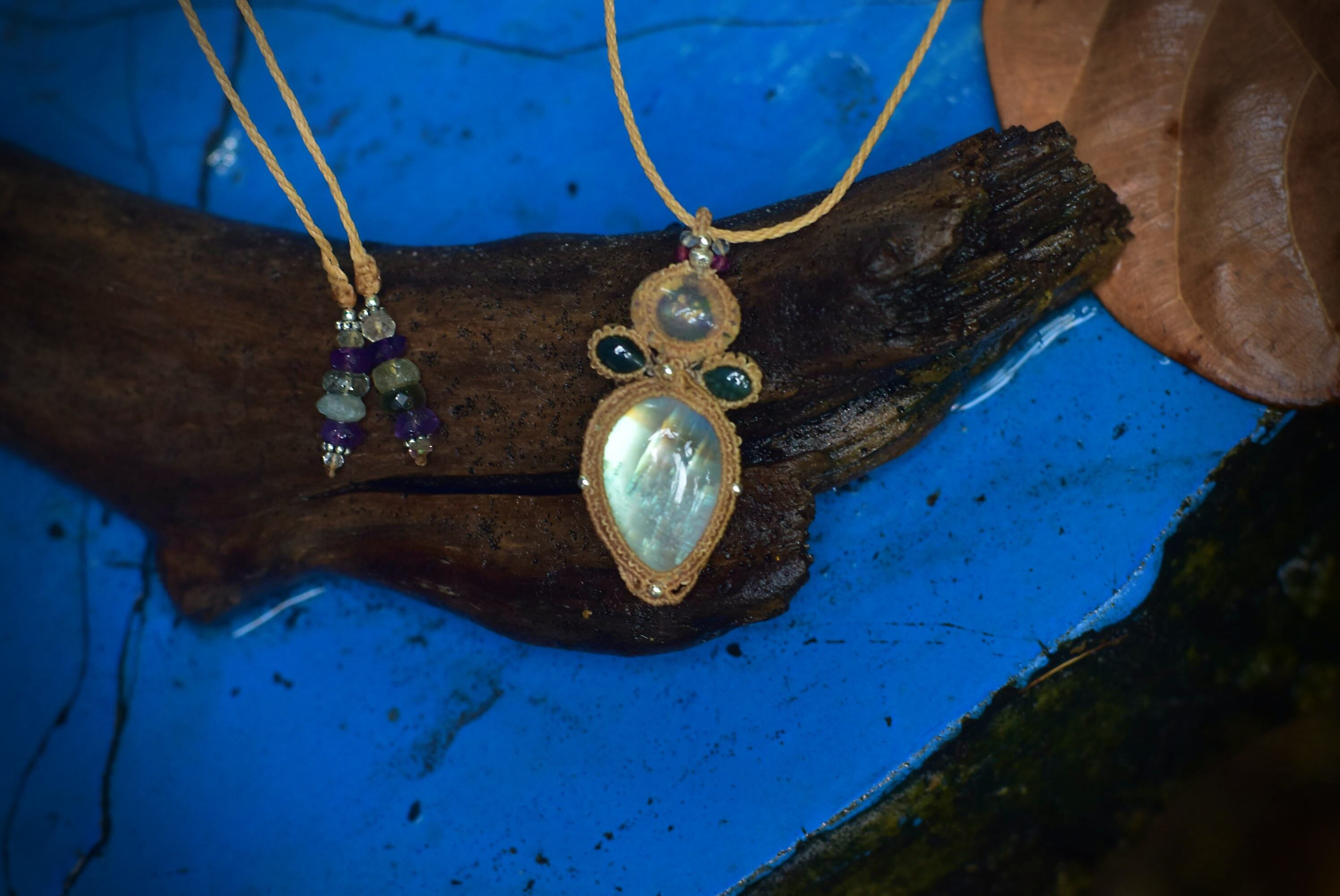 ◆このたびはオリーブ、ゴールドブラウン、差し色としてブラウンの3色の蝋引き糸を使用しマクラメ編み装飾を施しました。
