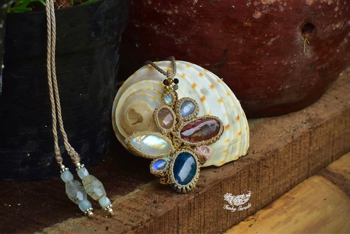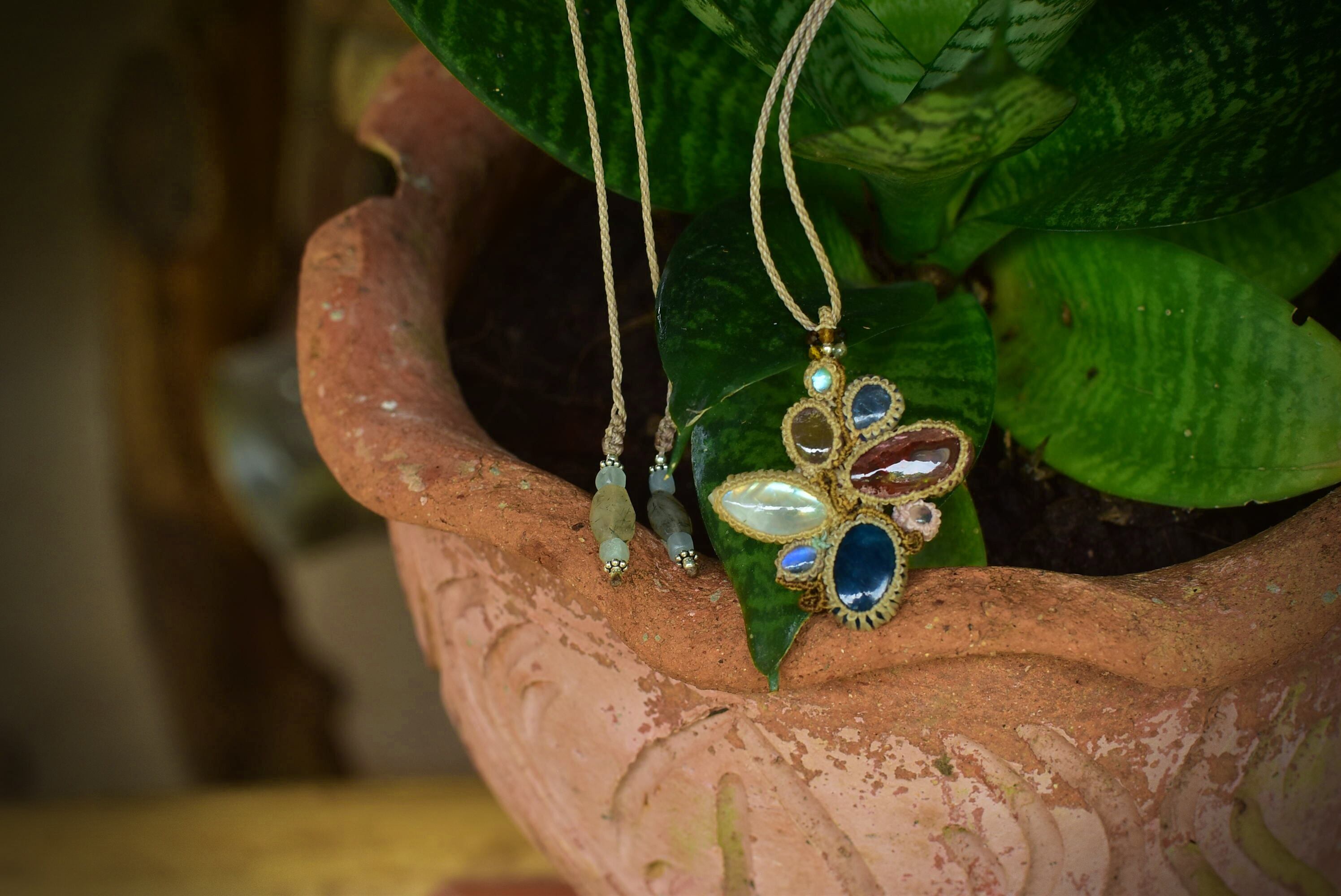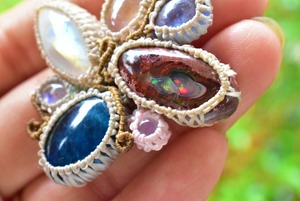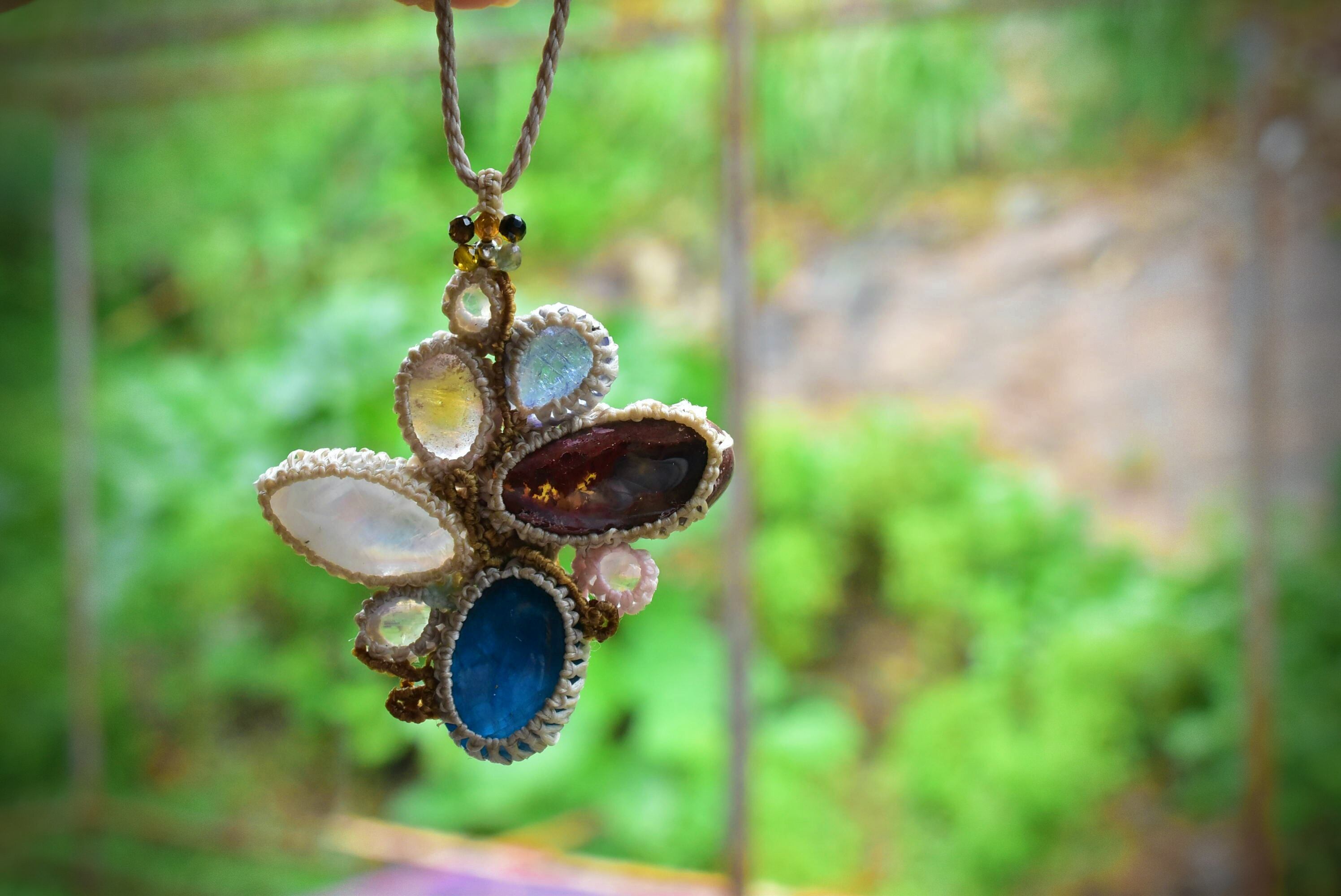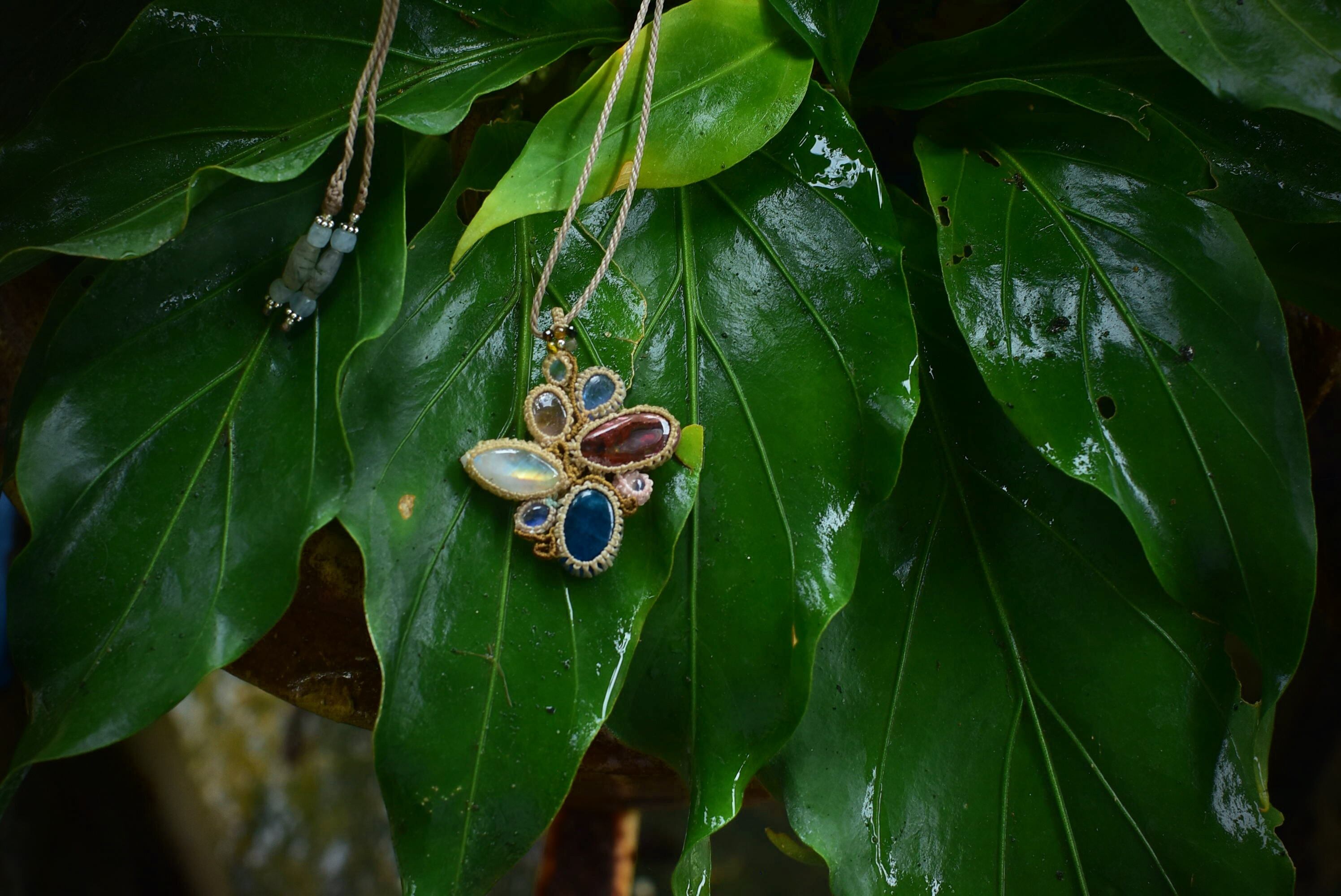 連結★花の妖精★レインボームーンストーン オパール アパタイト マクラメペンダントmoon050