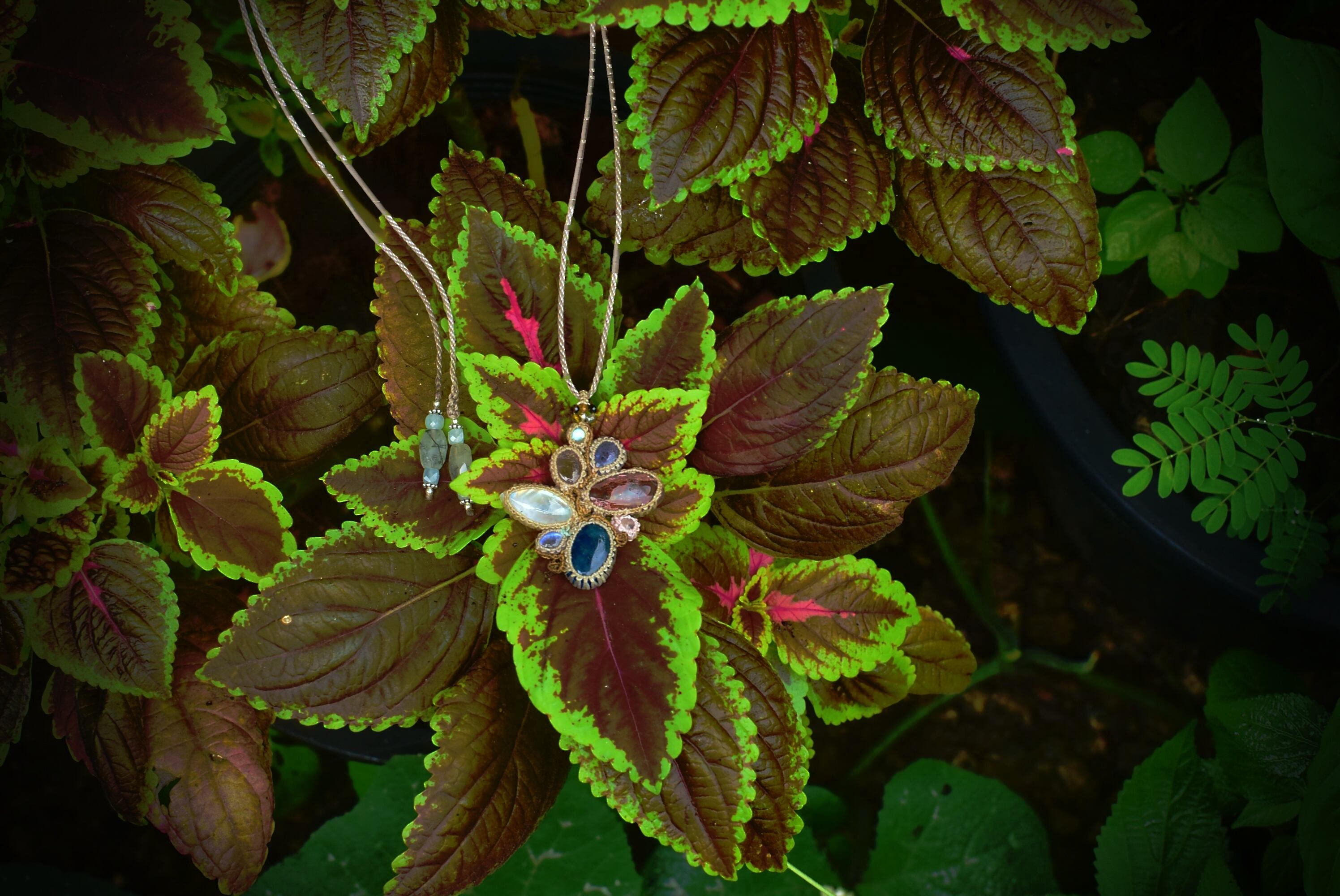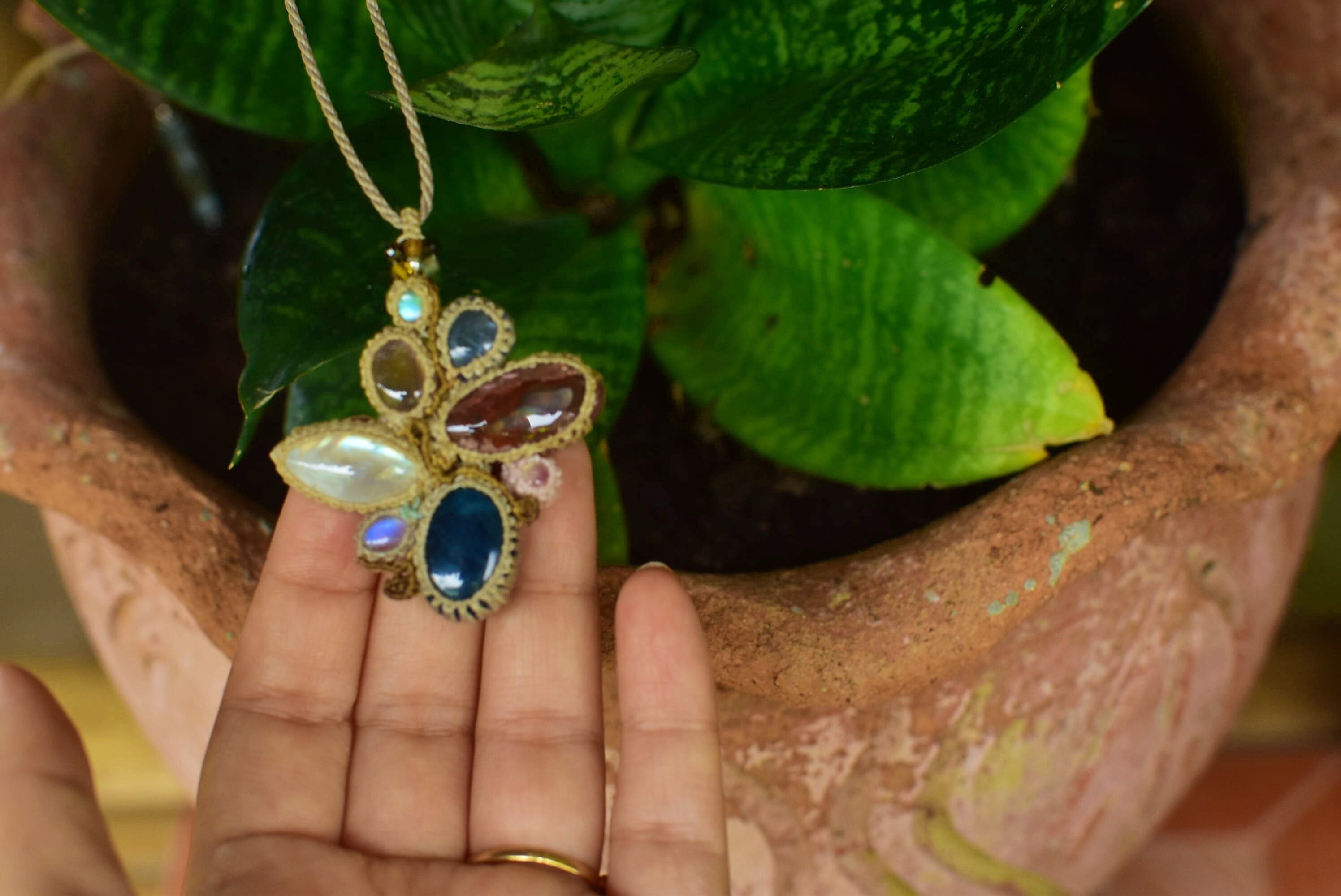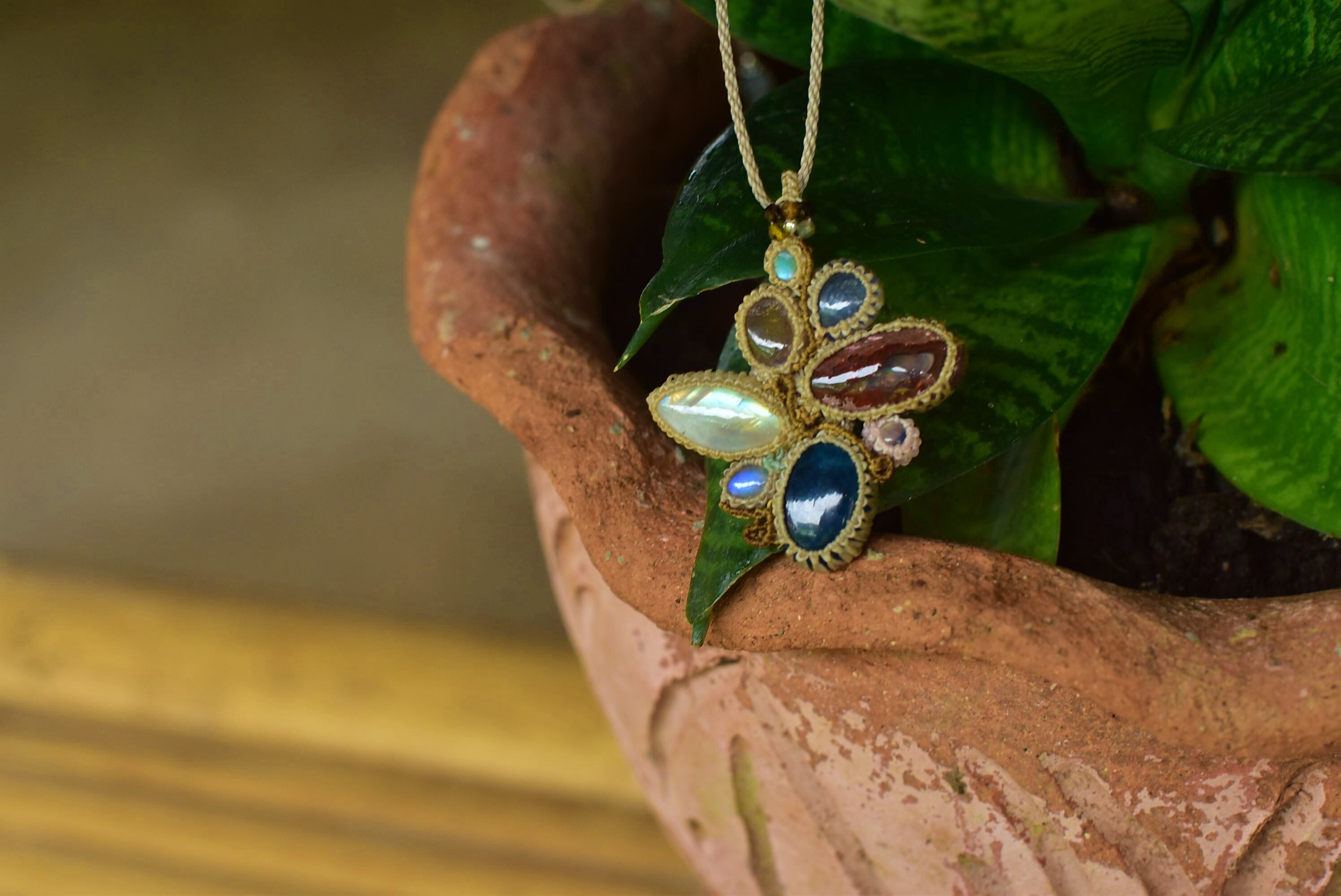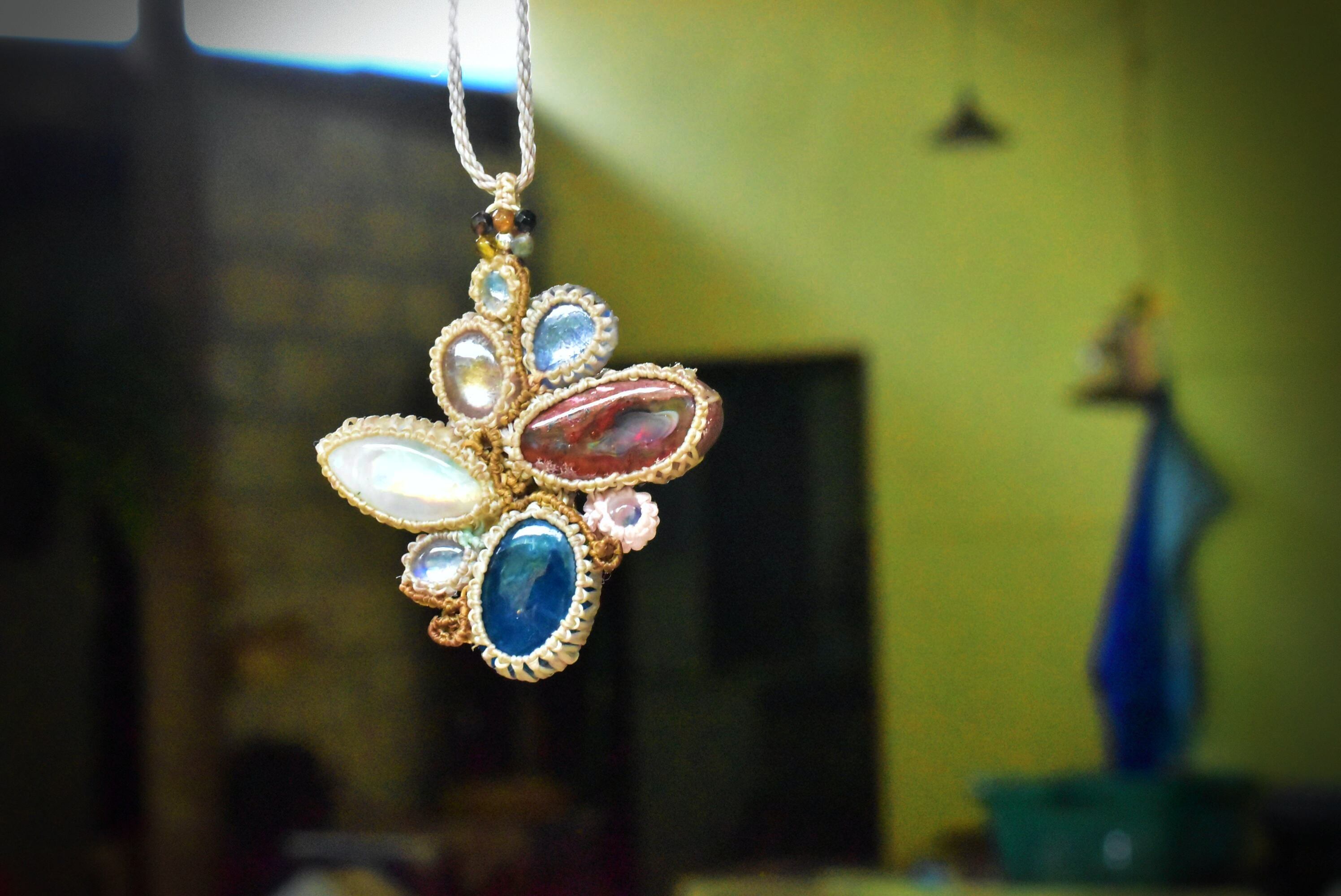 連結★花の妖精★レインボームーンストーン オパール アパタイト マクラメペンダントmoon050