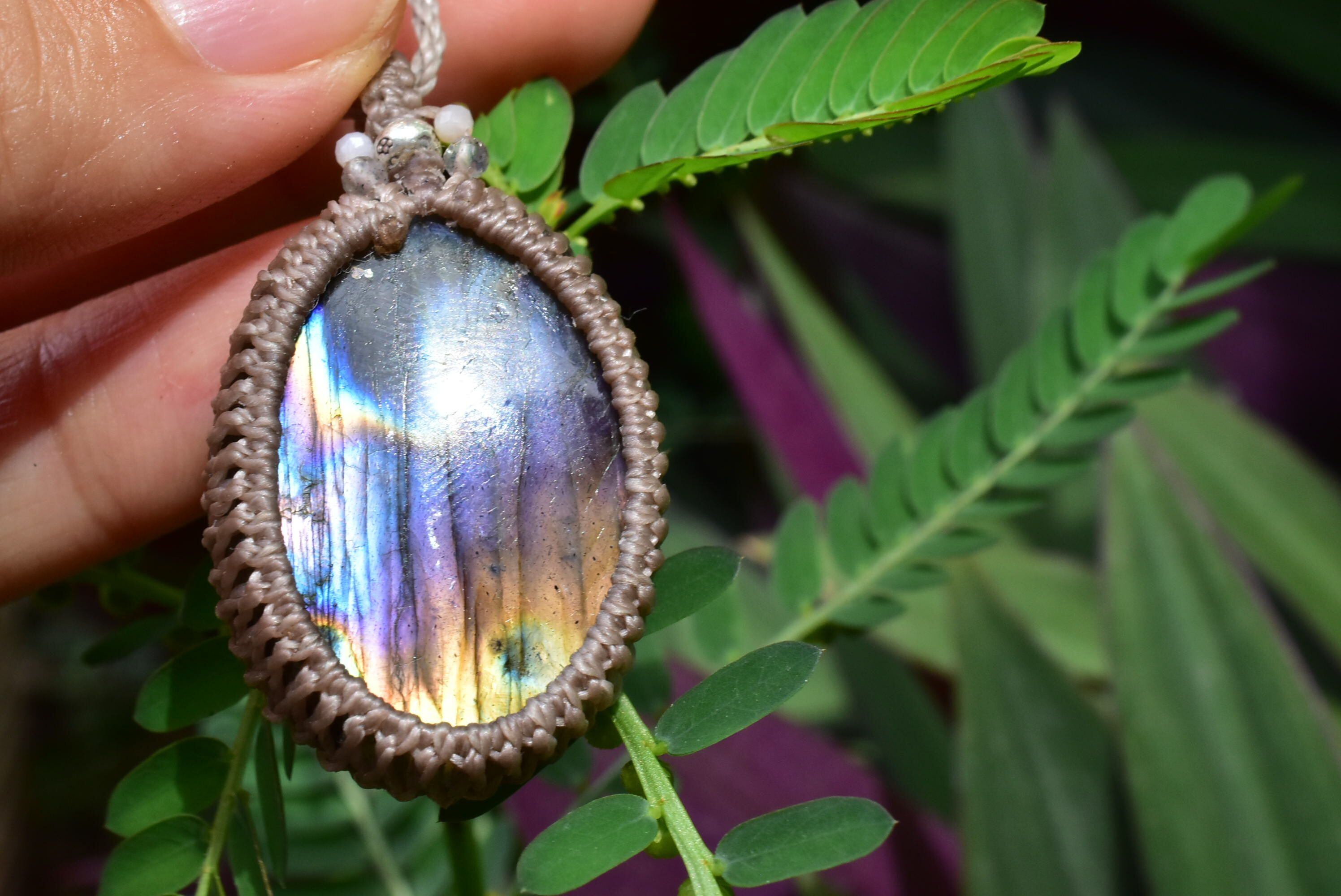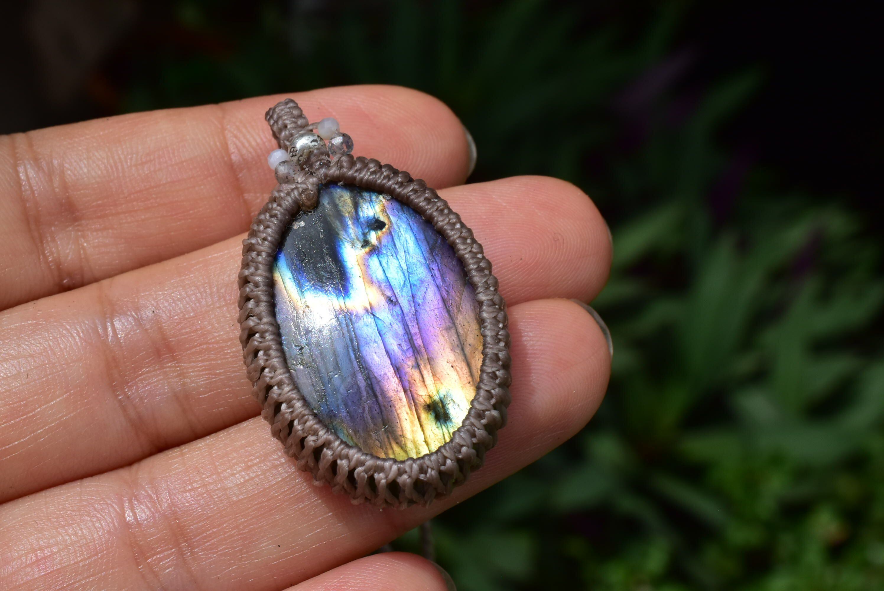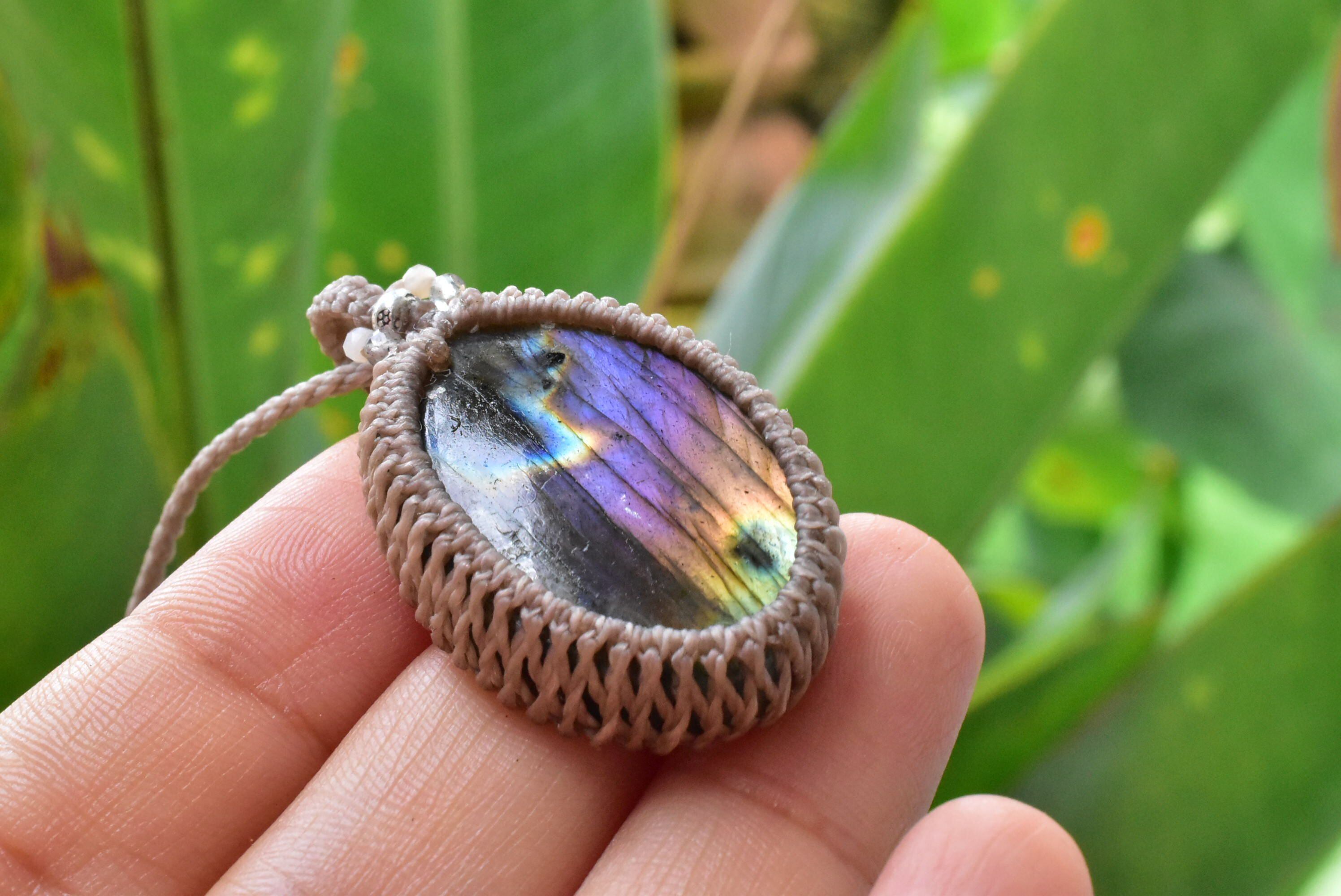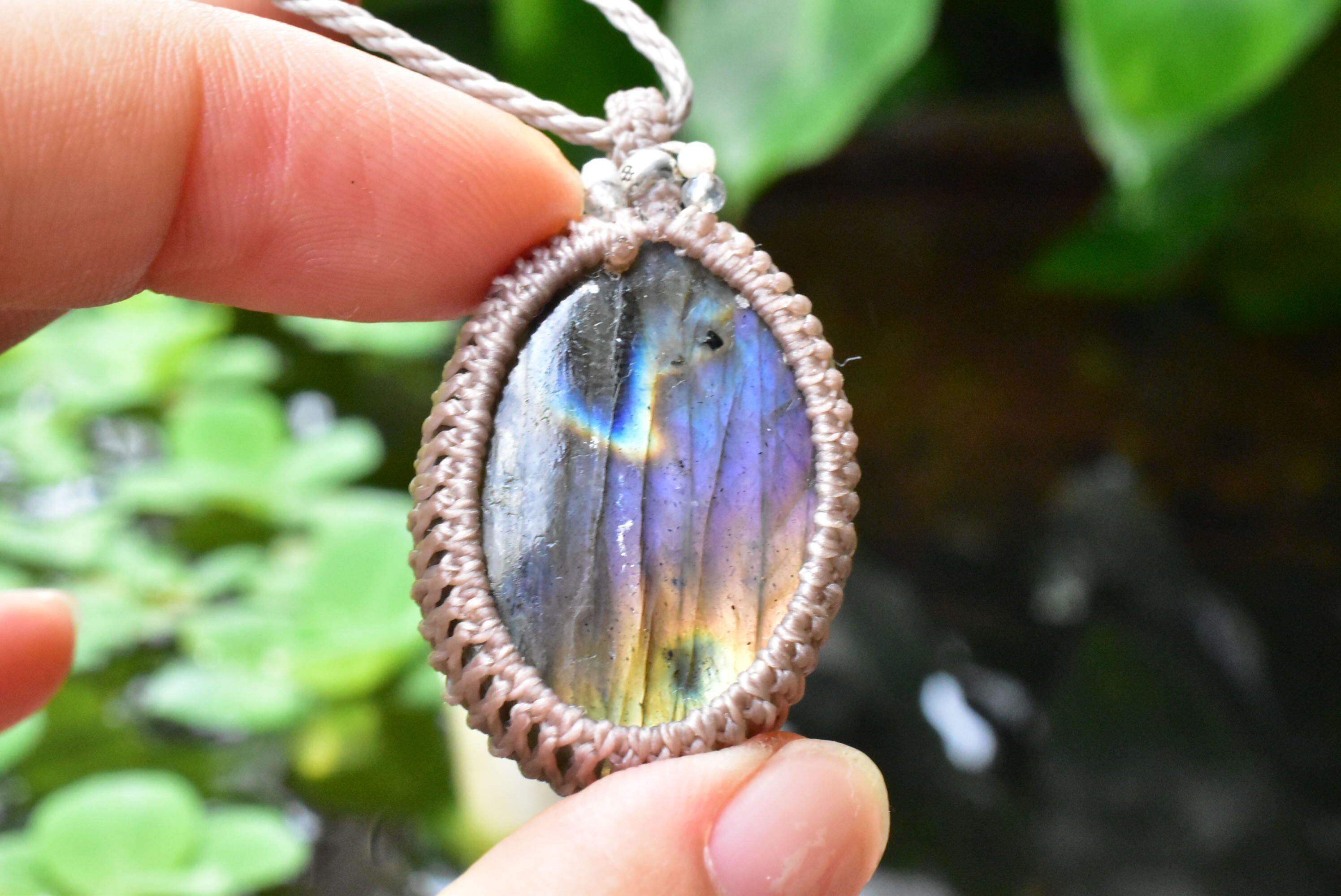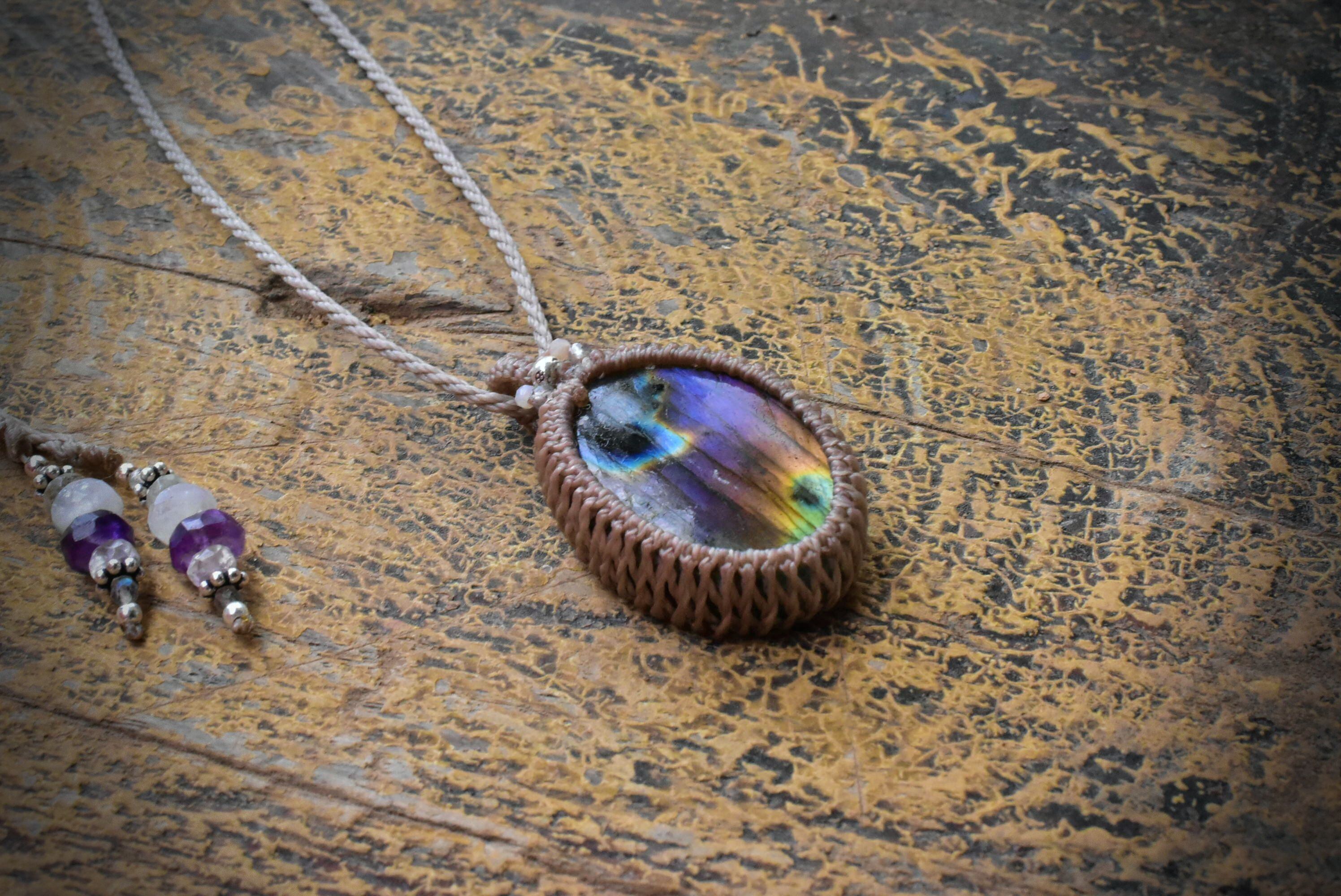 虹色オーロラ★パープルラブラドライトマクラメペンダント lay007