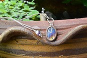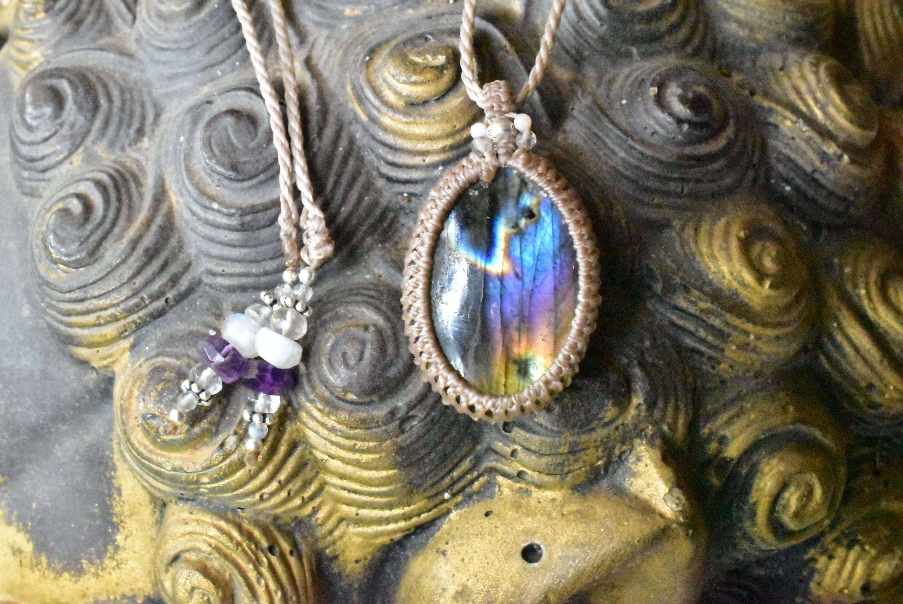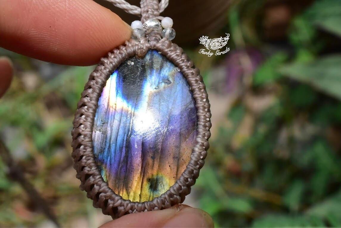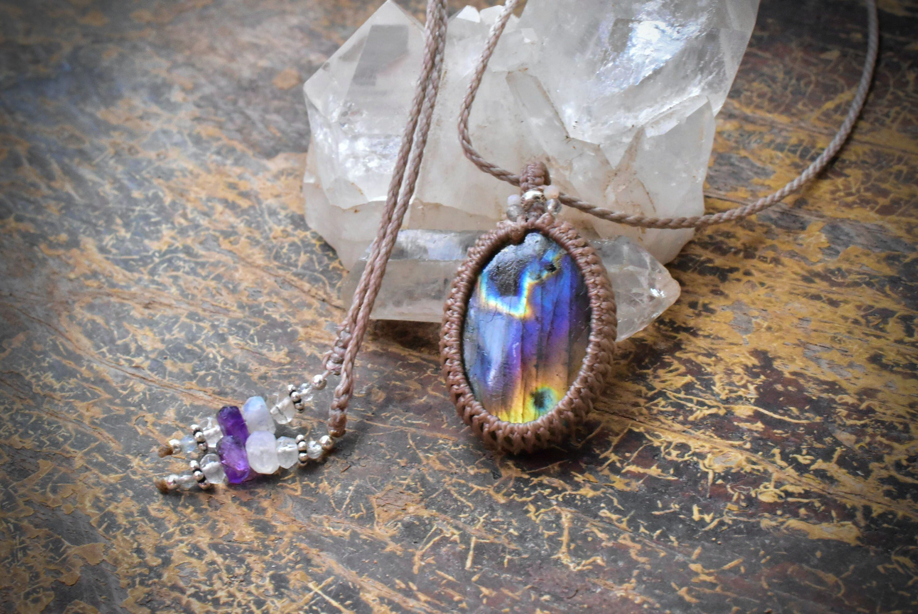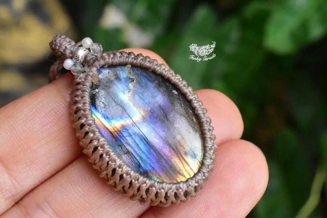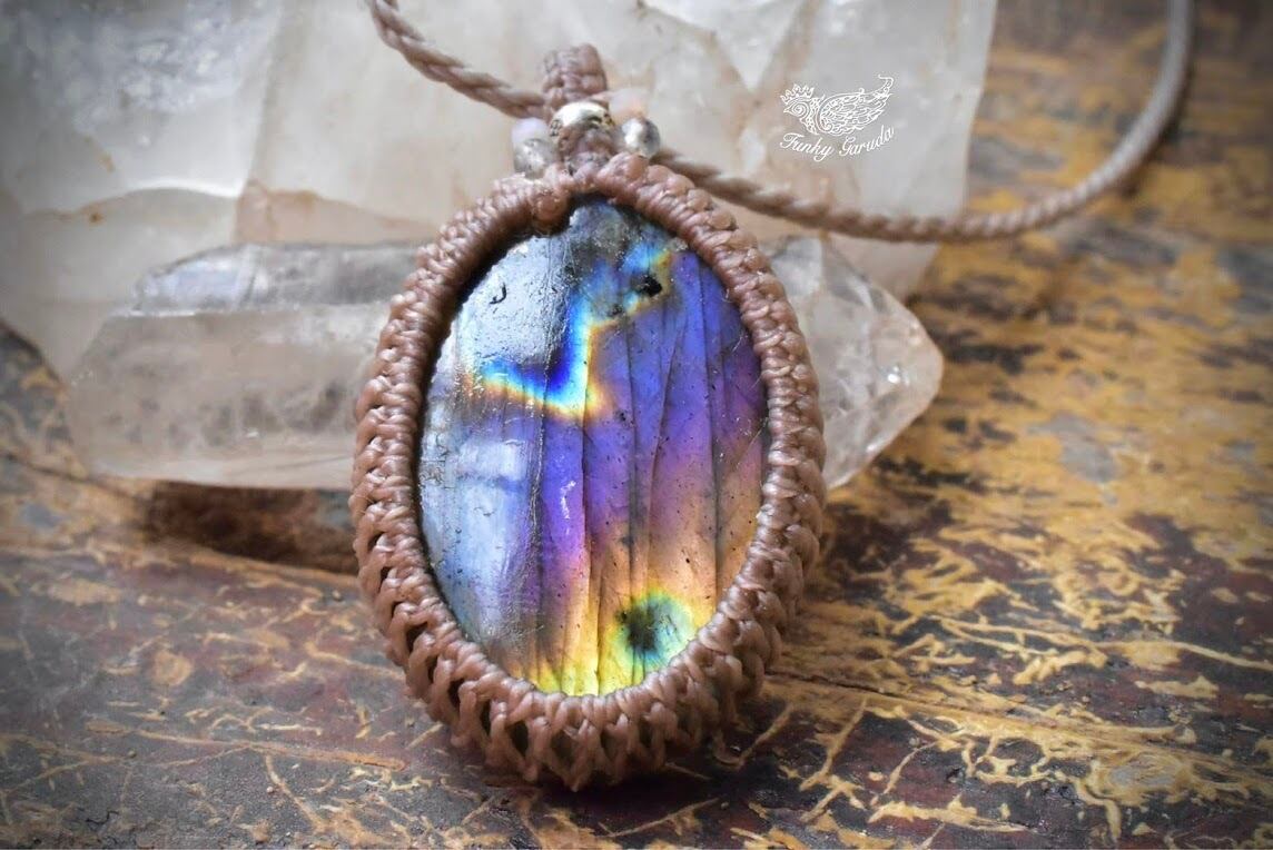 虹色オーロラ★パープルラブラドライトマクラメペンダント lay007