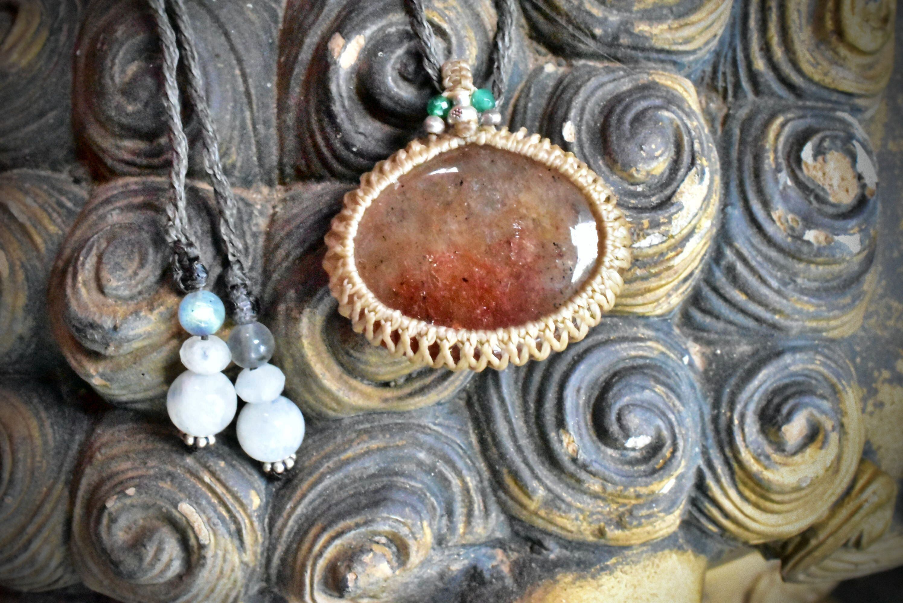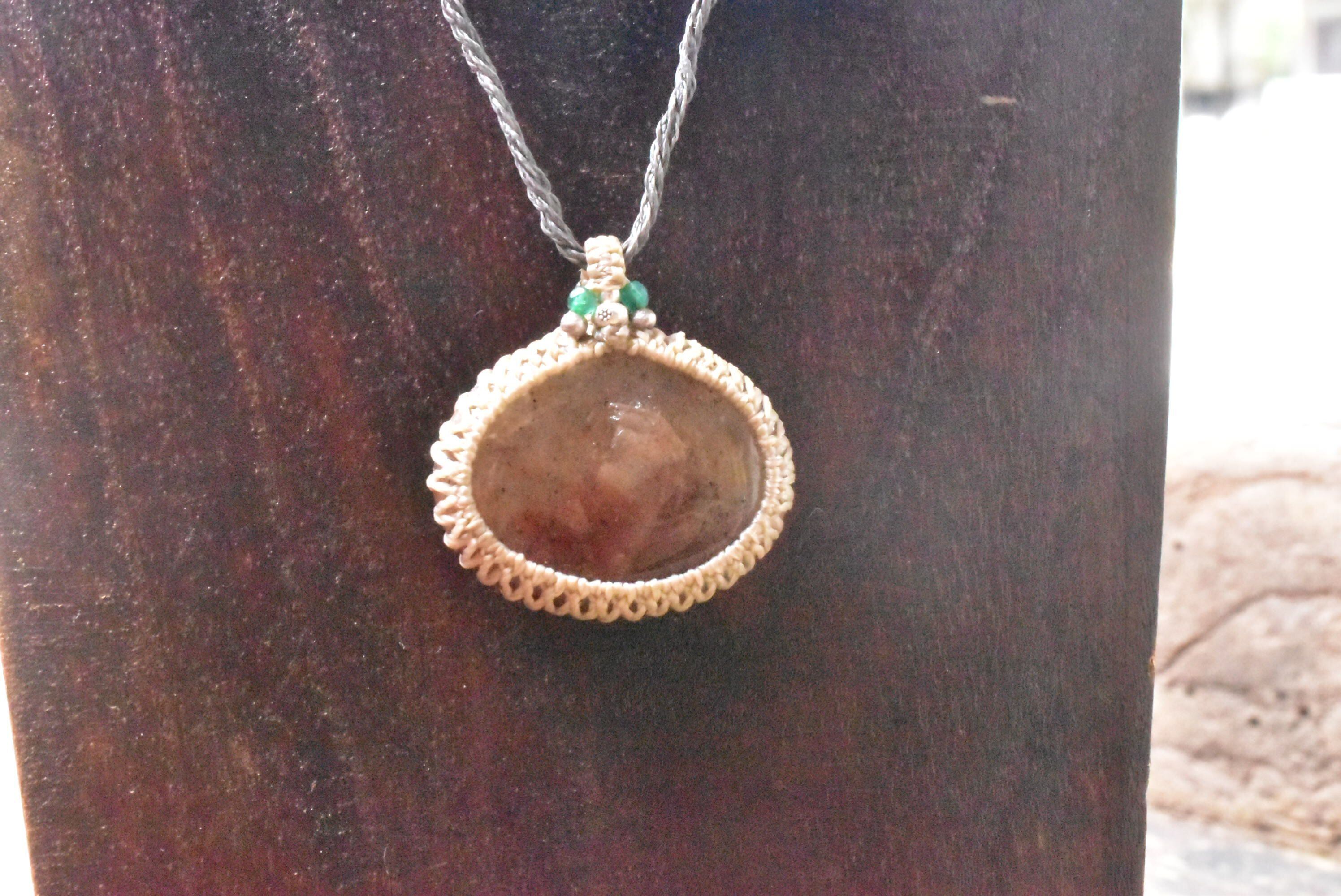 落ち着いた印象ながらも、個性的なデザインのチェリークォーツをシンプルなマクラメ編みペンダントに仕上げました。