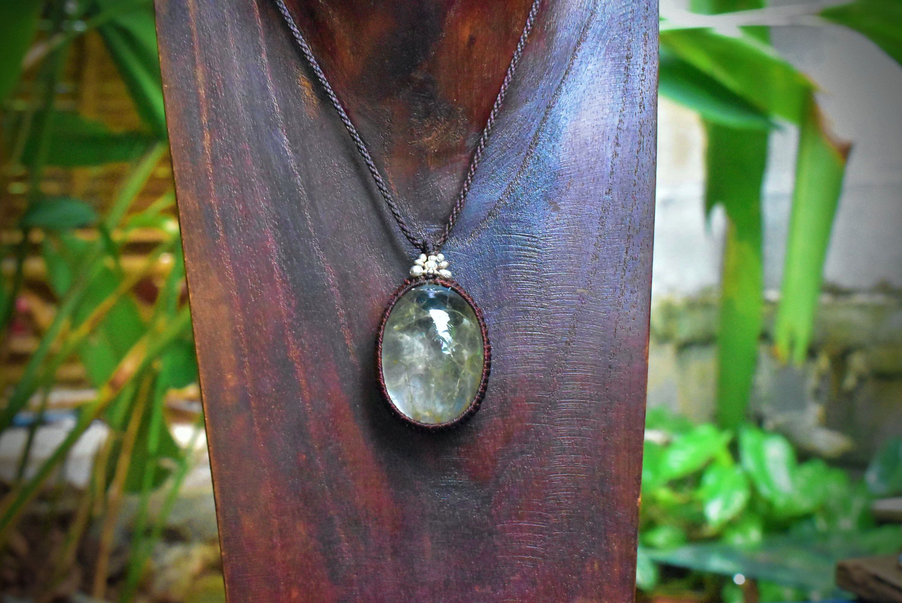 ◆このたびはダークブラウン色の蝋引き糸を使用しマクラメ編み装飾を施しました。
