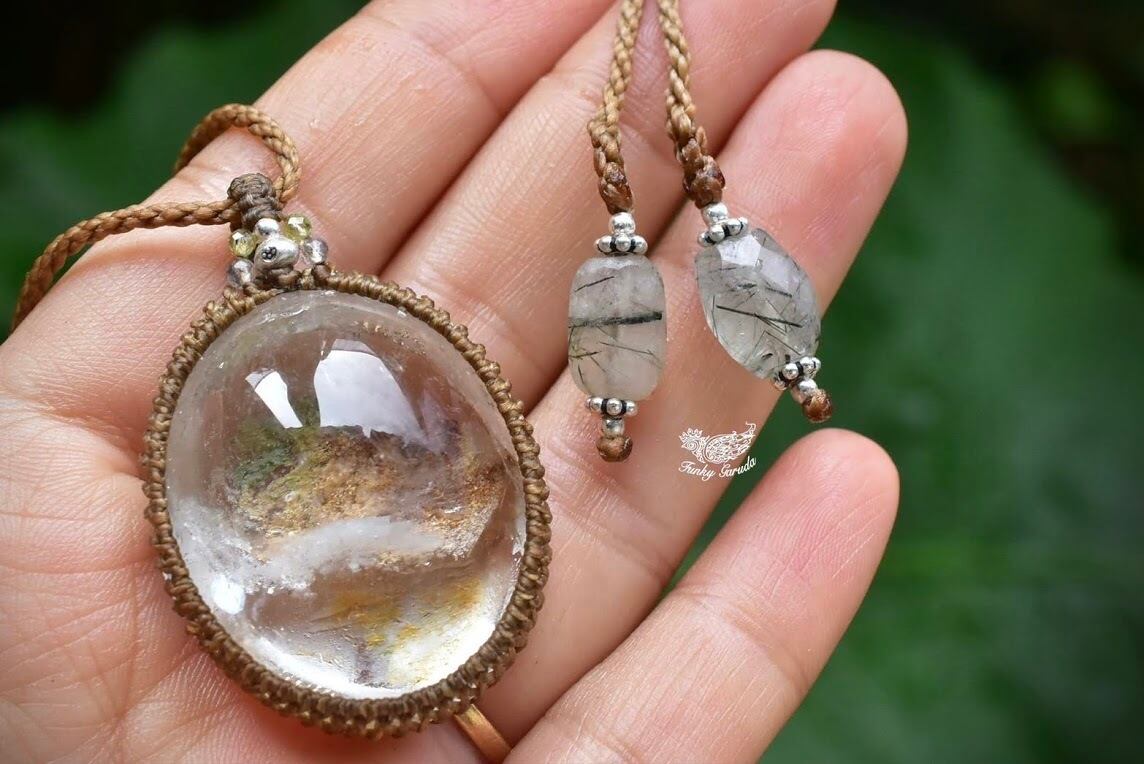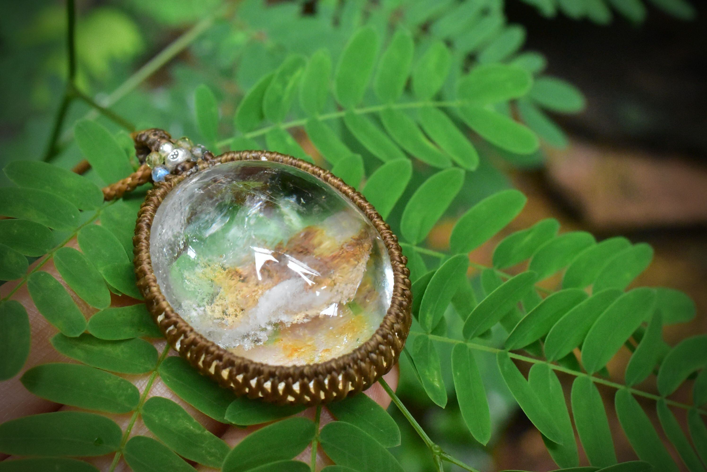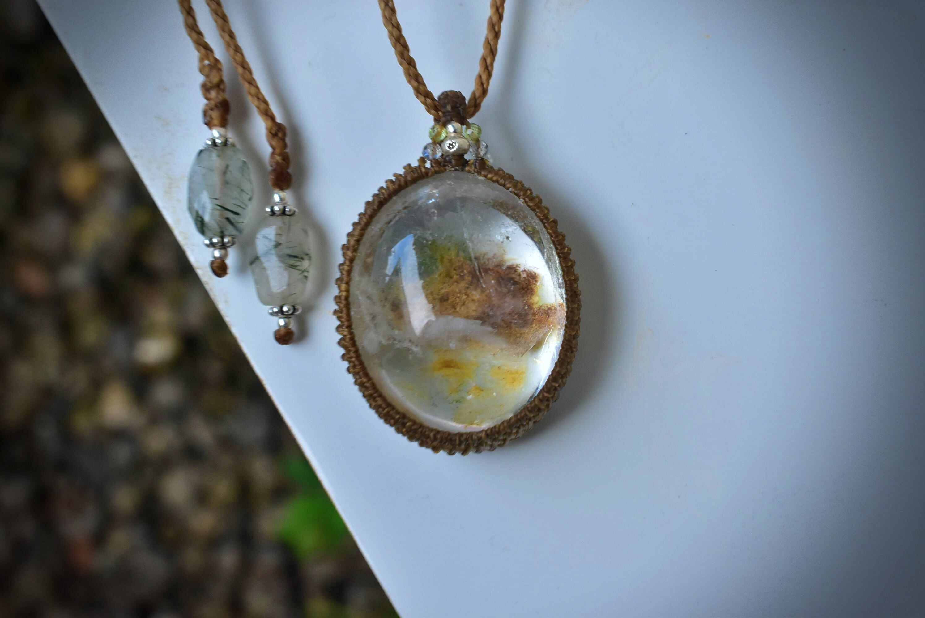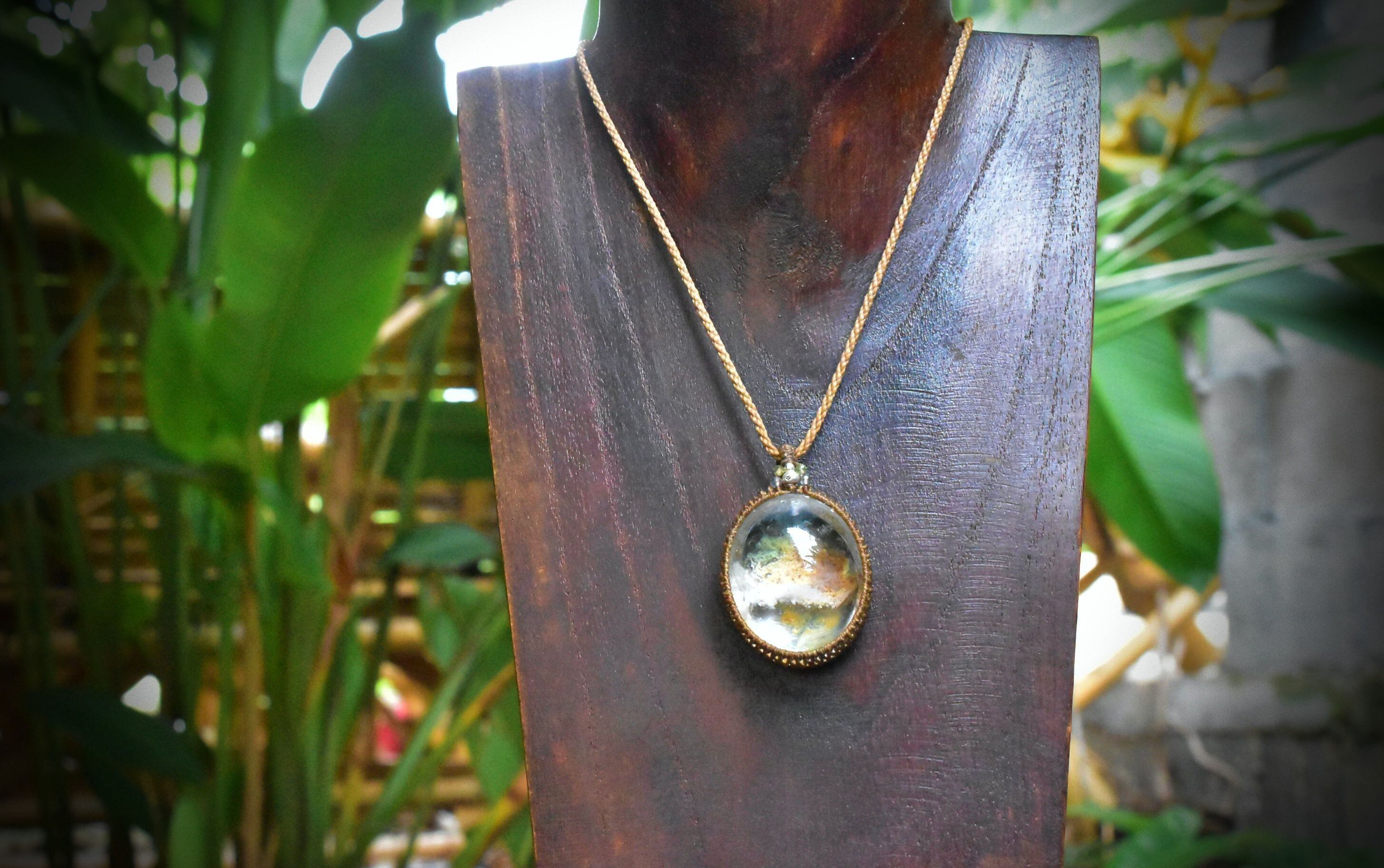 奥行感ある個性的な景色を優しく包むように、シンプルなマクラメ編みペンダントに仕上げました。
