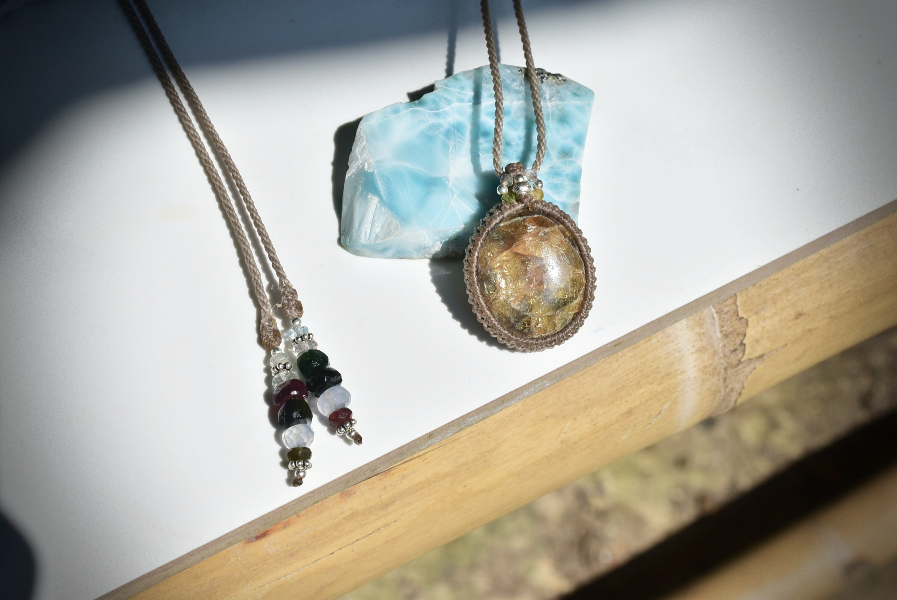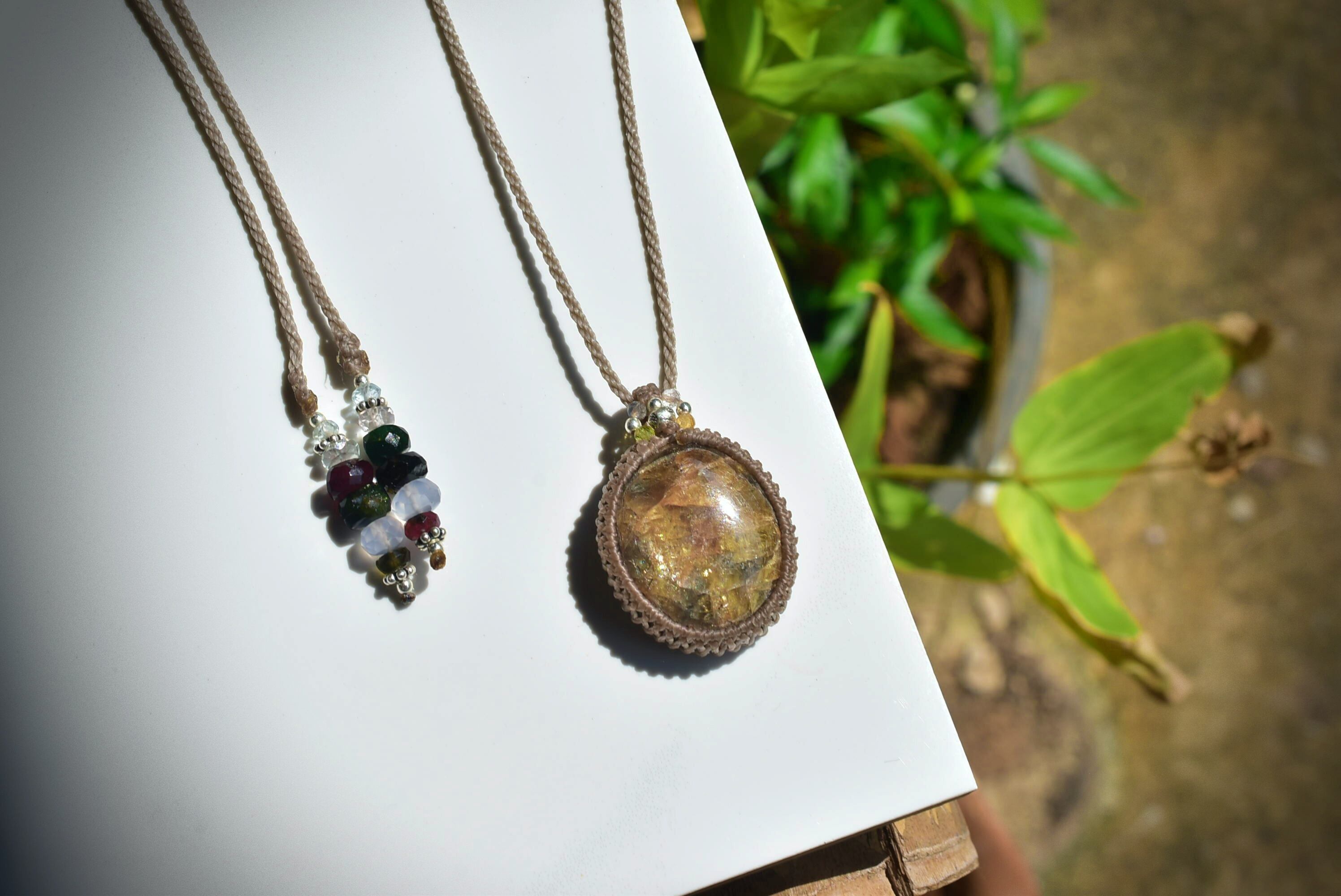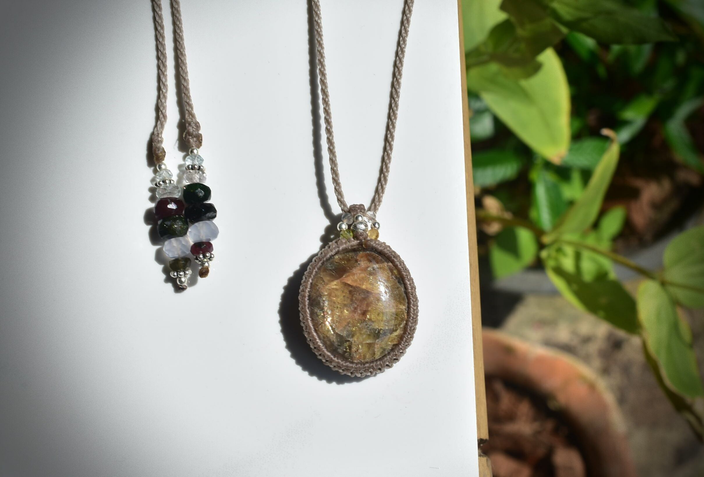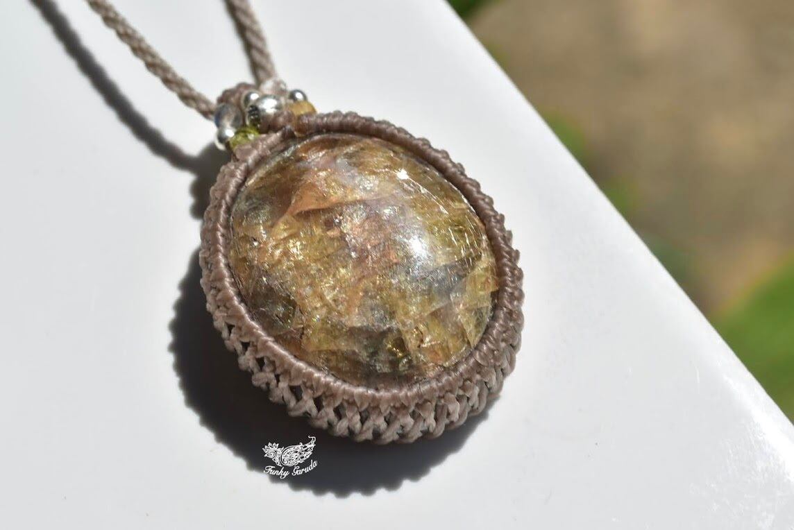 ◆このたびはカフェオレ、ヘンプ色の蝋引き糸を使用しマクラメ編み装飾を施しました。