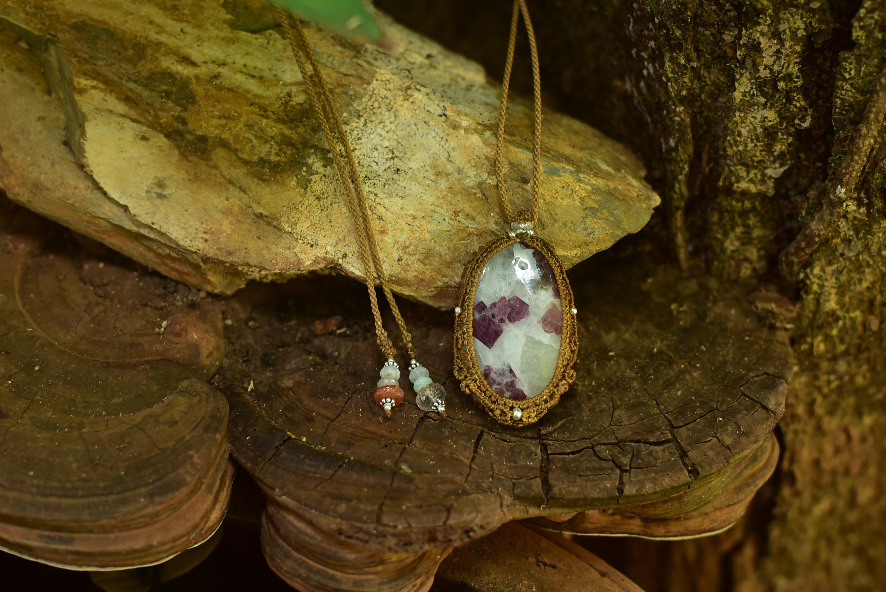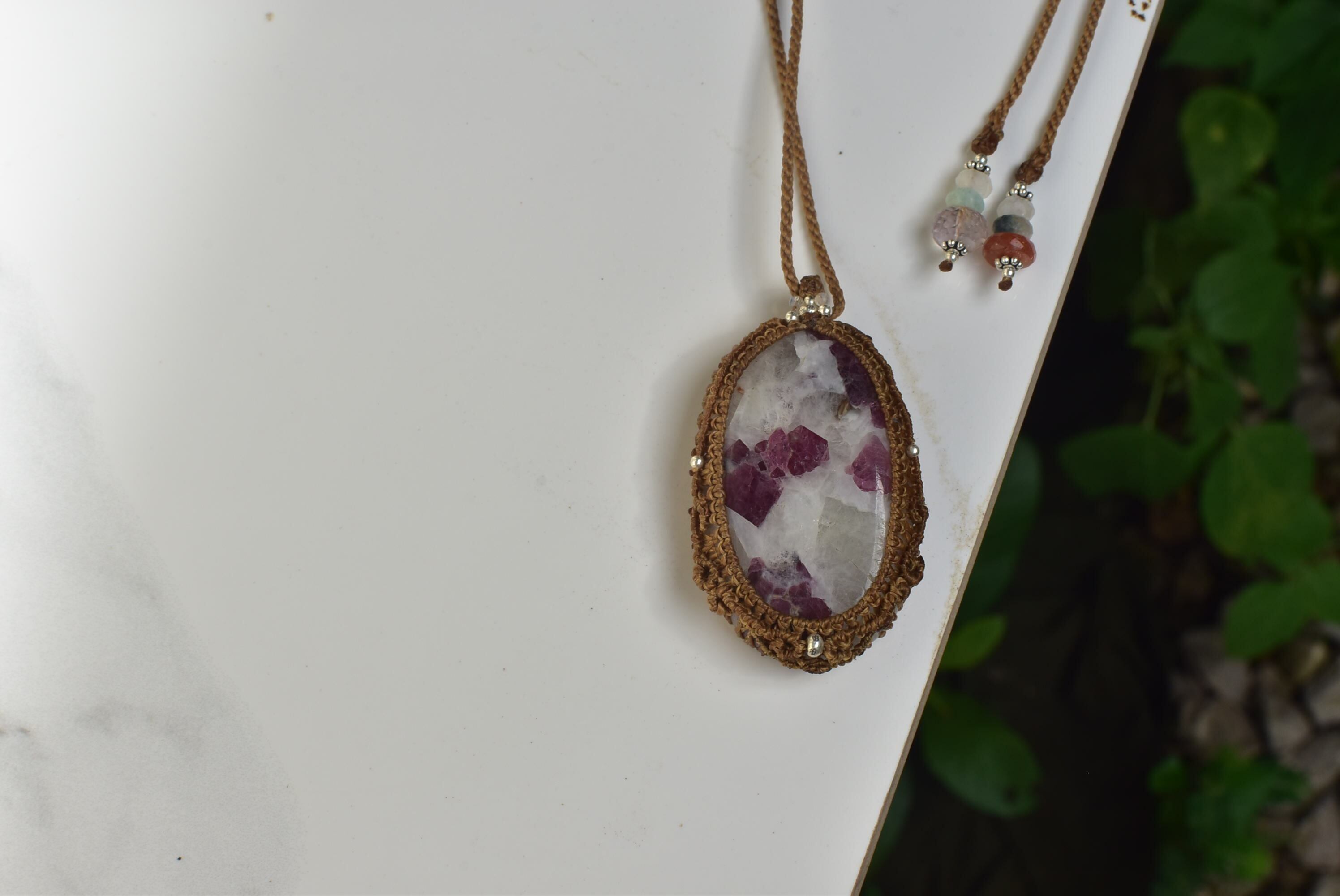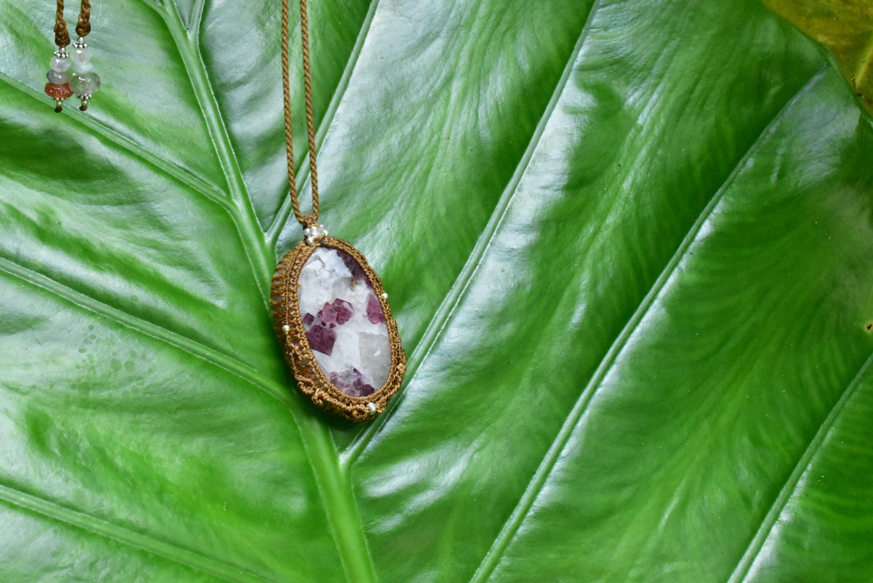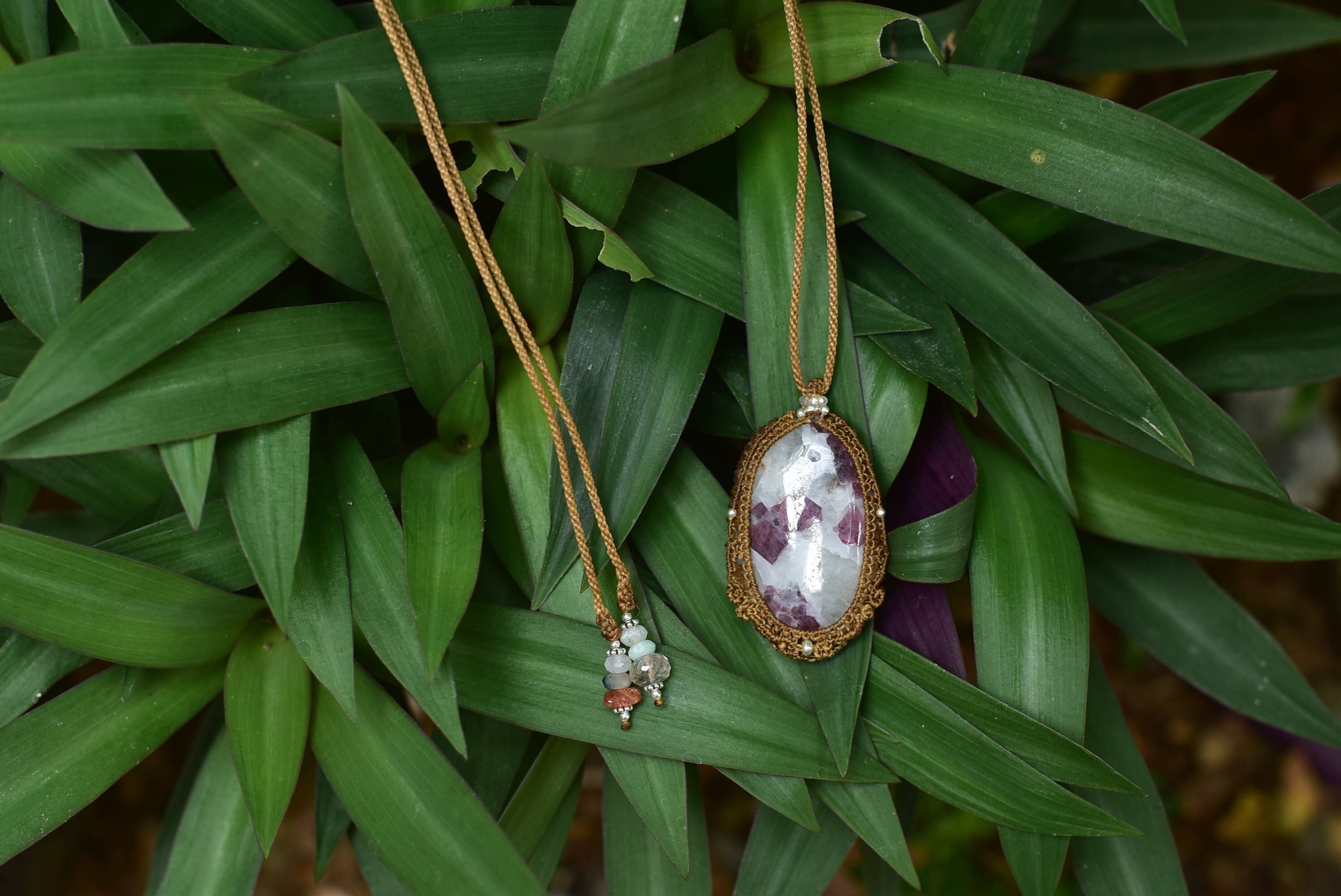 ◆このたびはゴールドブラウン色の蝋引き糸を使用しマクラメ編み装飾を施しました。