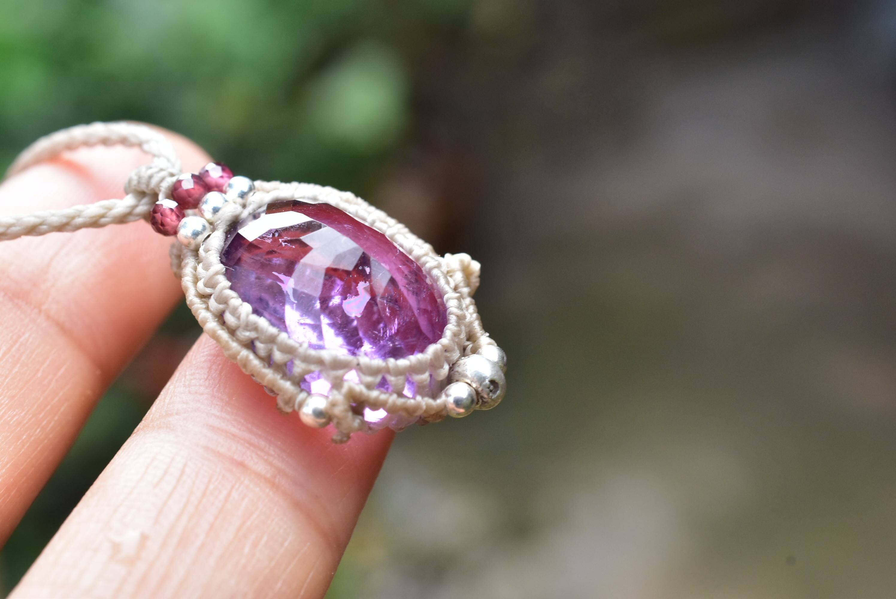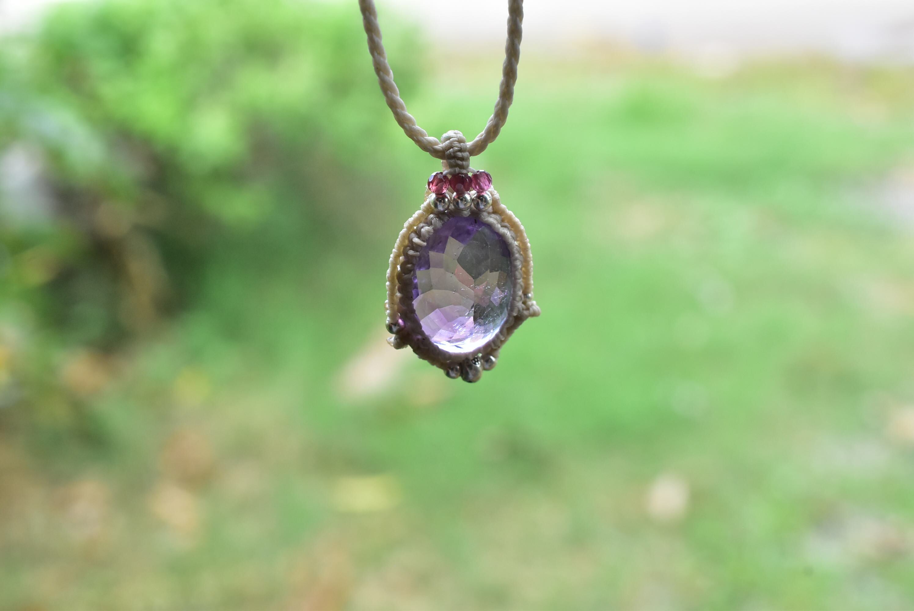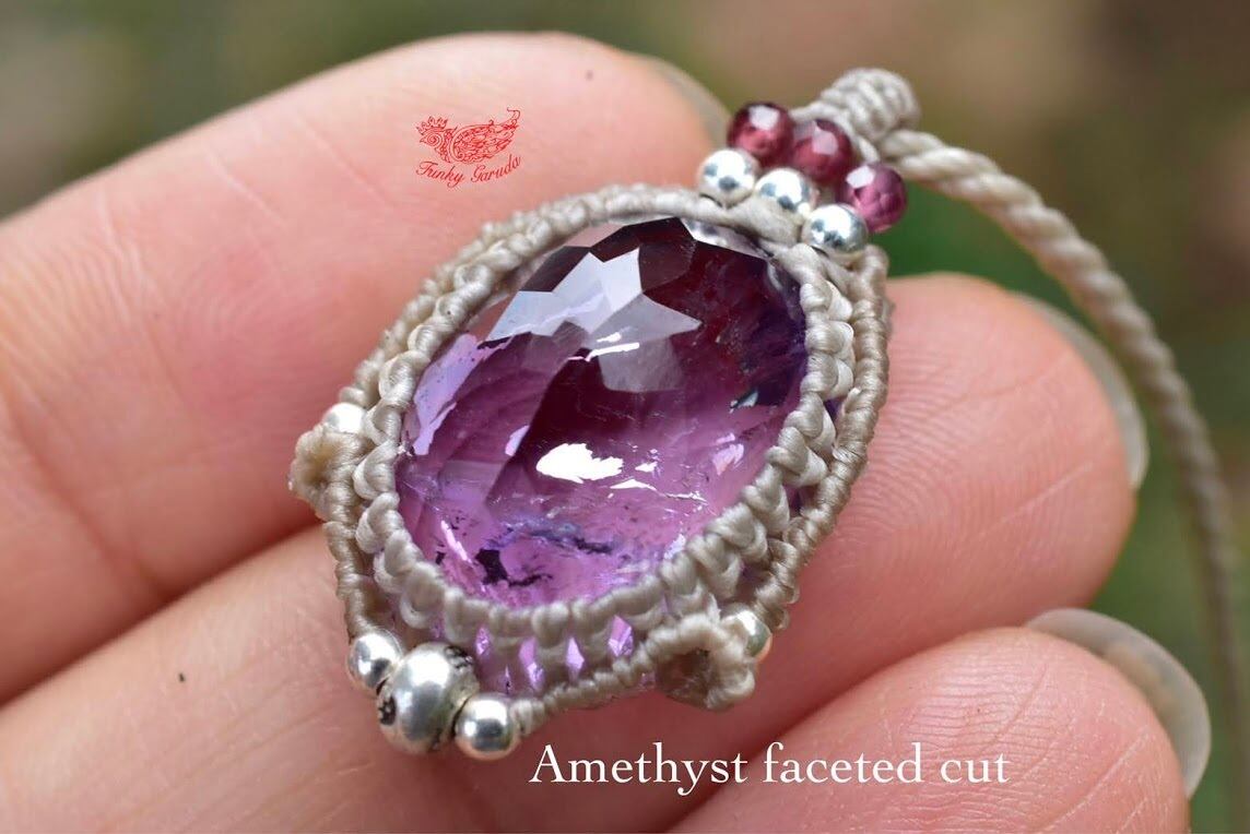 煌めく虹入り★14ct ファセットカット アメジスト マクラメペンダントame006
