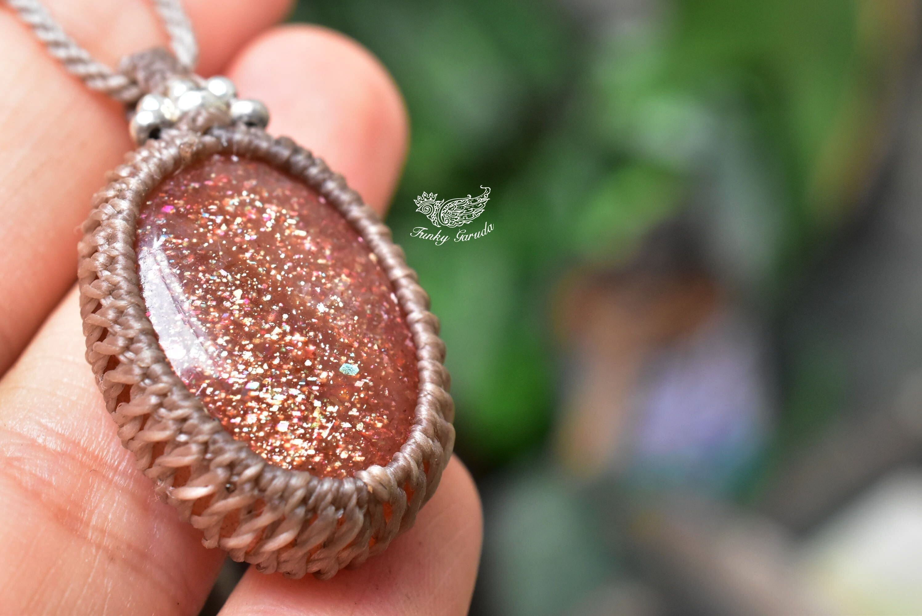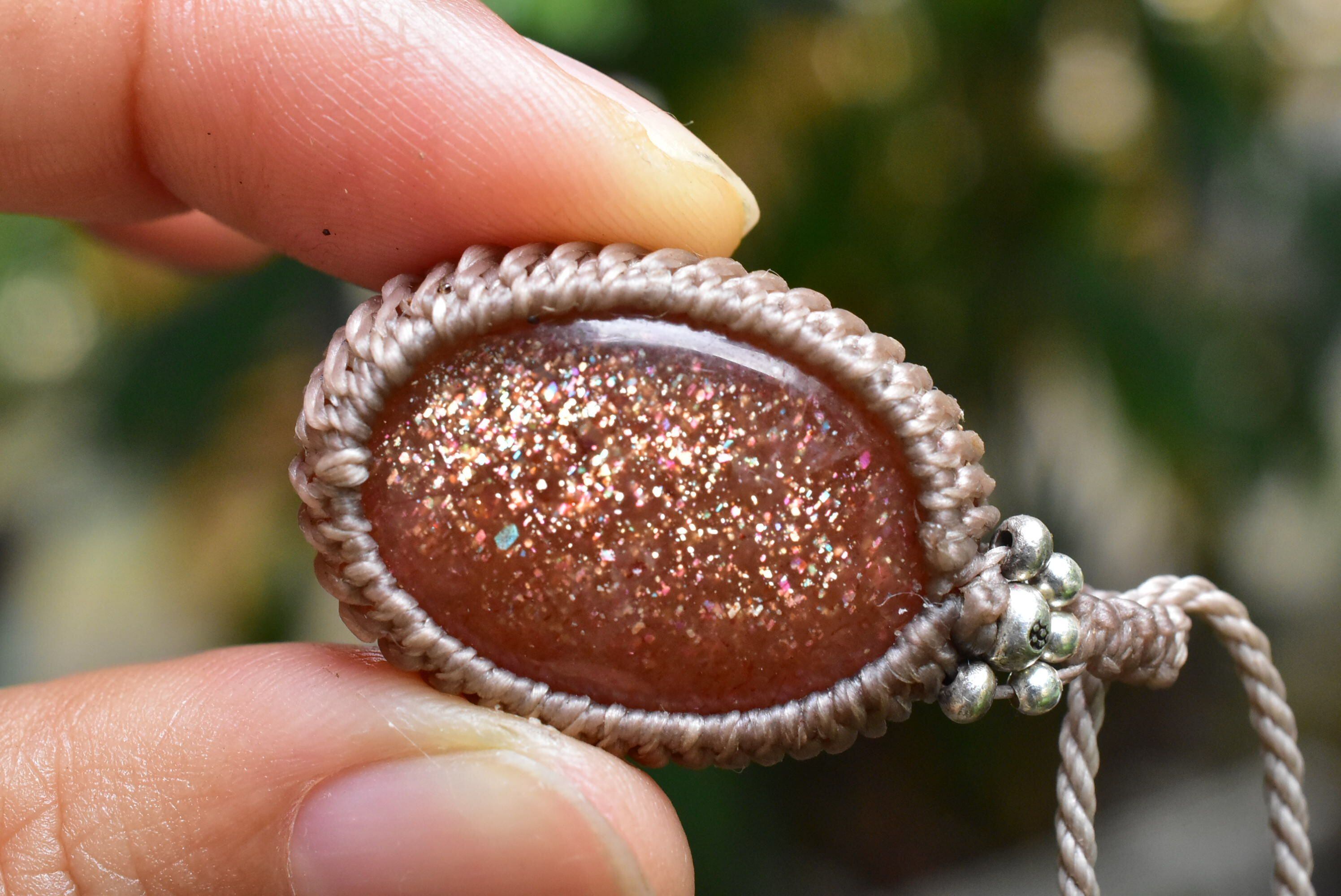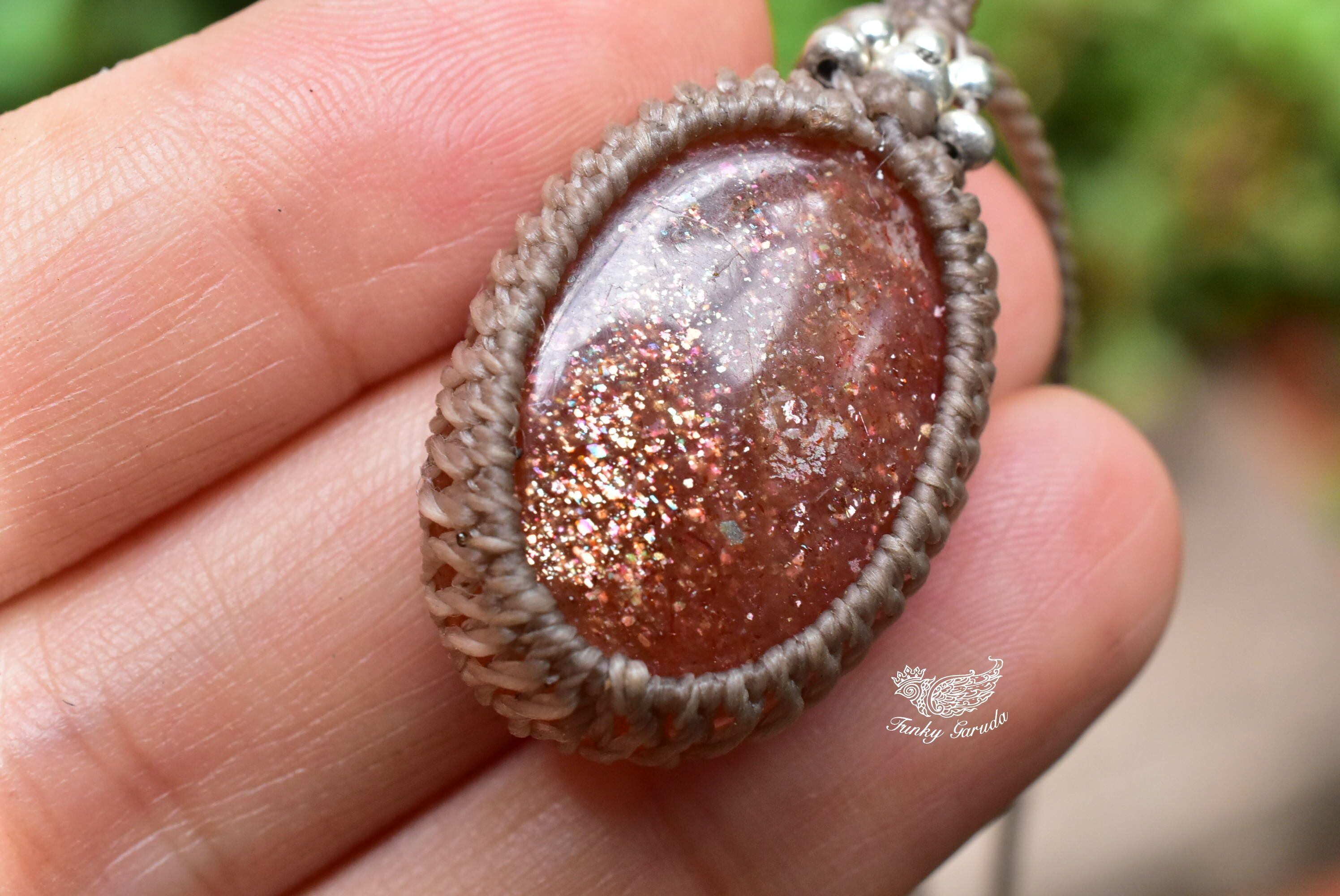 サンストーンのメタリックな煌めきを包み込むようシンプルなマクラメペンダントに仕上げました。