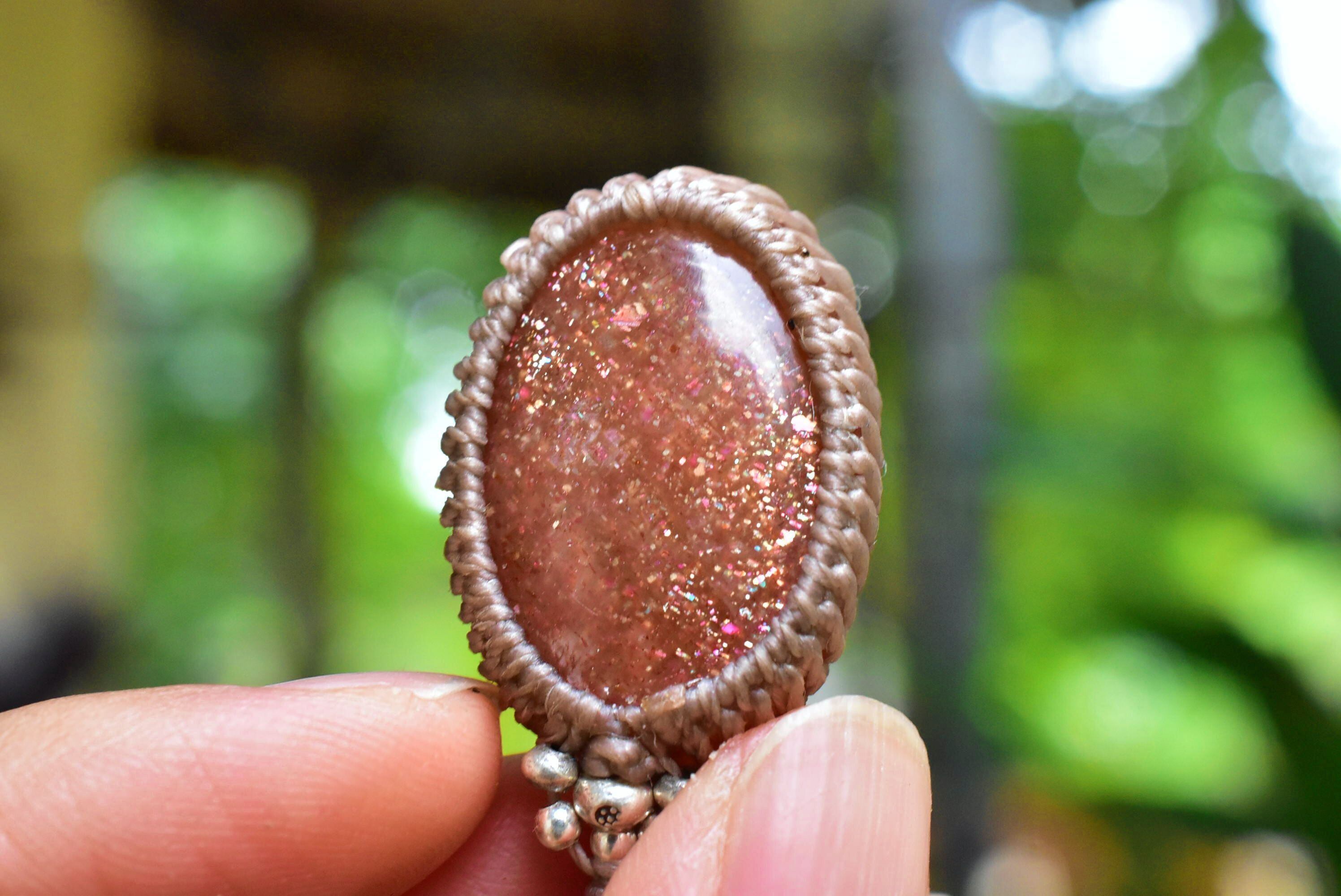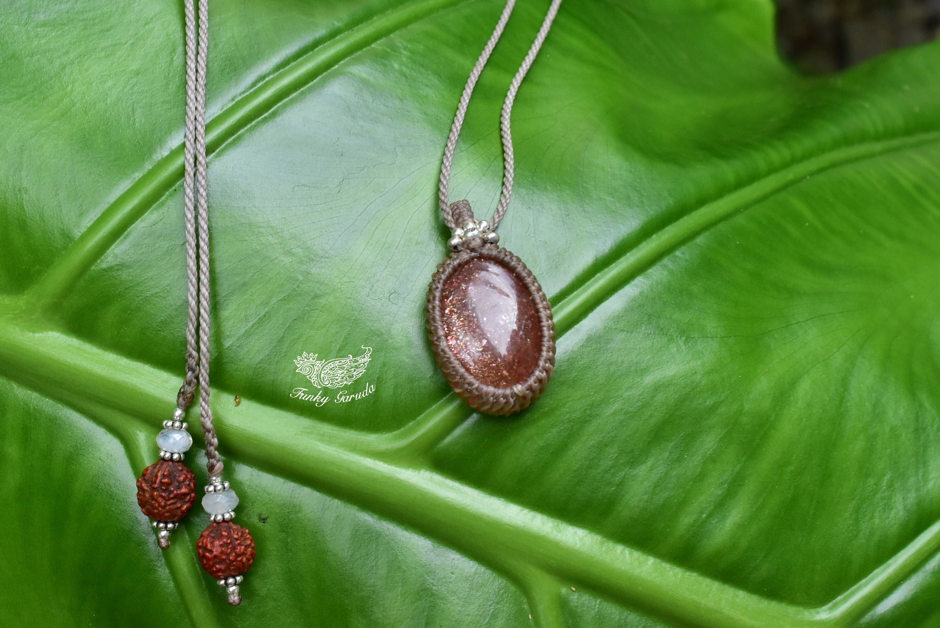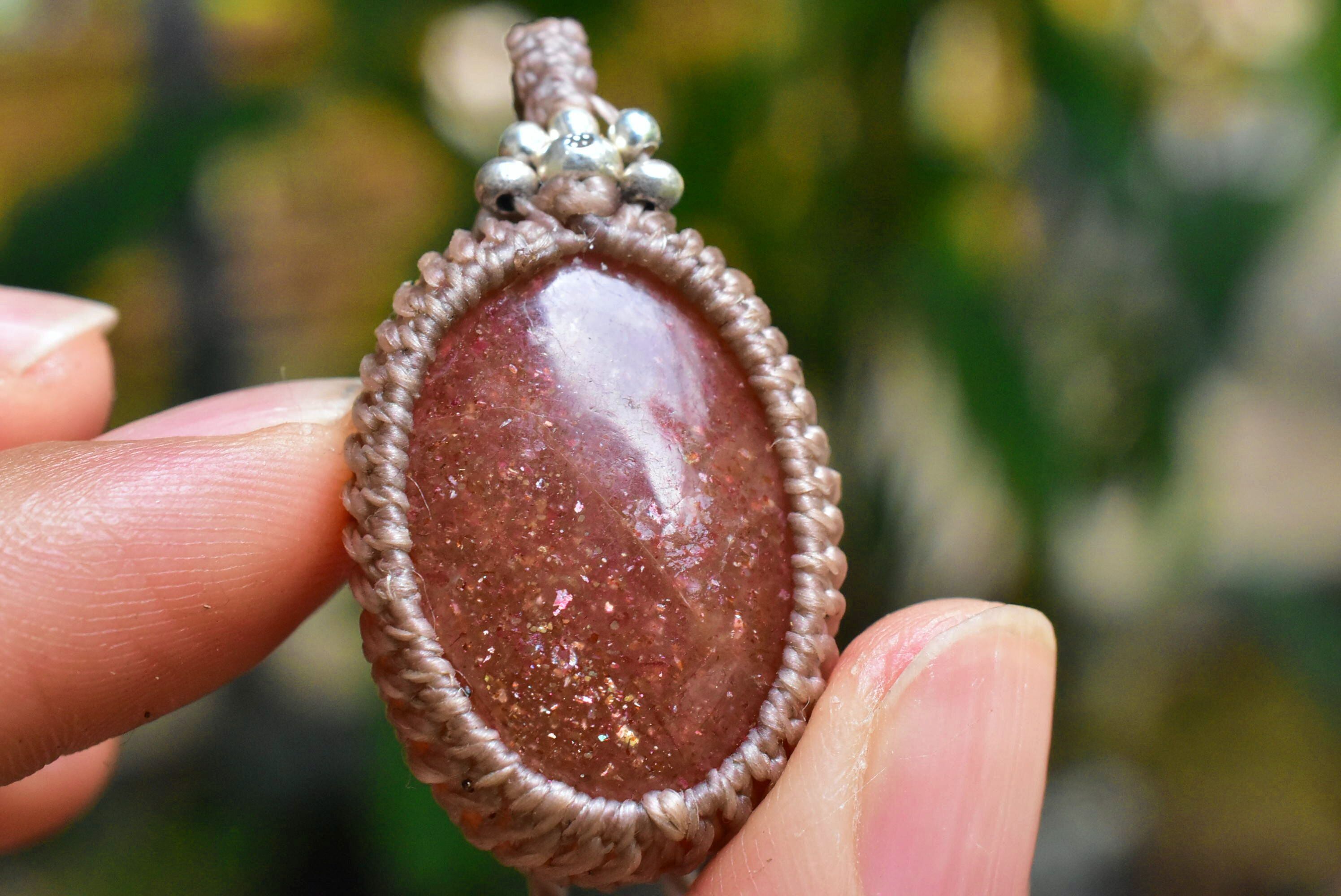 サンストーンのメタリックな煌めきを包み込むようシンプルなマクラメペンダントに仕上げました。