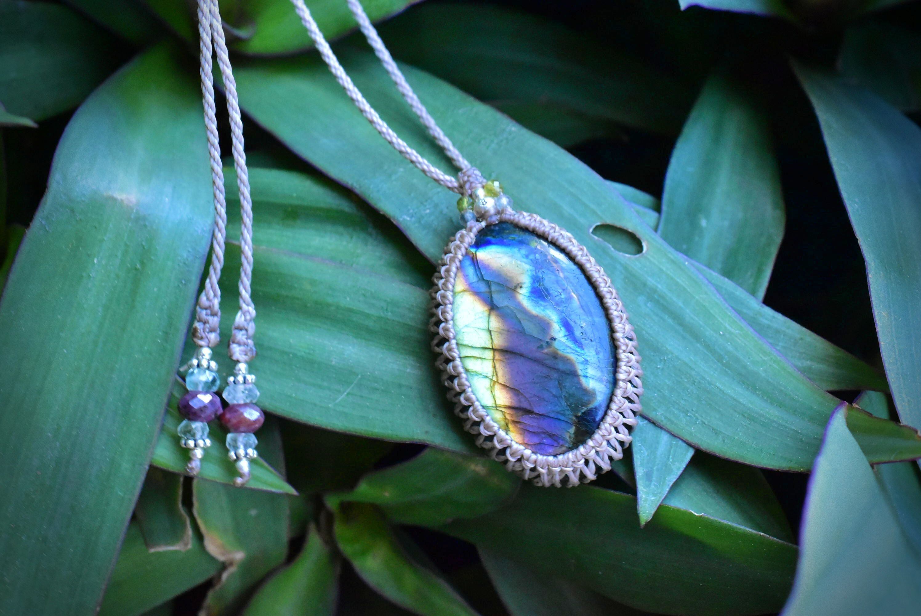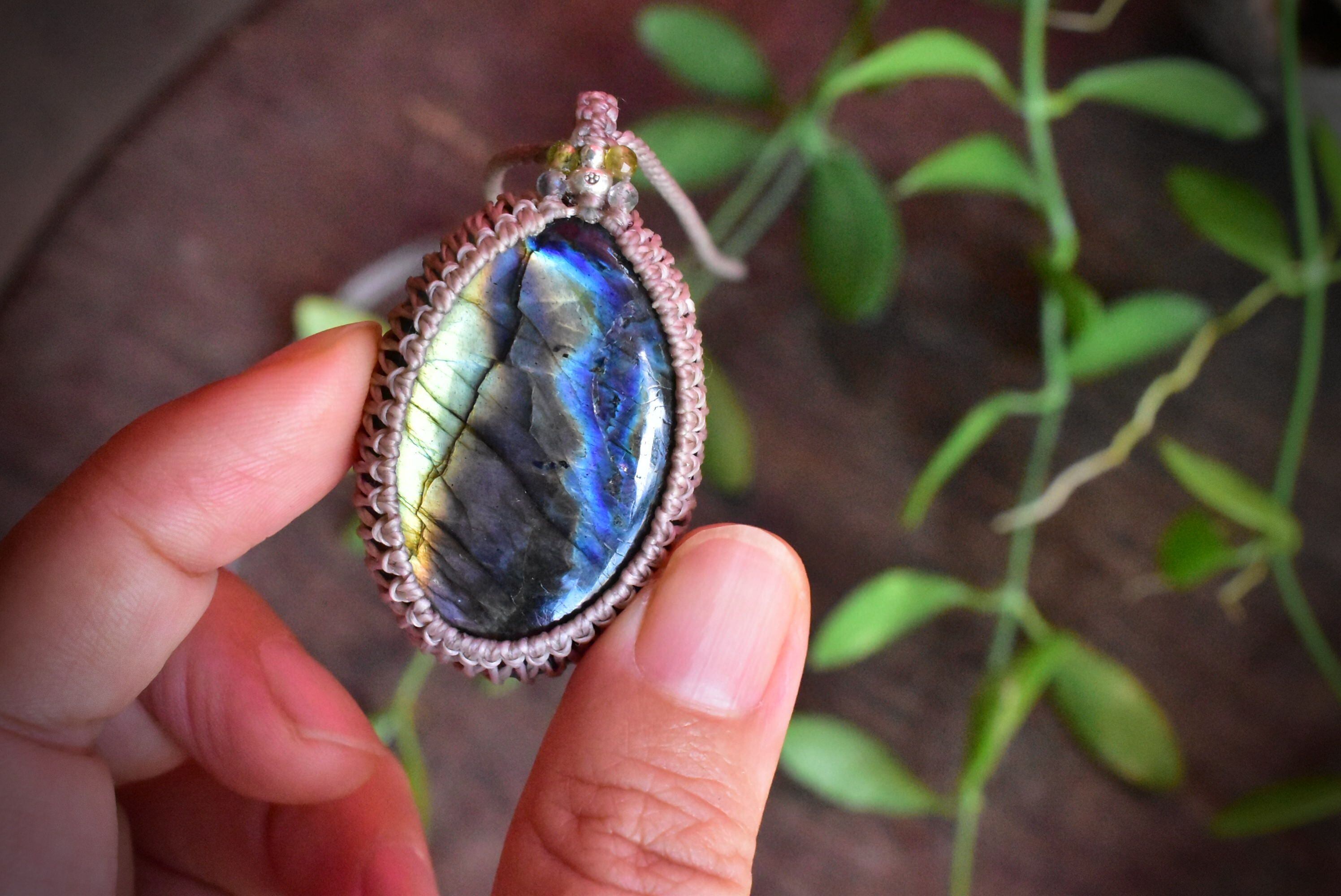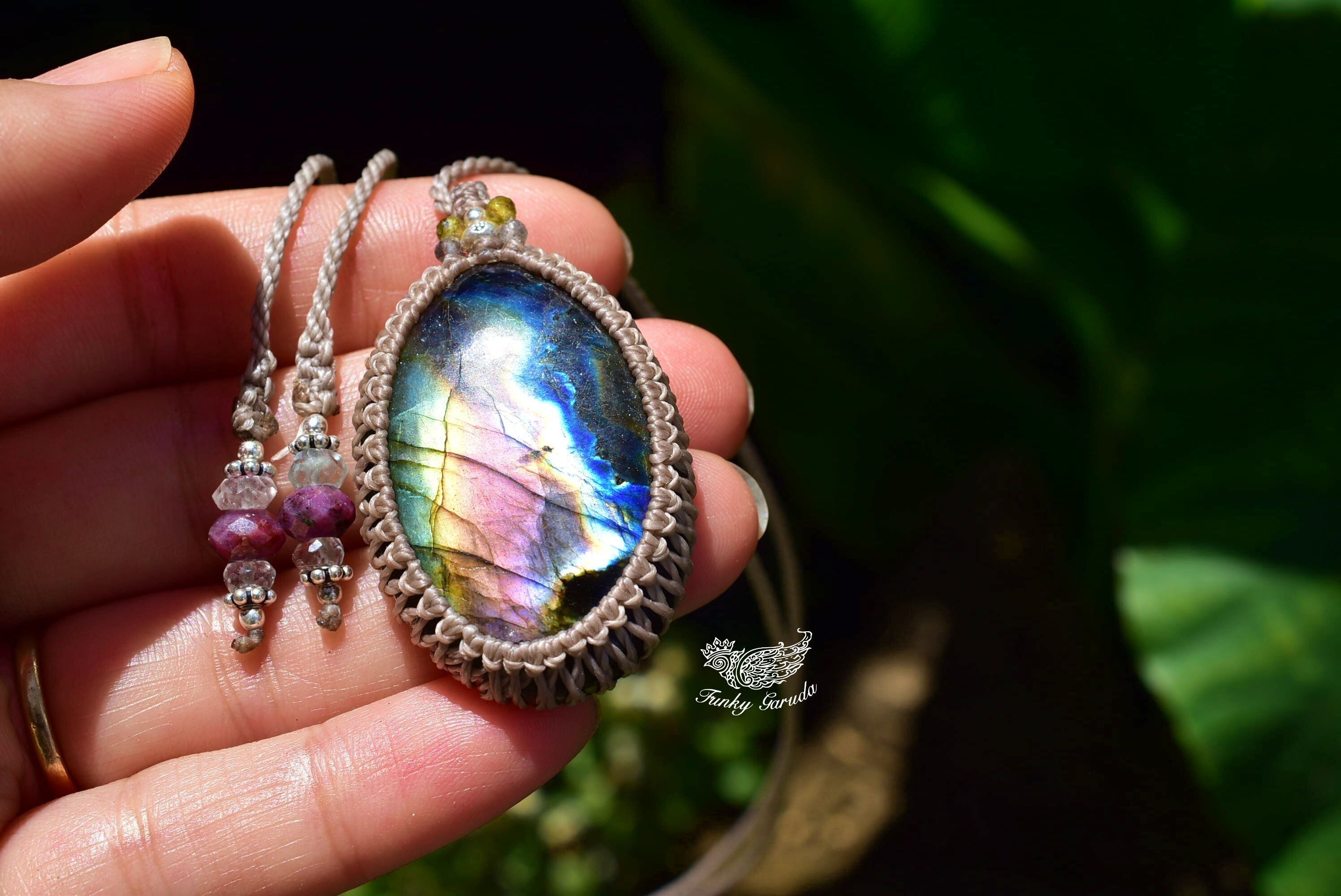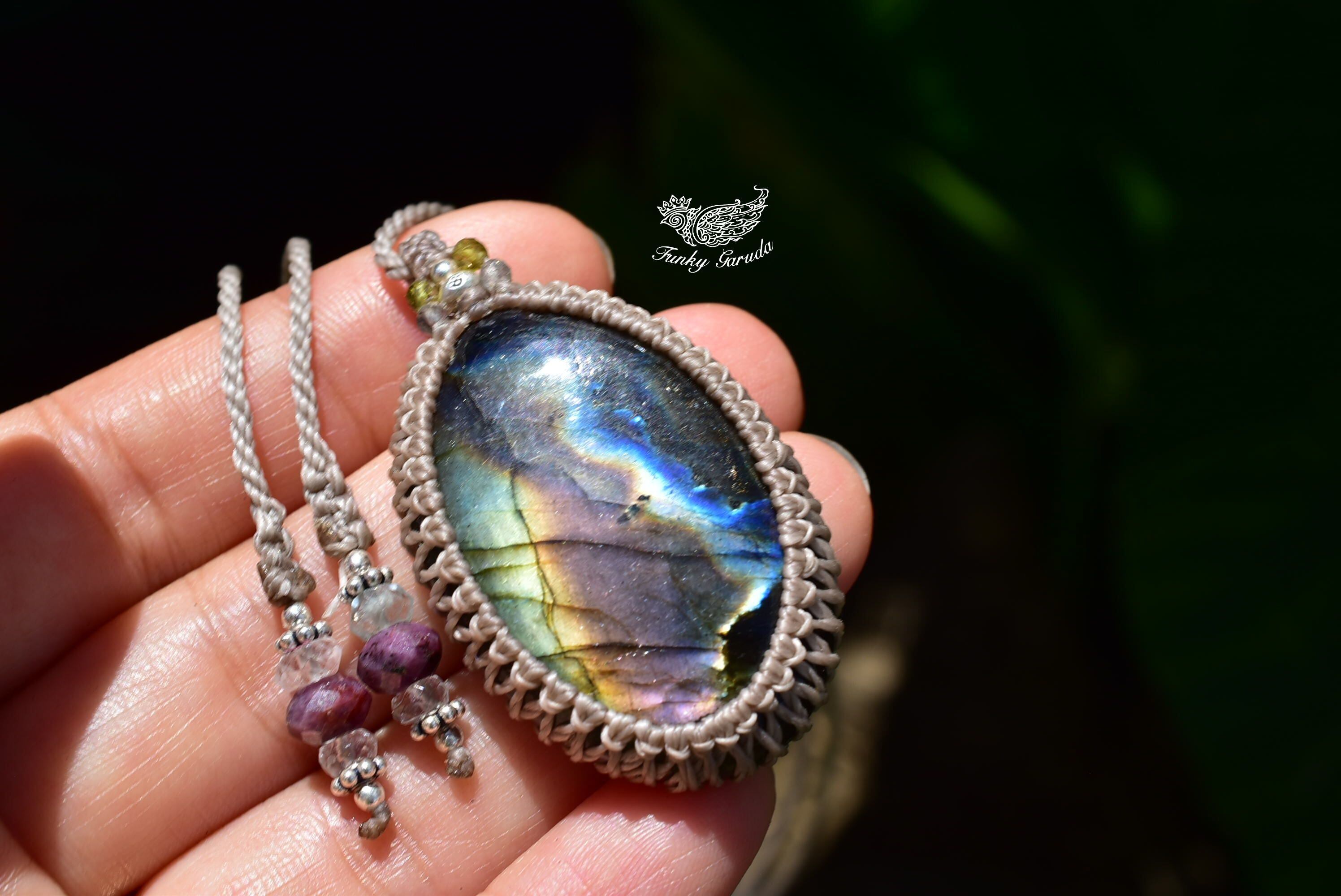 眩い光のベール★高品質マルチカラーパープルラブラドライト マクラメペンダント lay010