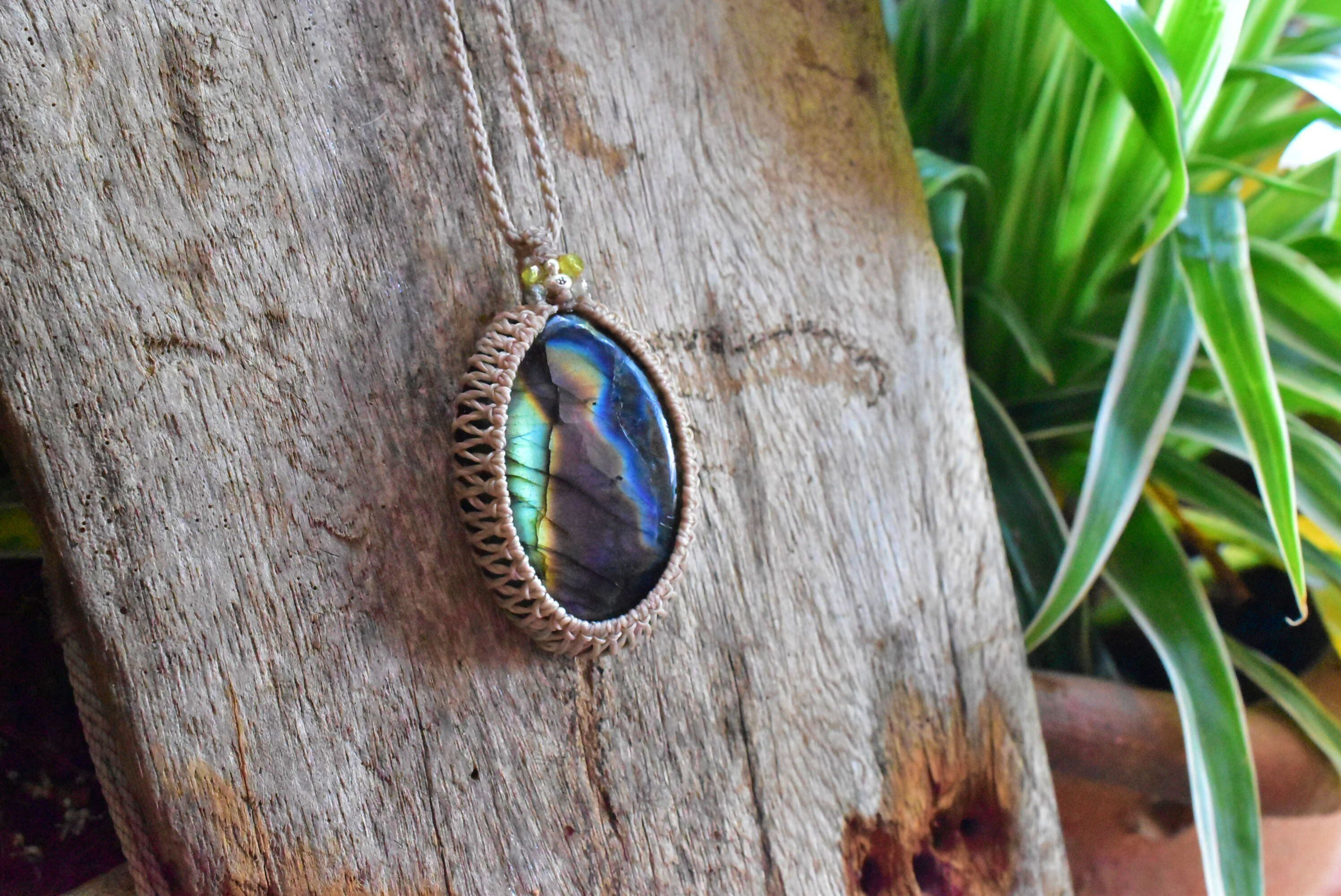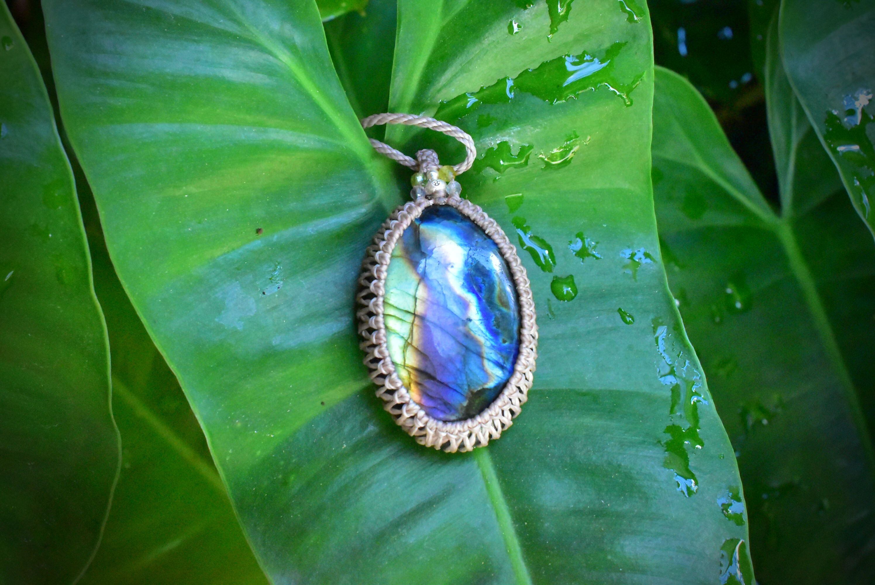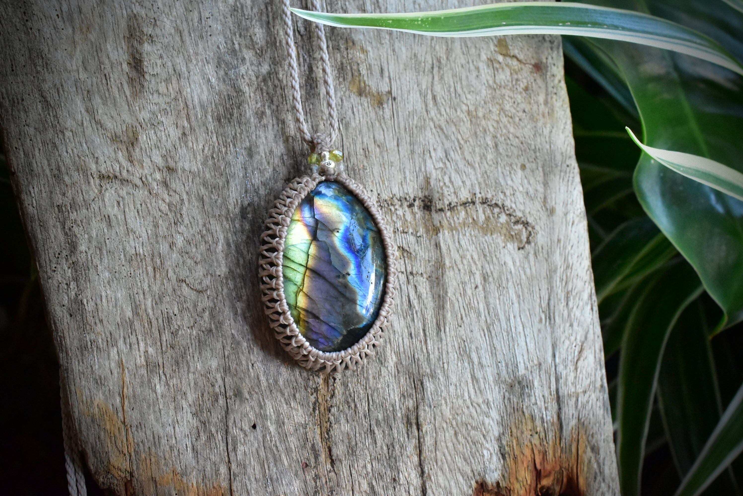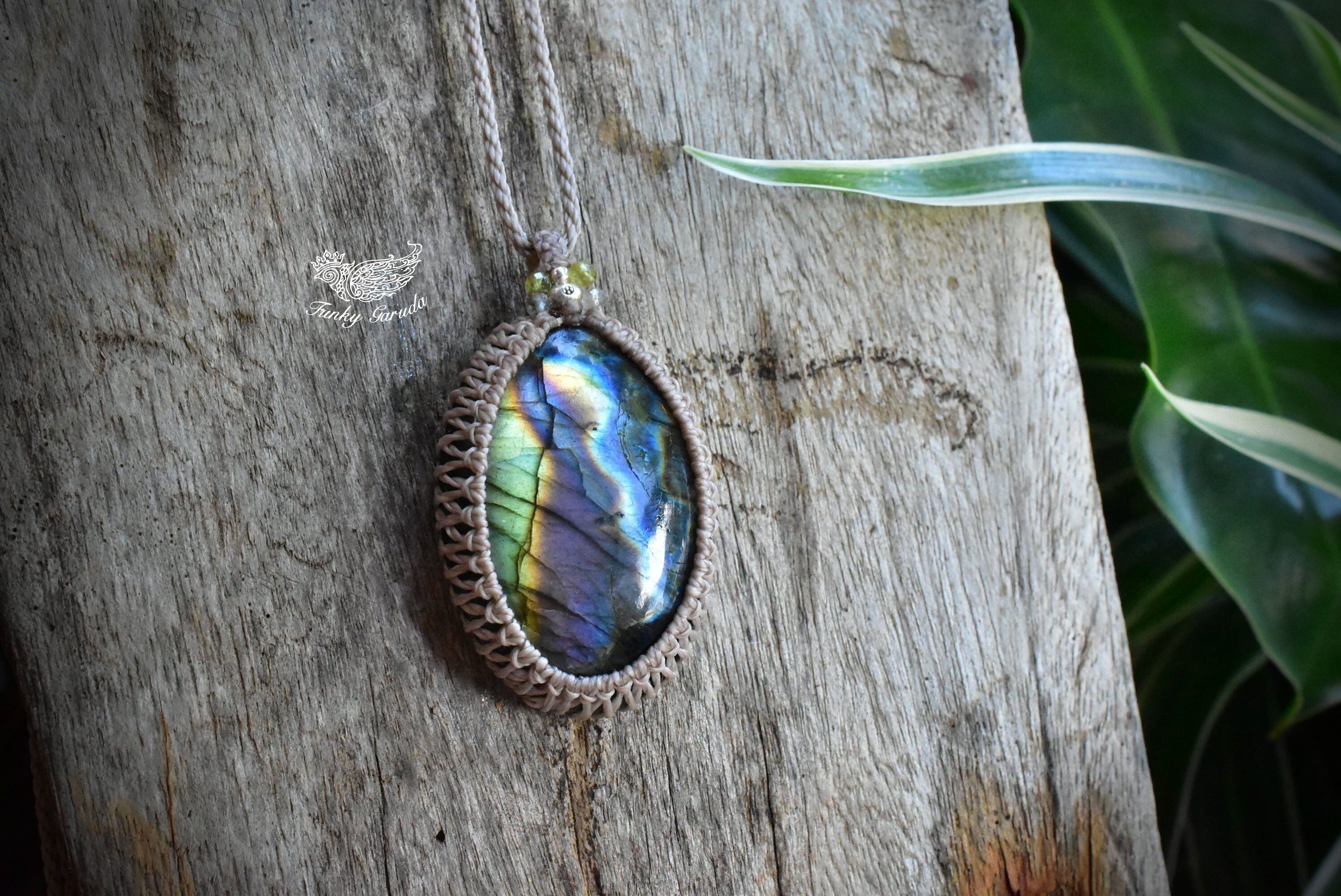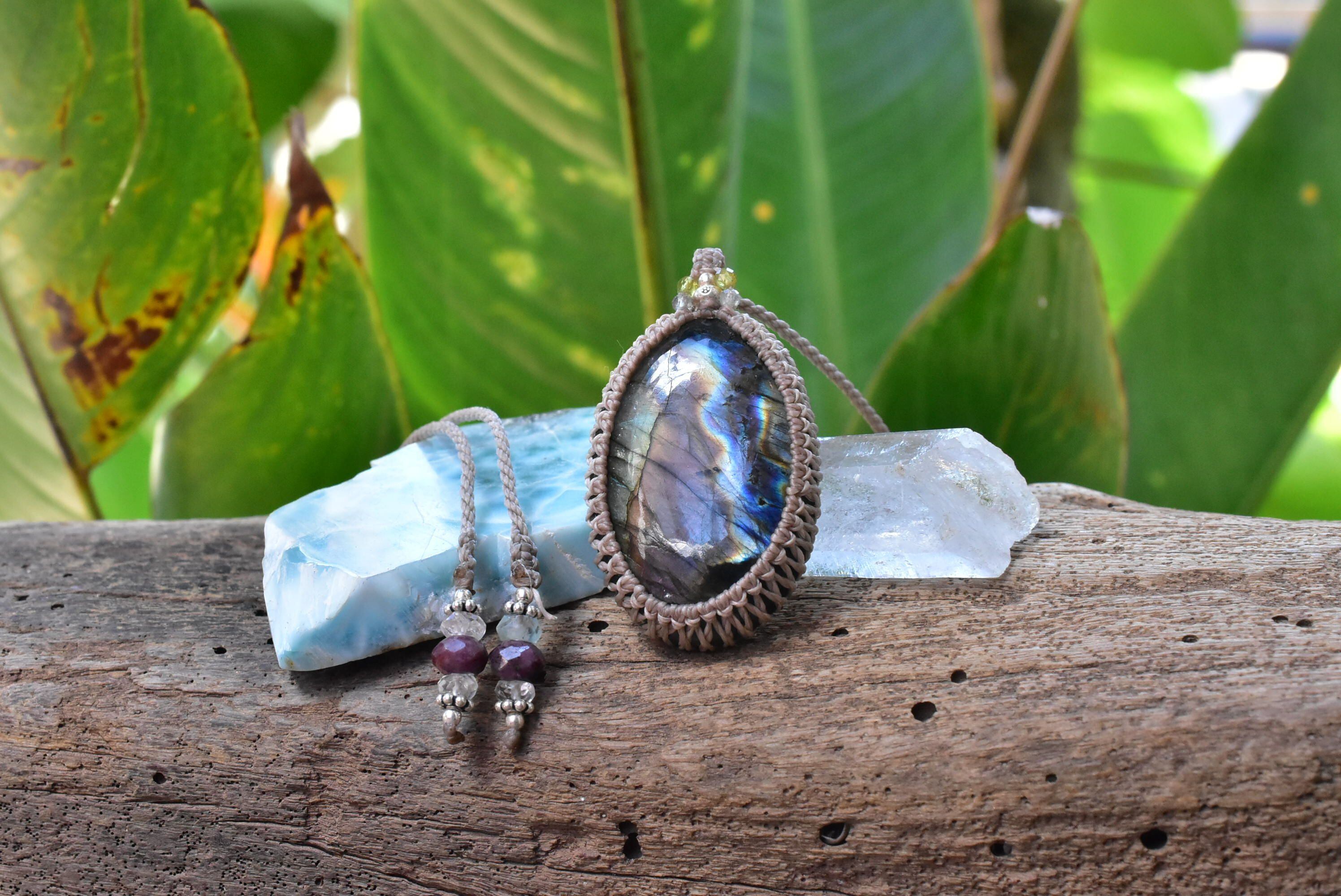 眩い光のベール★高品質マルチカラーパープルラブラドライト マクラメペンダント lay010