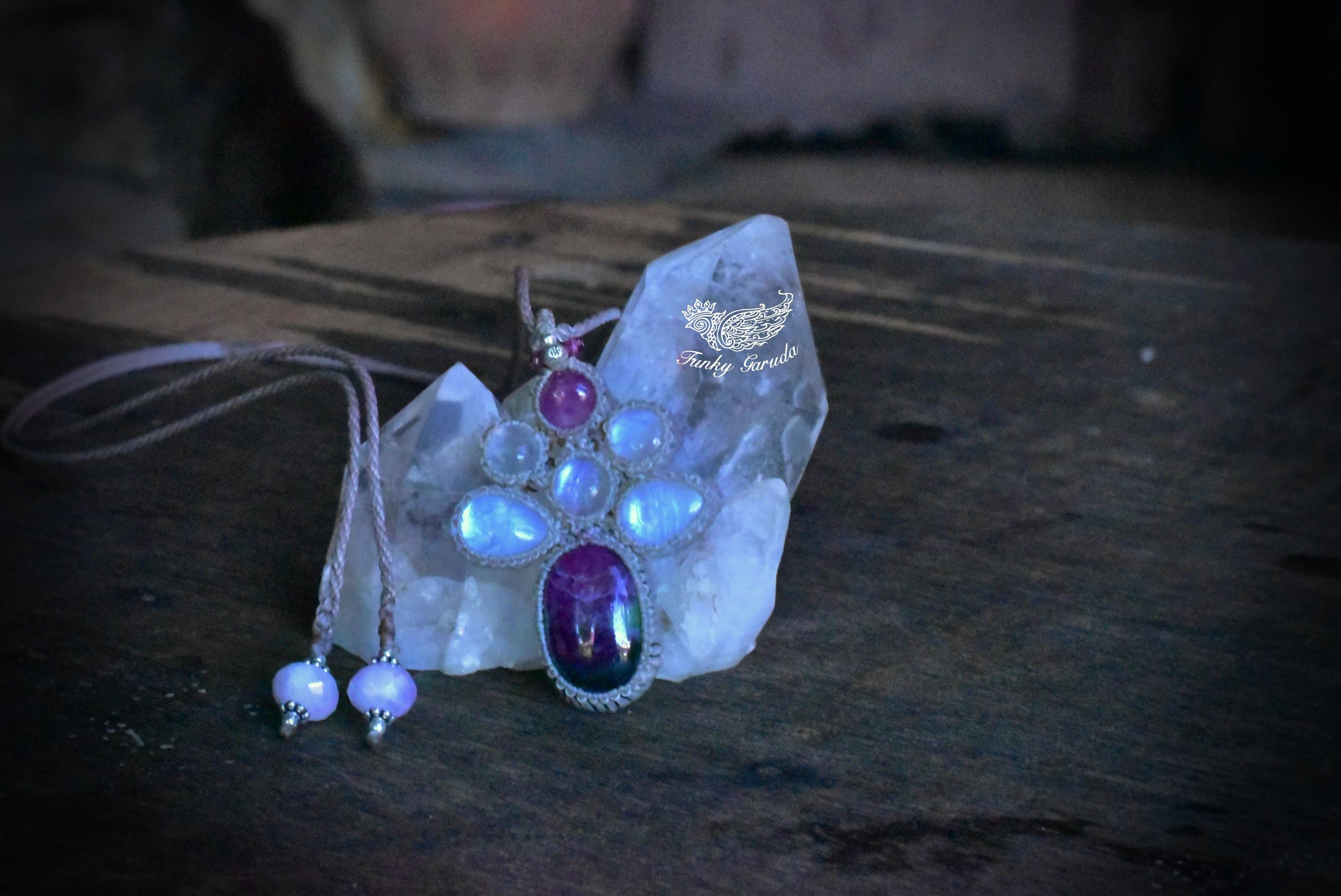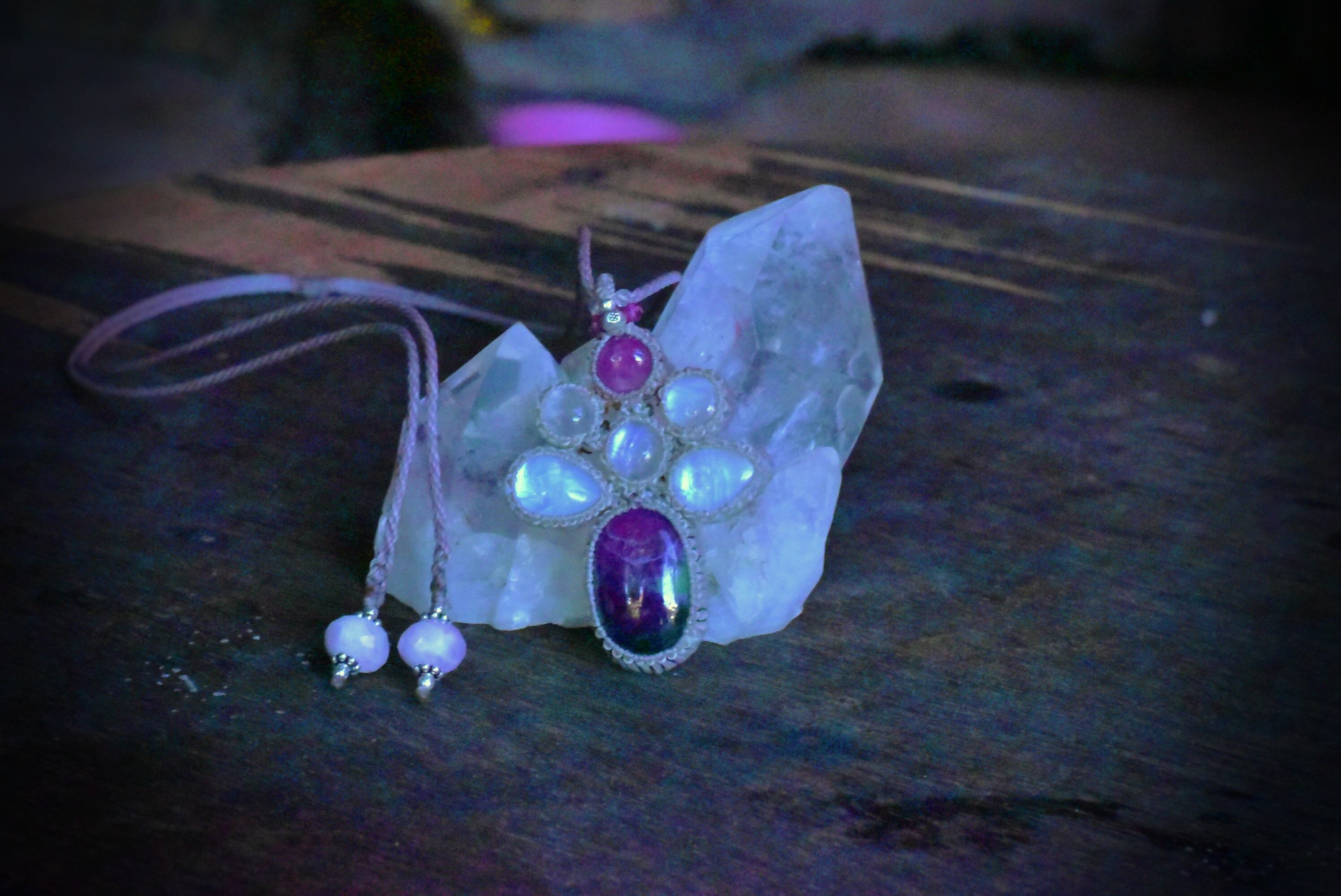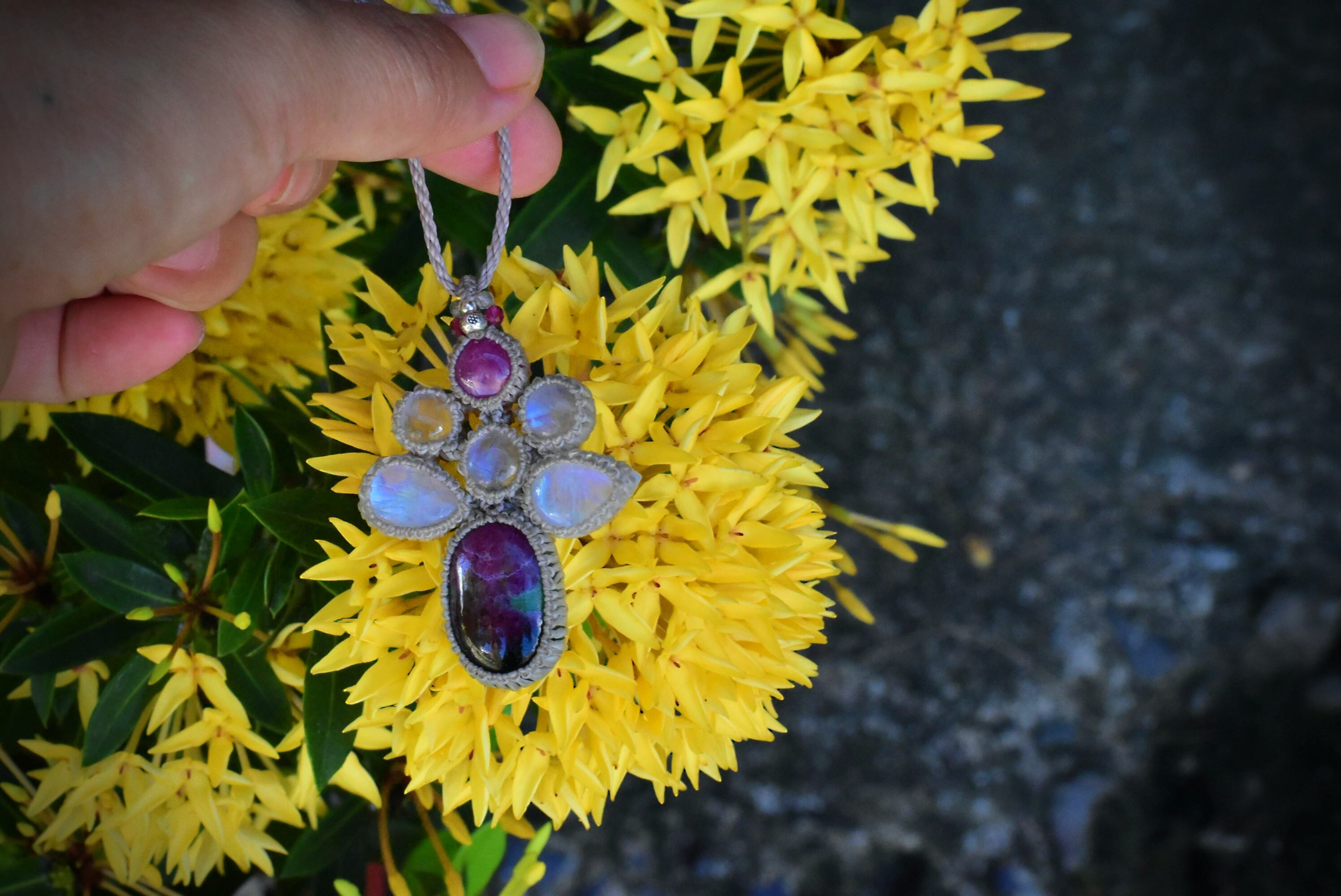 愛の花★ルビーインゾイサイト レインボームーンストーン マクラメペンダントruby022