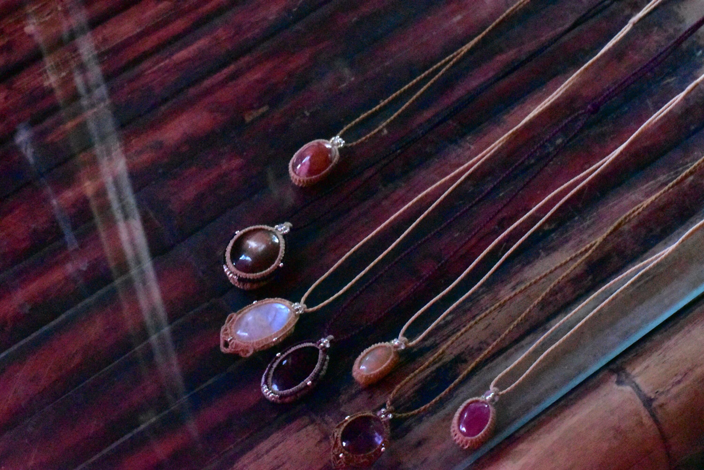 ◆このたびはカフェオレ色の蝋引き糸を使用しマクラメ編み装飾を施しました。