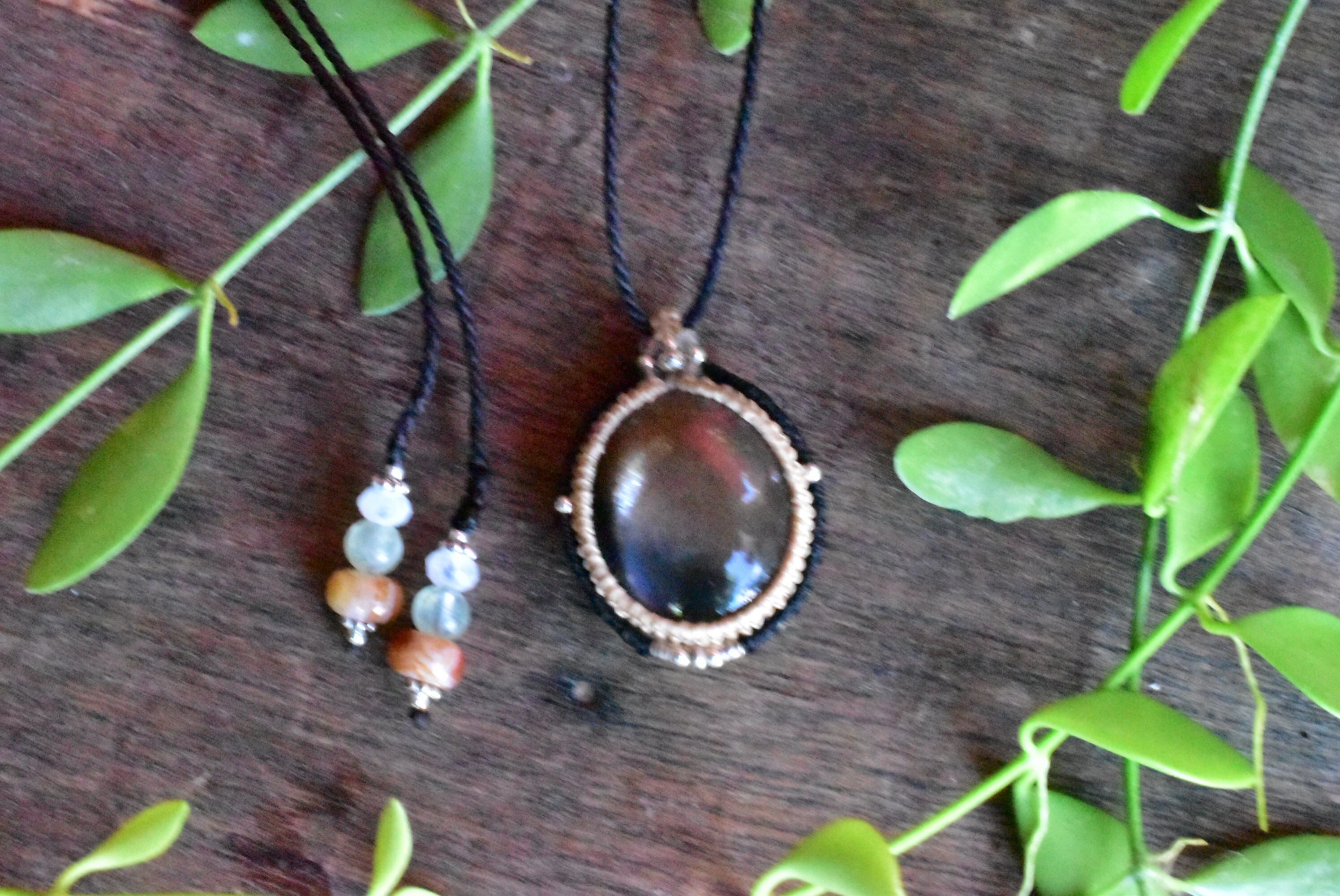 ◆このたびはブラック、差し色としてキャラメル色の蝋引き糸を使用しマクラメ編み装飾を施しました。
