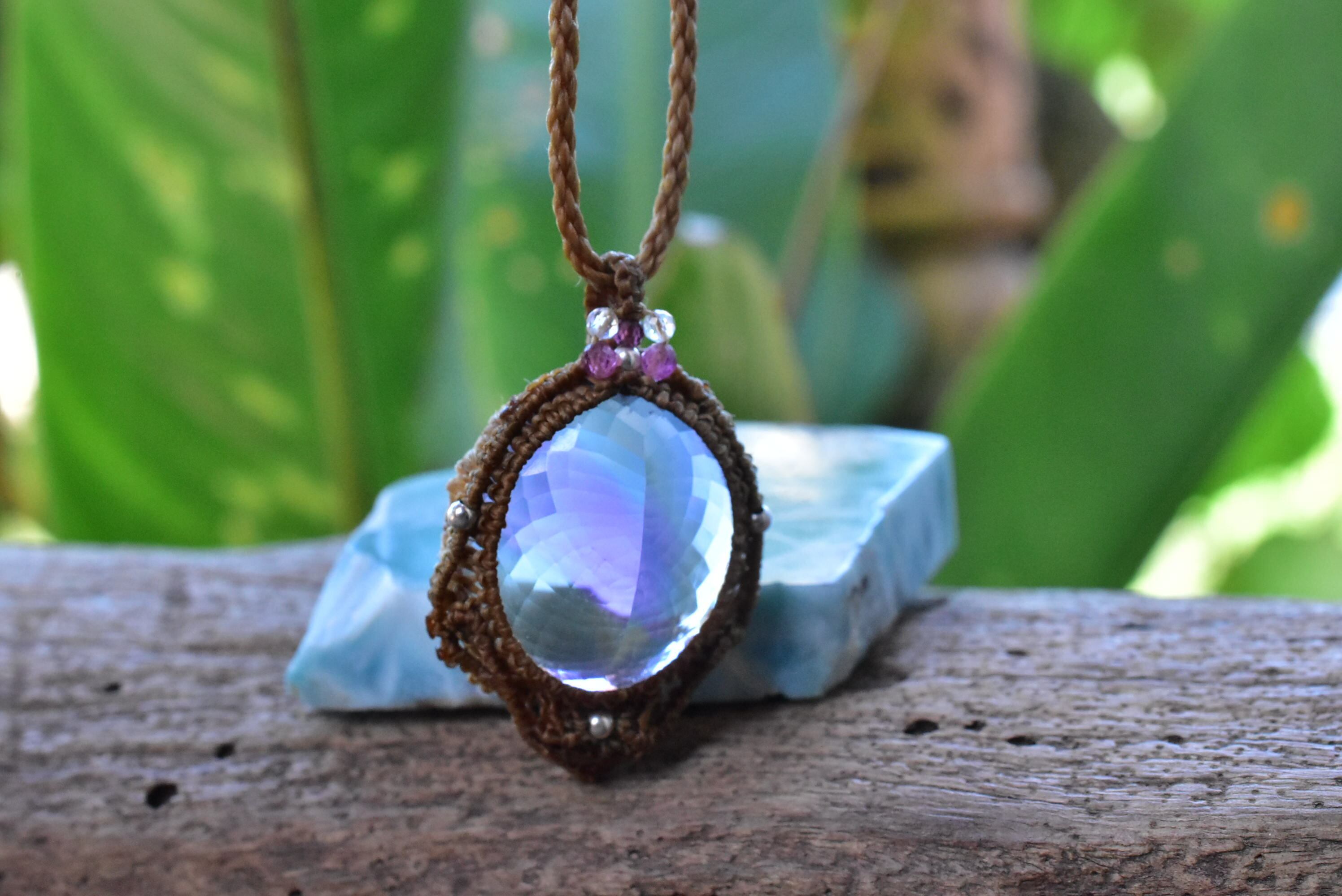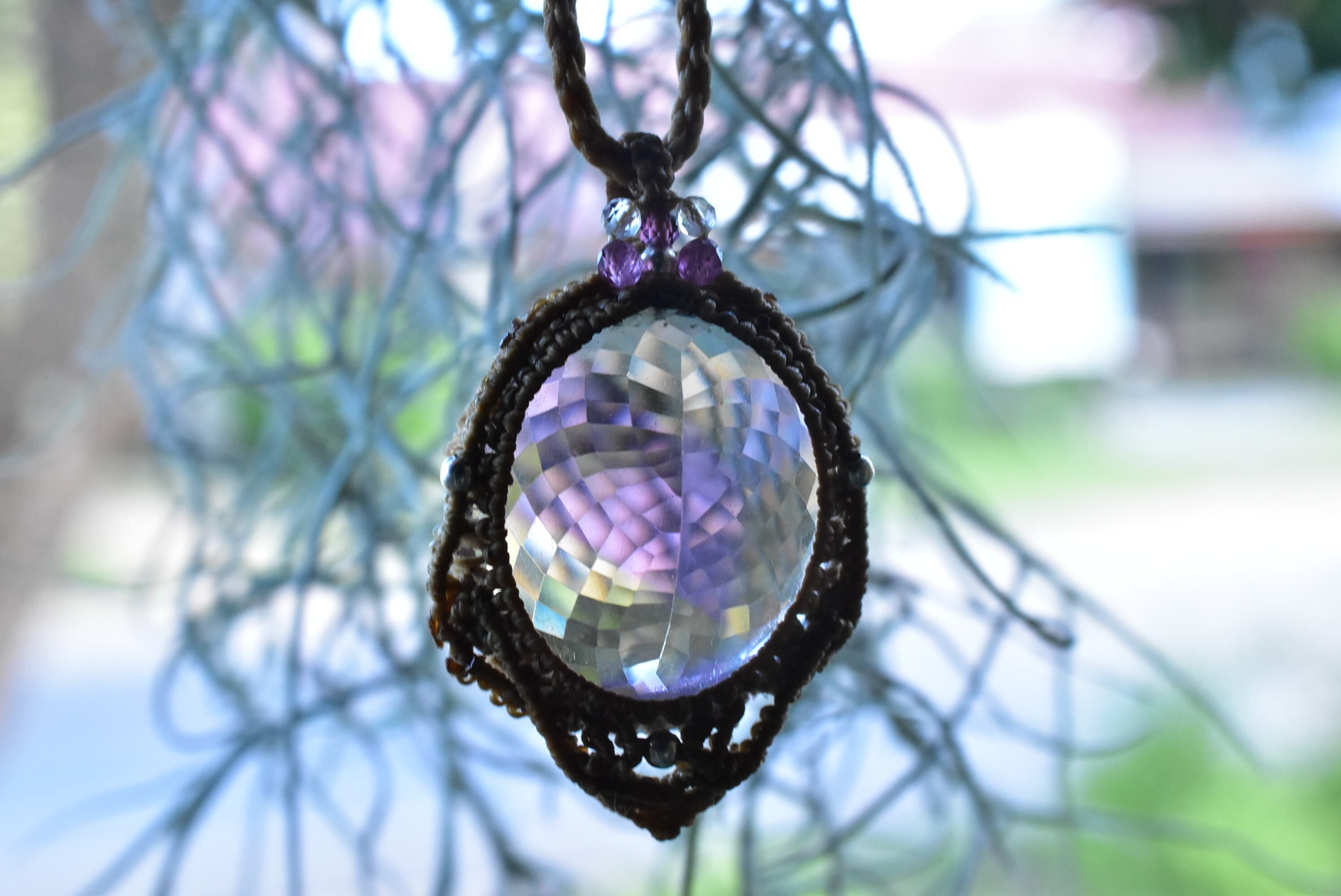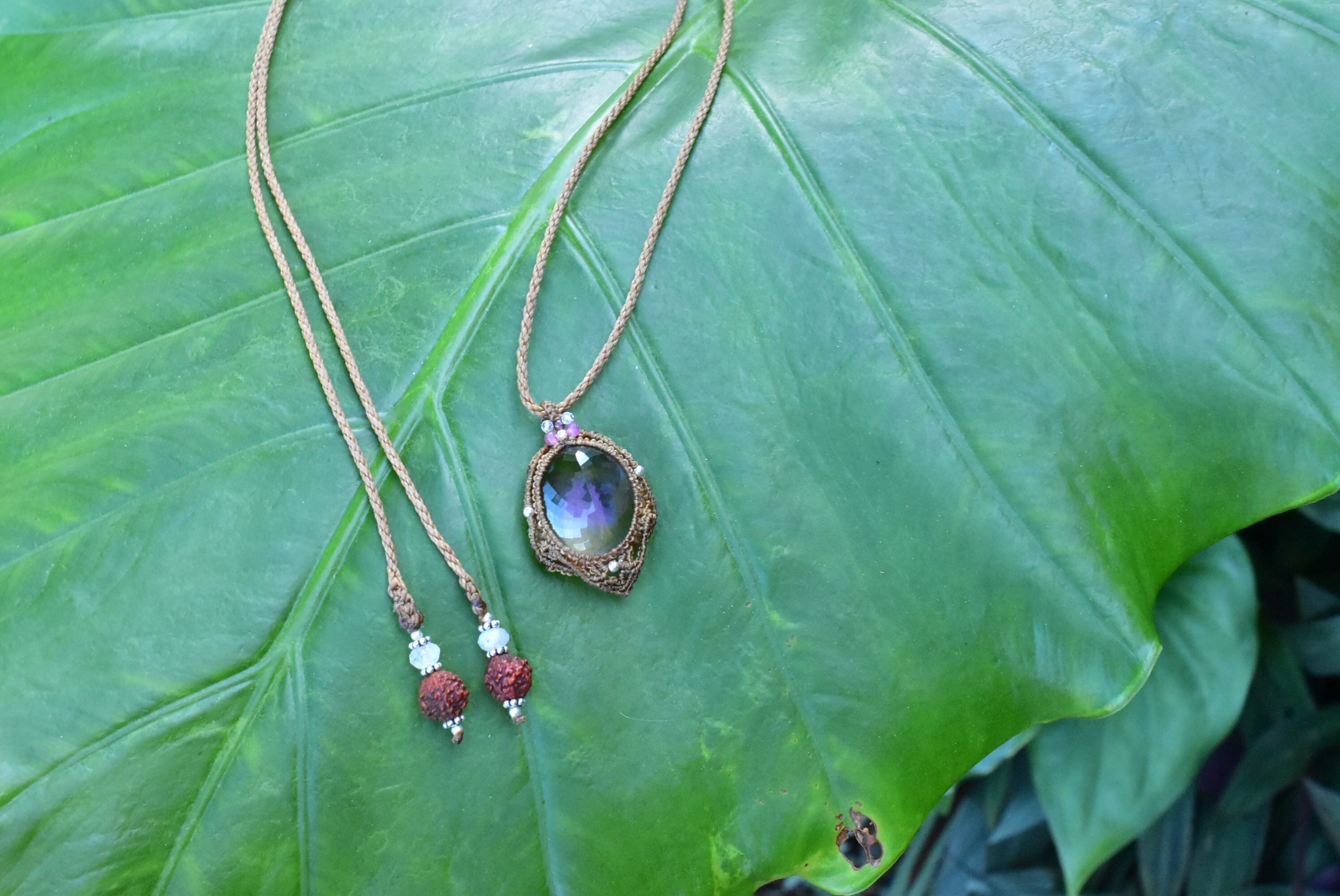 宝石のまわりを丁寧にマクラメ編み装飾を施しました。