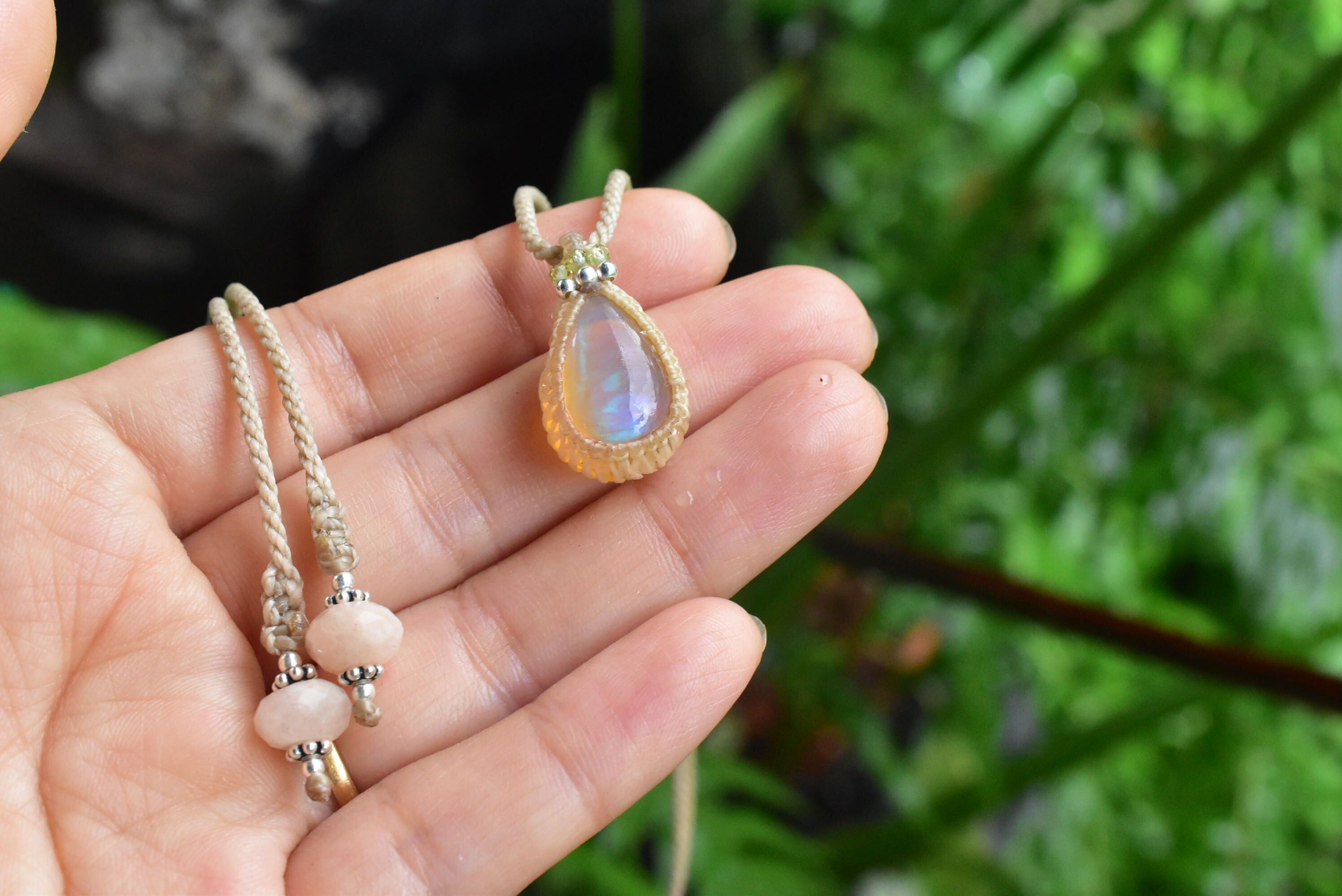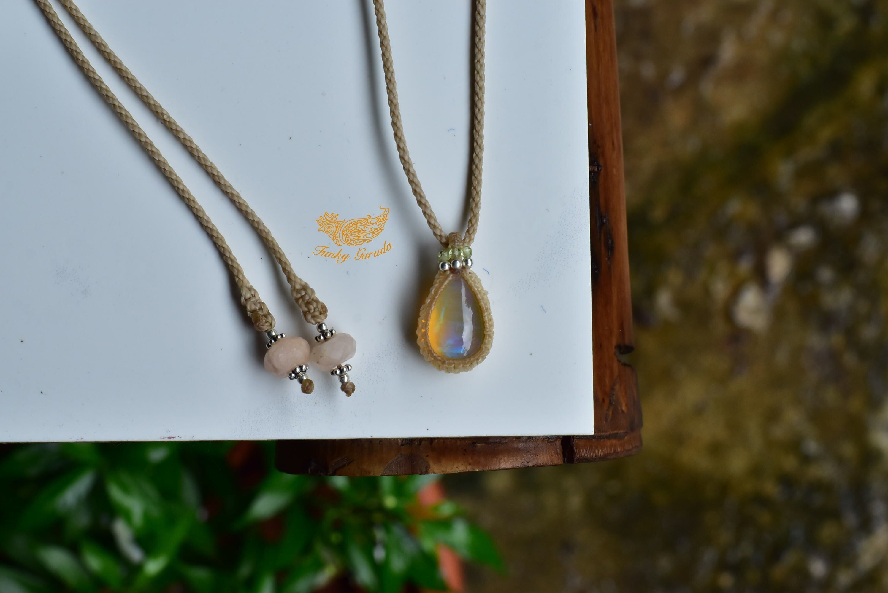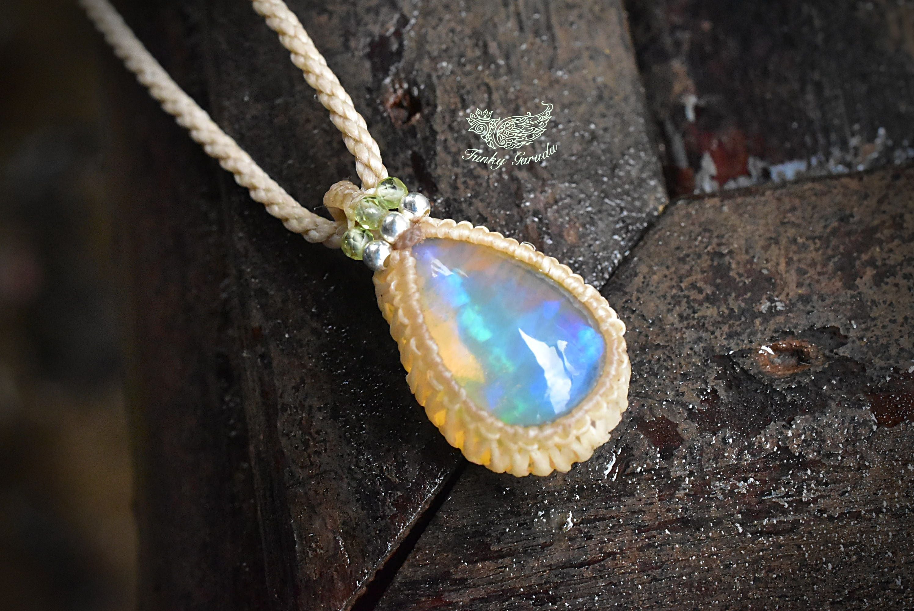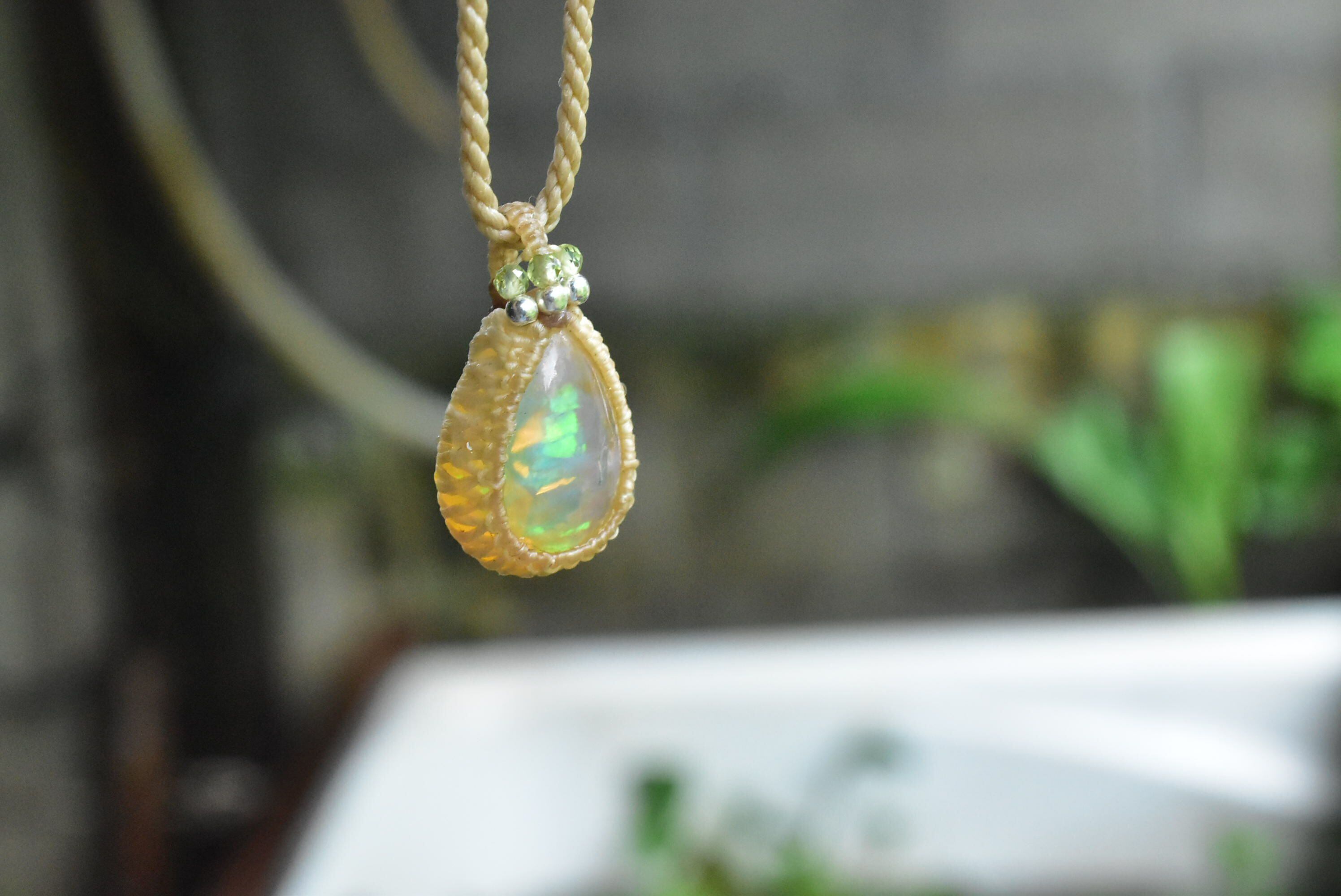 水分を多く含むぷるんとした乳白色に、華やかな遊色効果が楽しめるものをシンプルなマクラメペンダントに仕上げました。