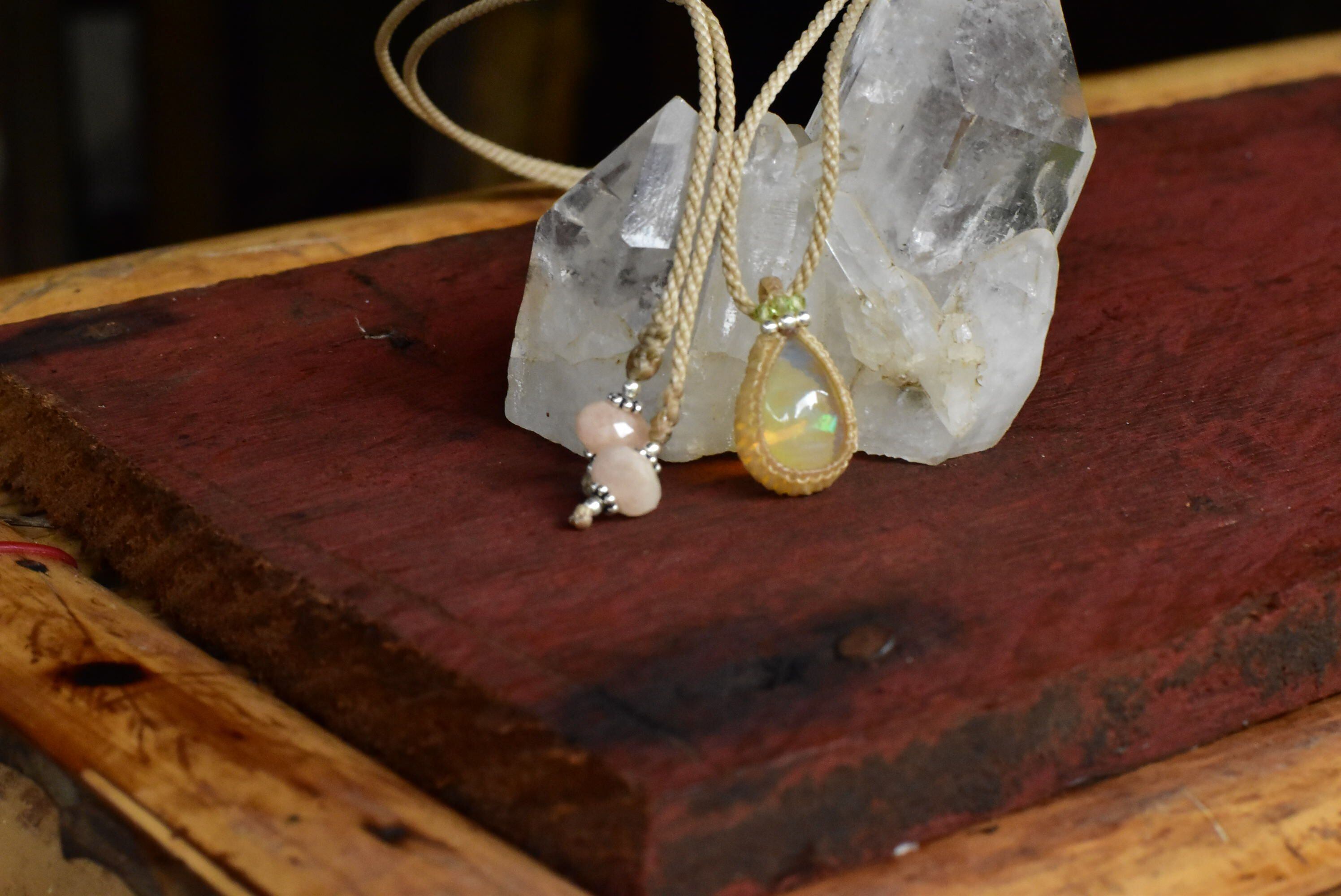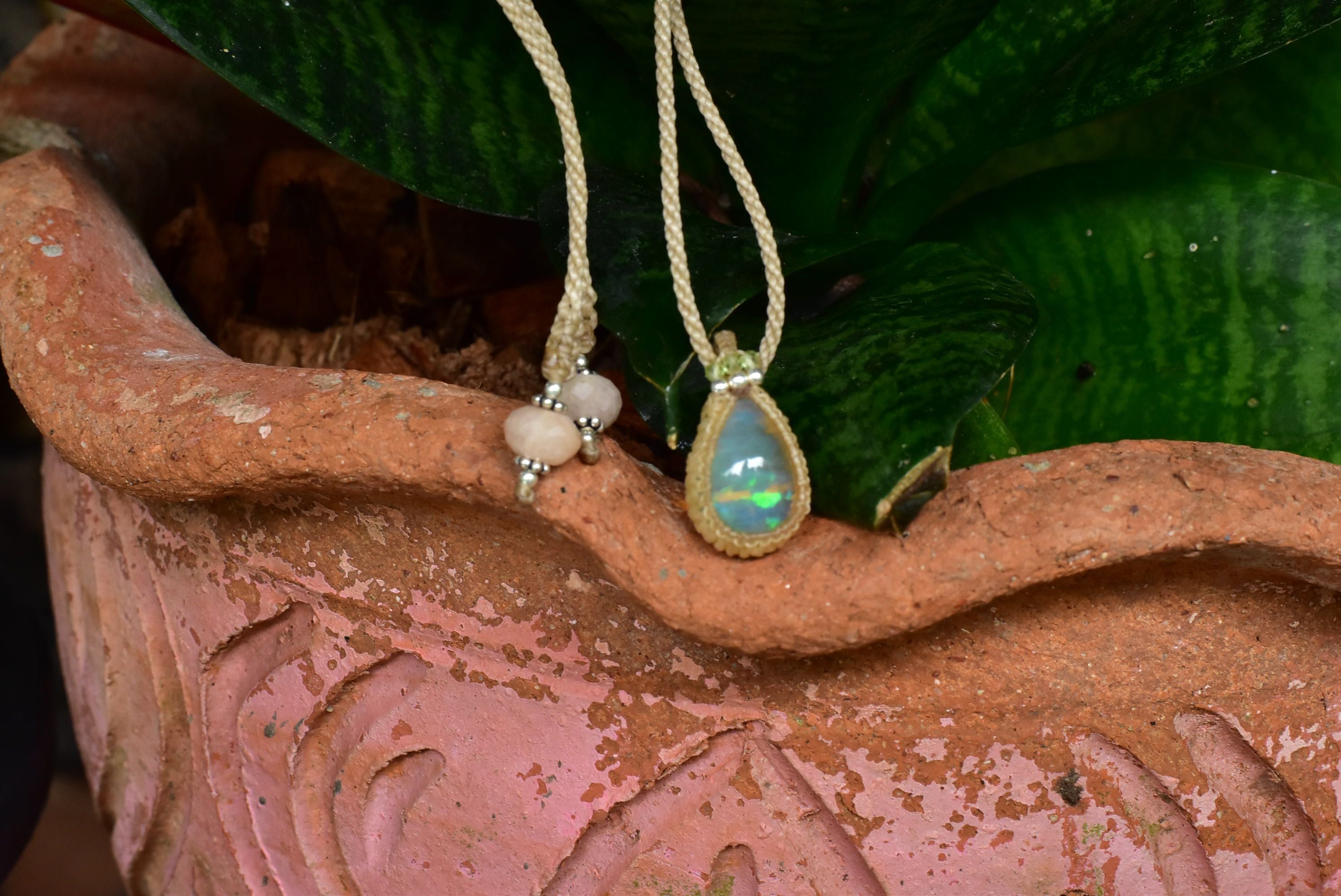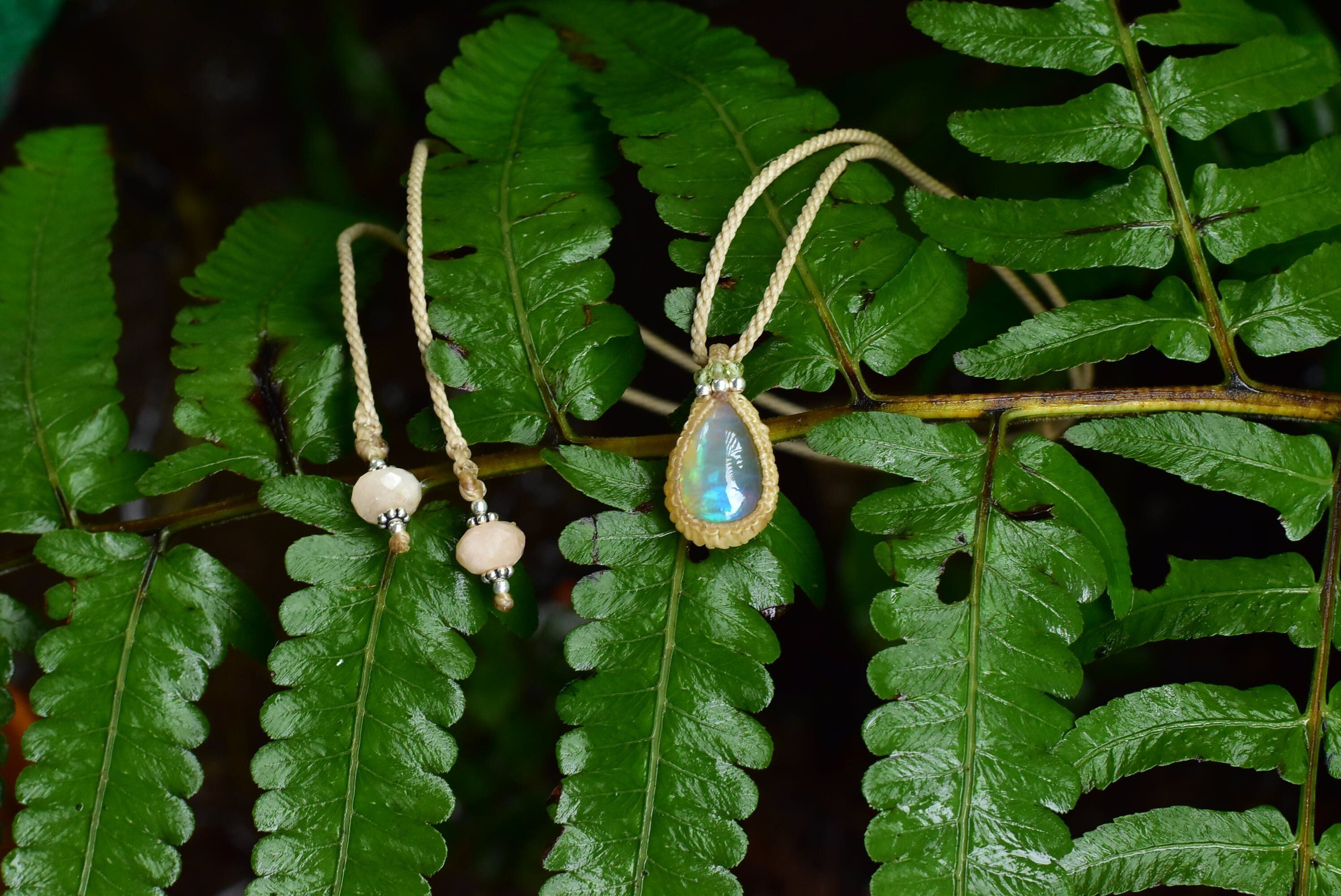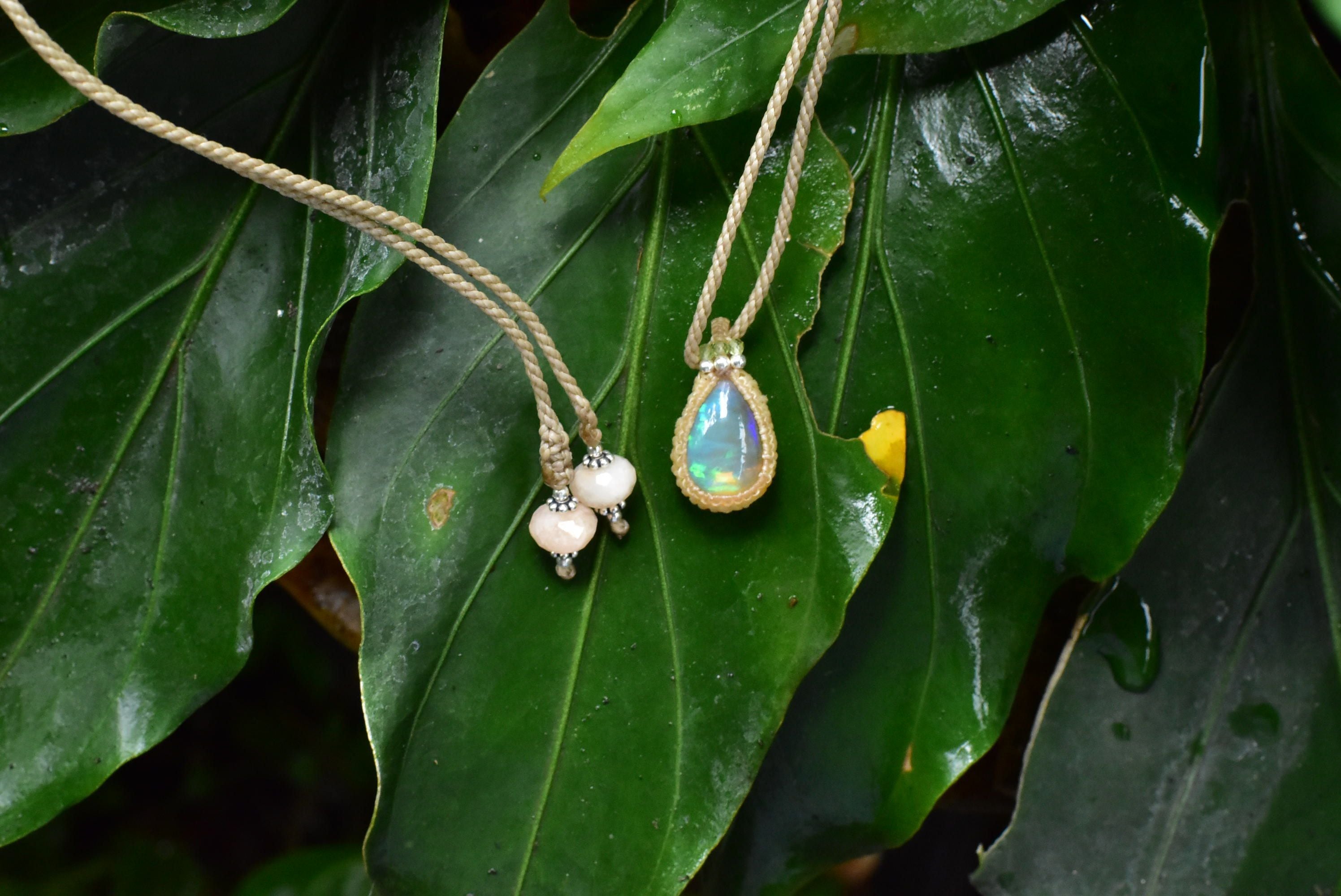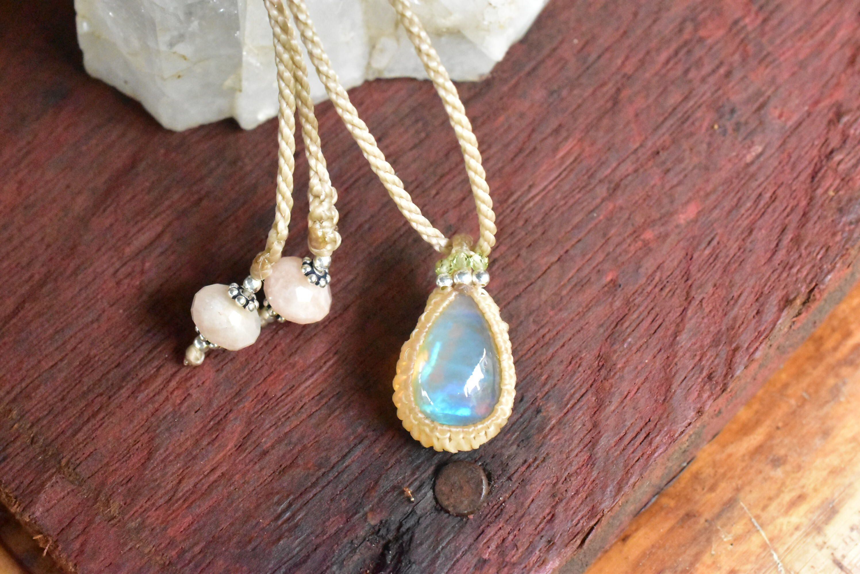 水分を多く含むぷるんとした乳白色に、華やかな遊色効果が楽しめるものをシンプルなマクラメペンダントに仕上げました。