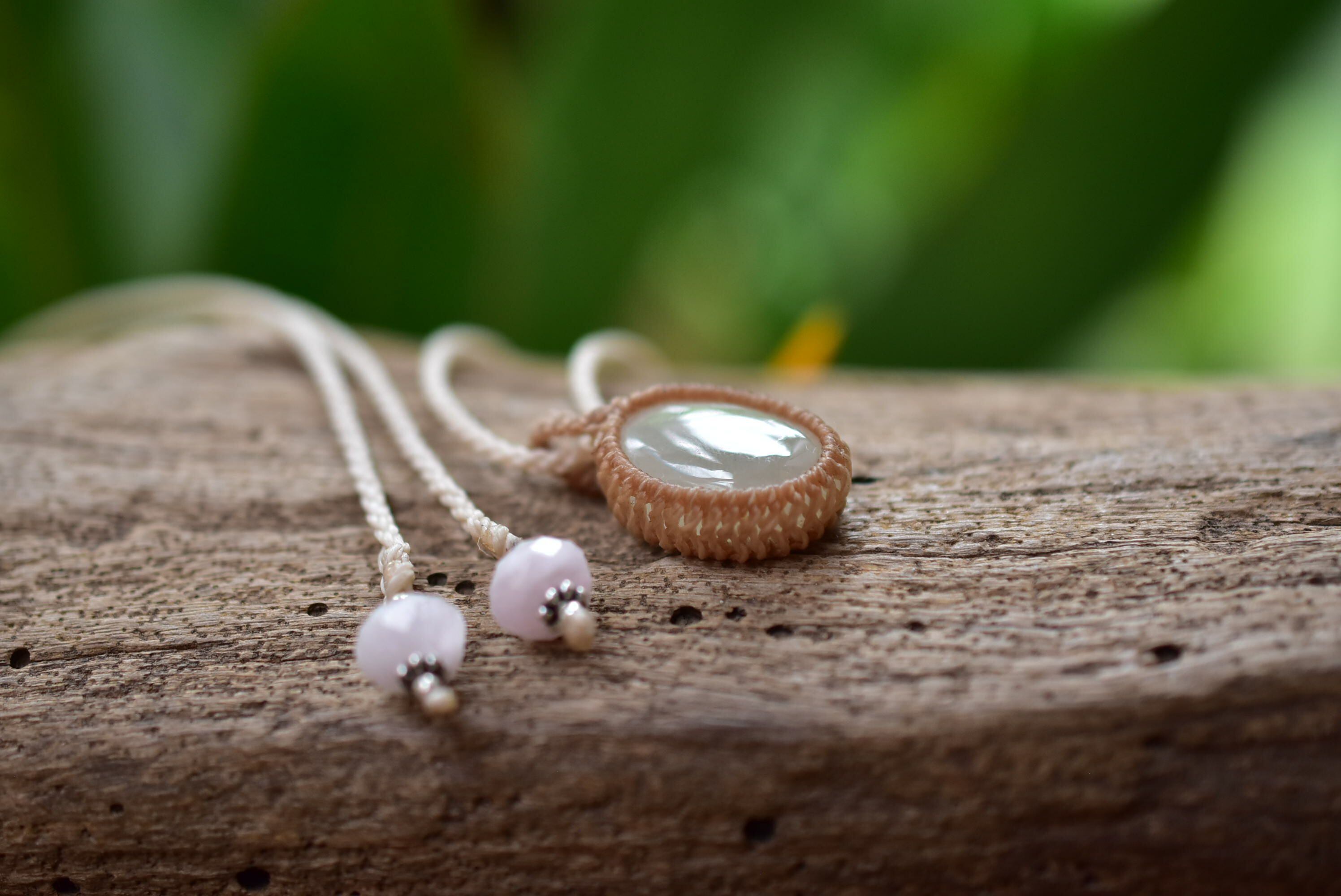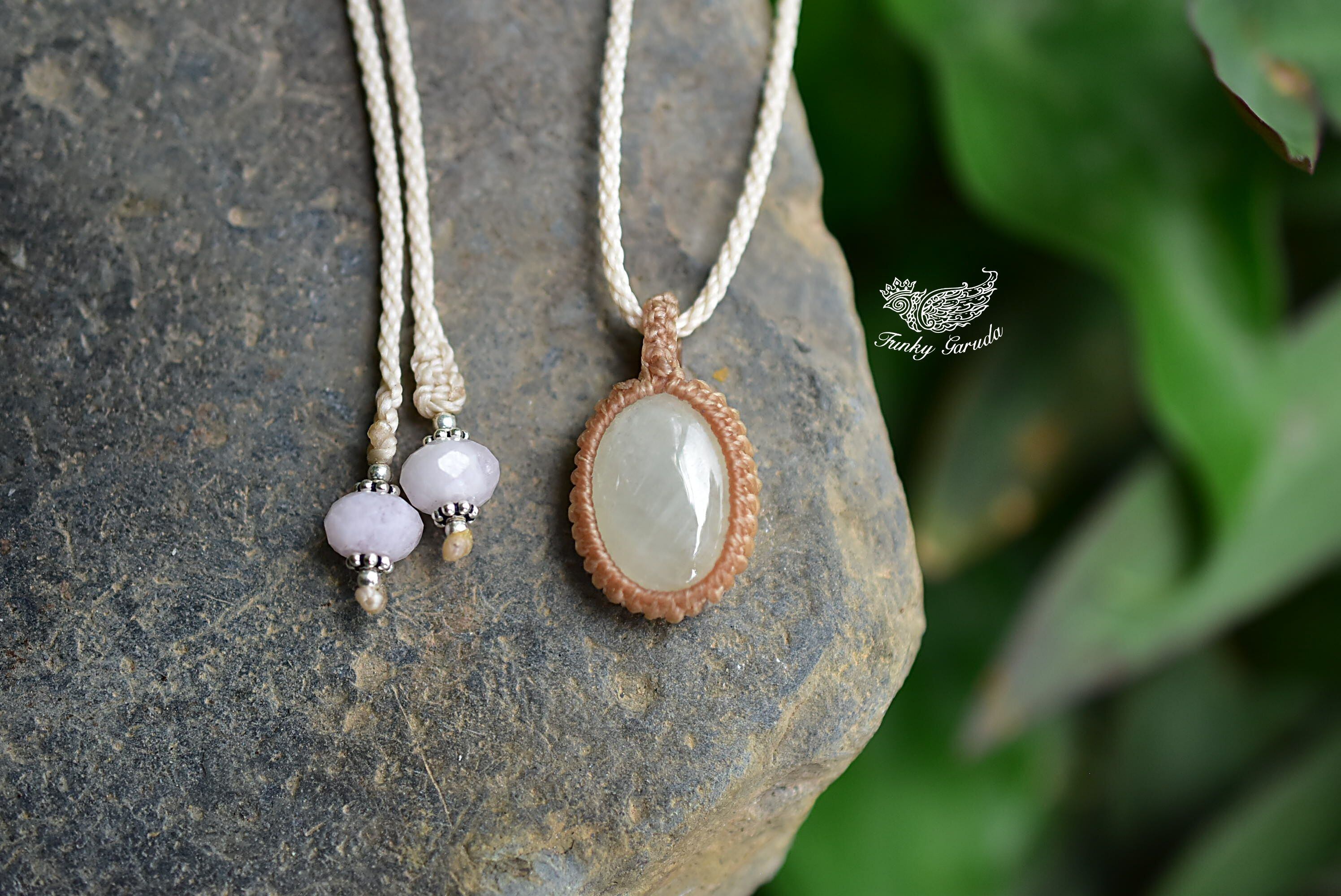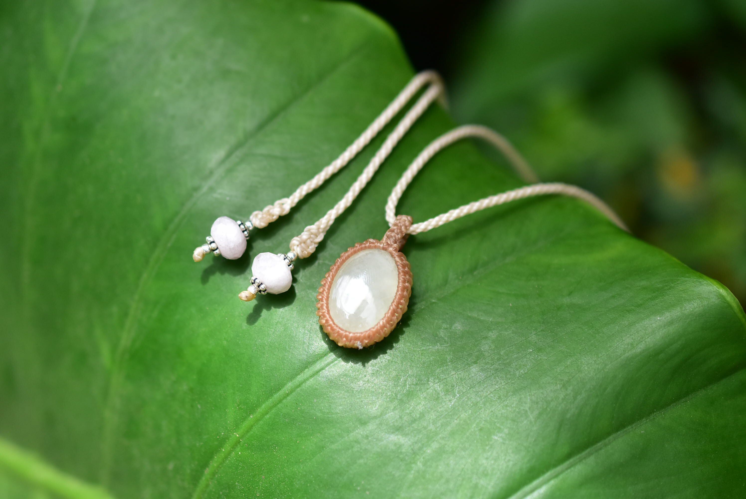 ◆このたびはキャラメル、ナチュラルホワイト色の蝋引き糸を使用しマクラメ編み装飾を施しました。