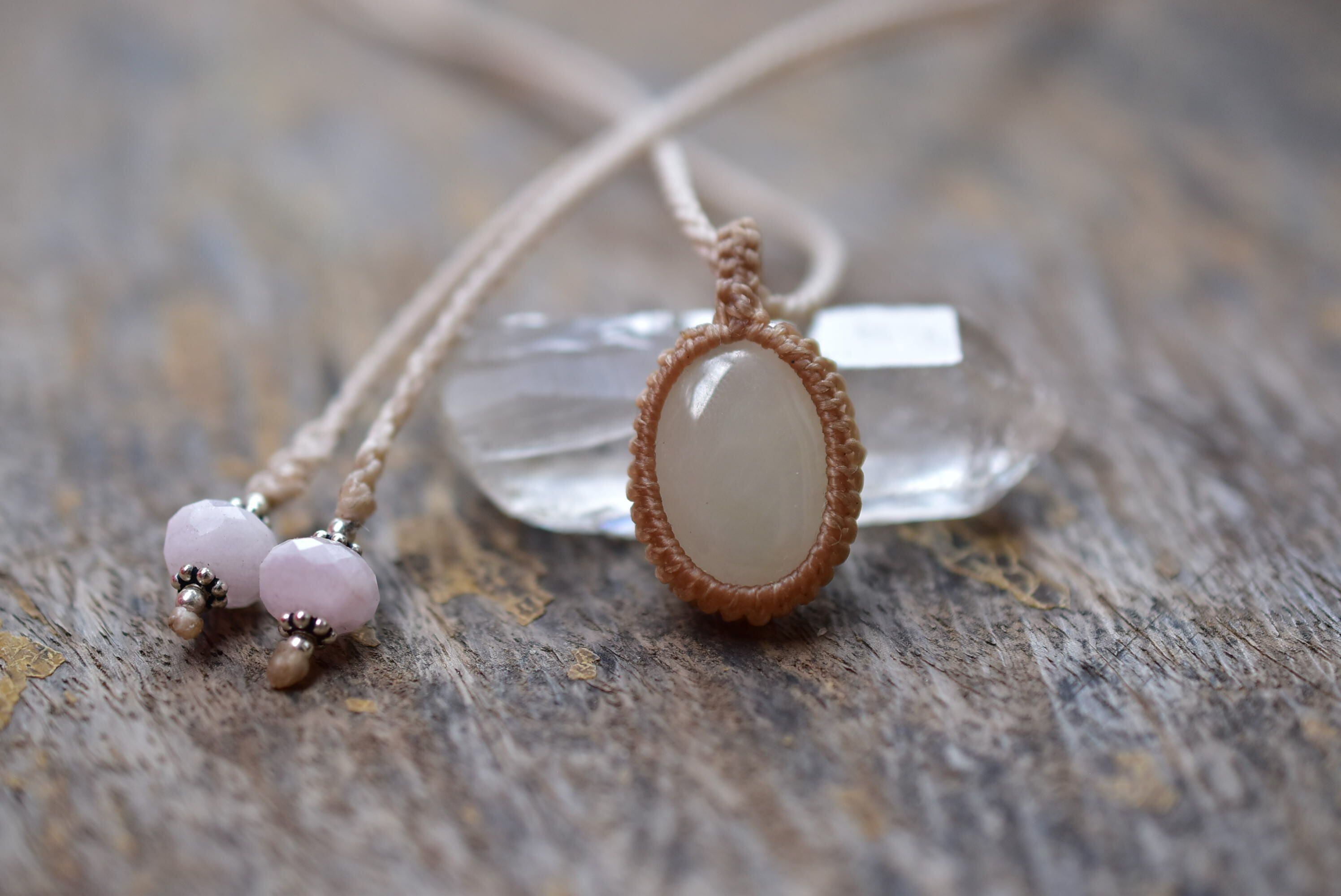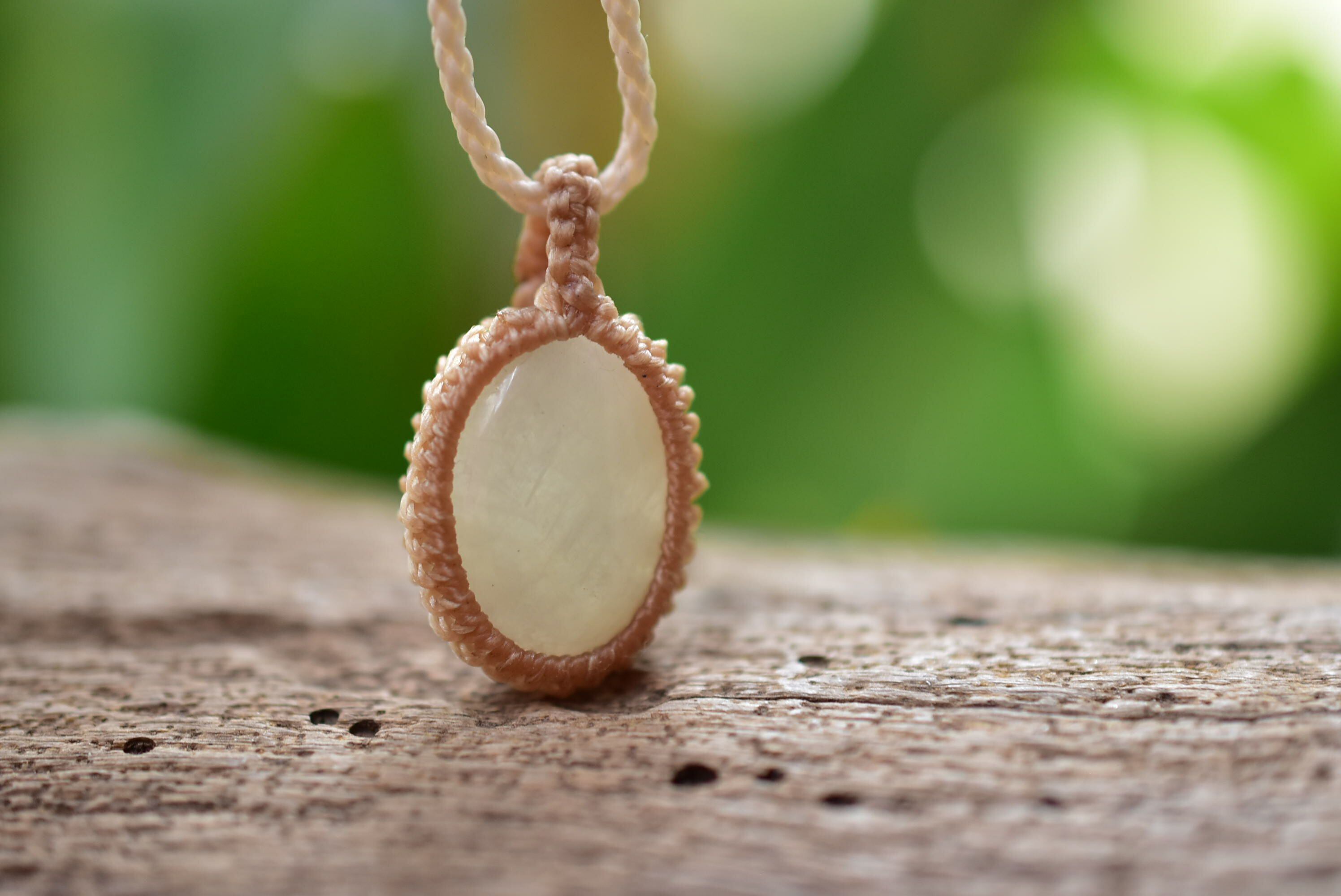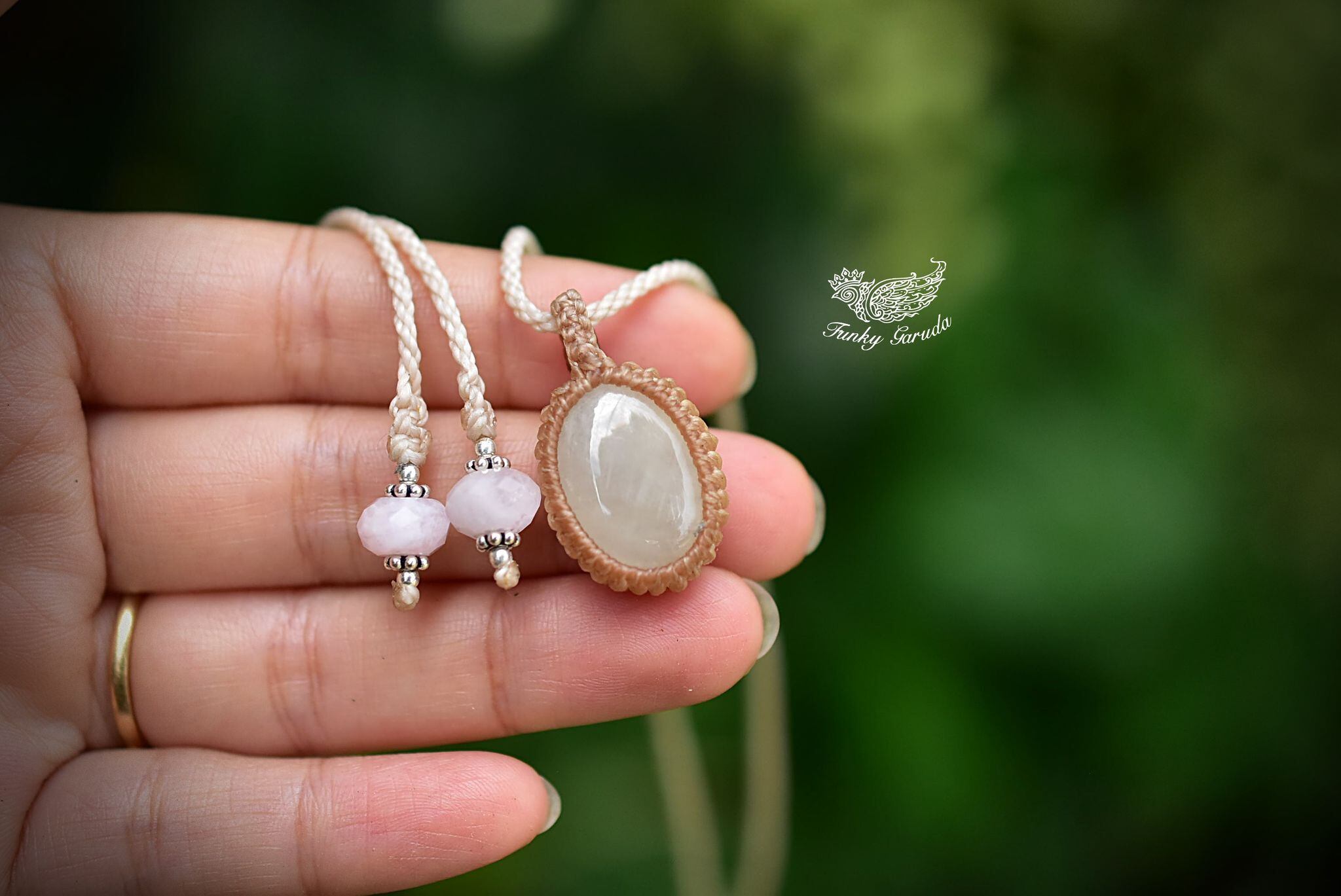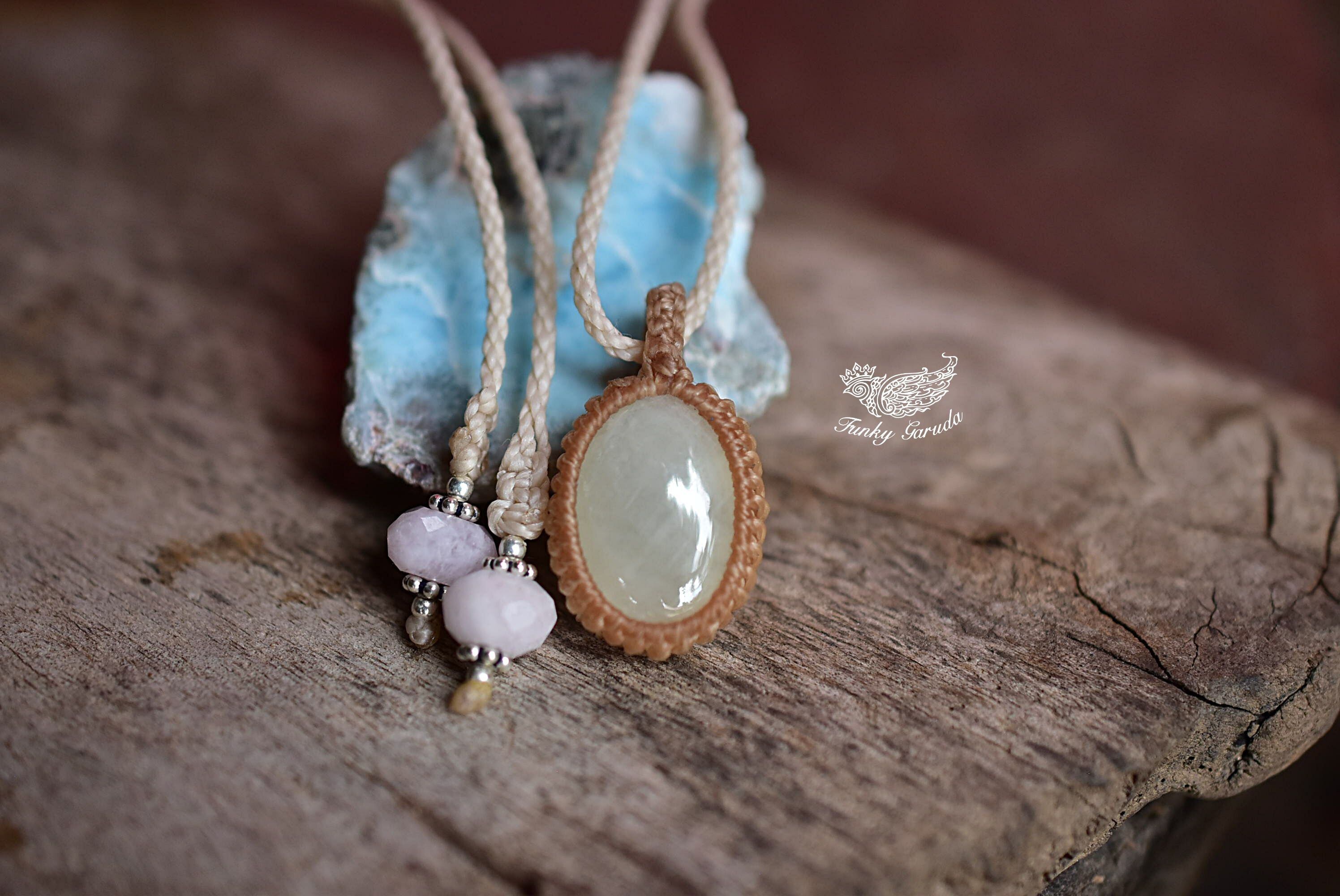 ◆このたびはキャラメル、ナチュラルホワイト色の蝋引き糸を使用しマクラメ編み装飾を施しました。