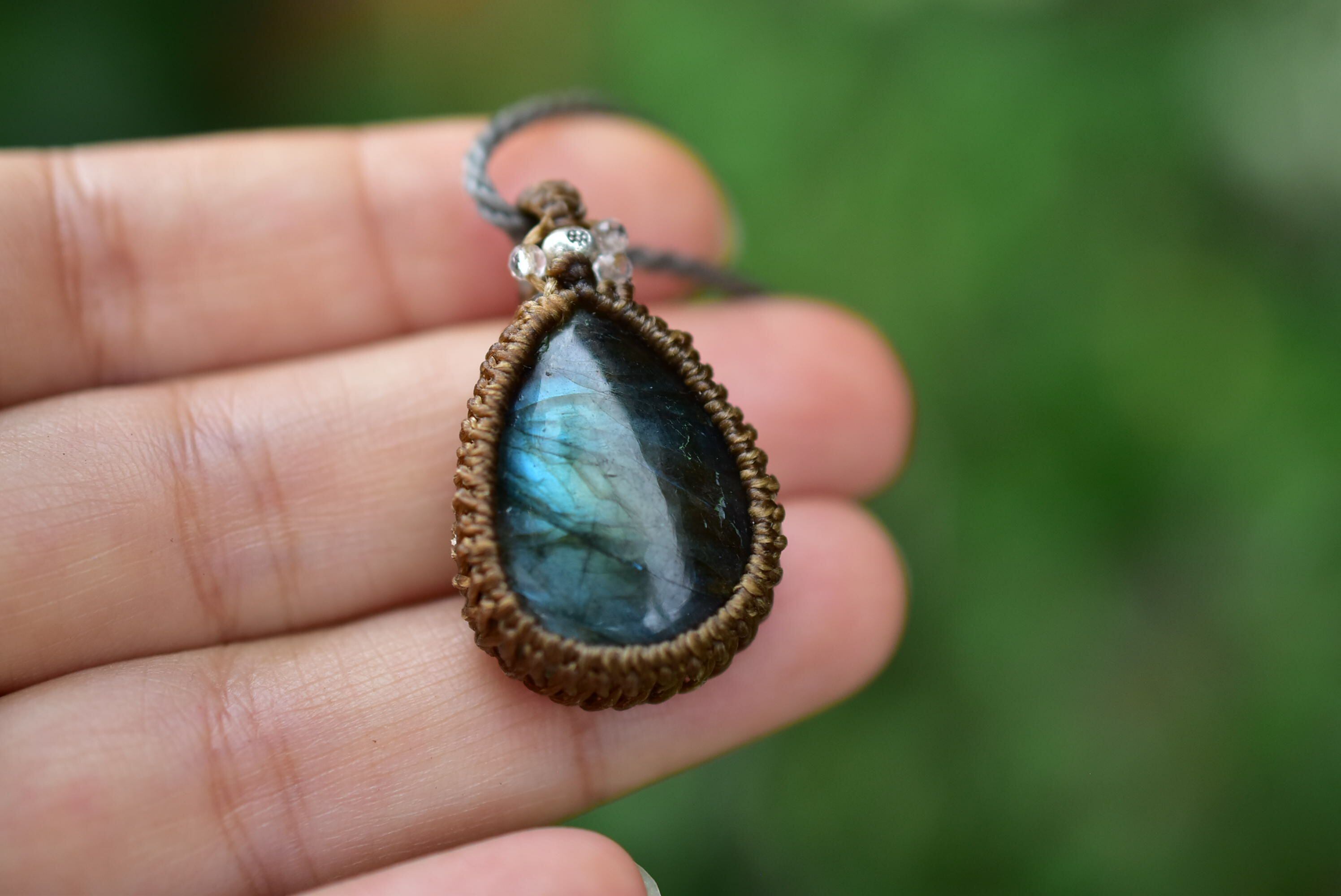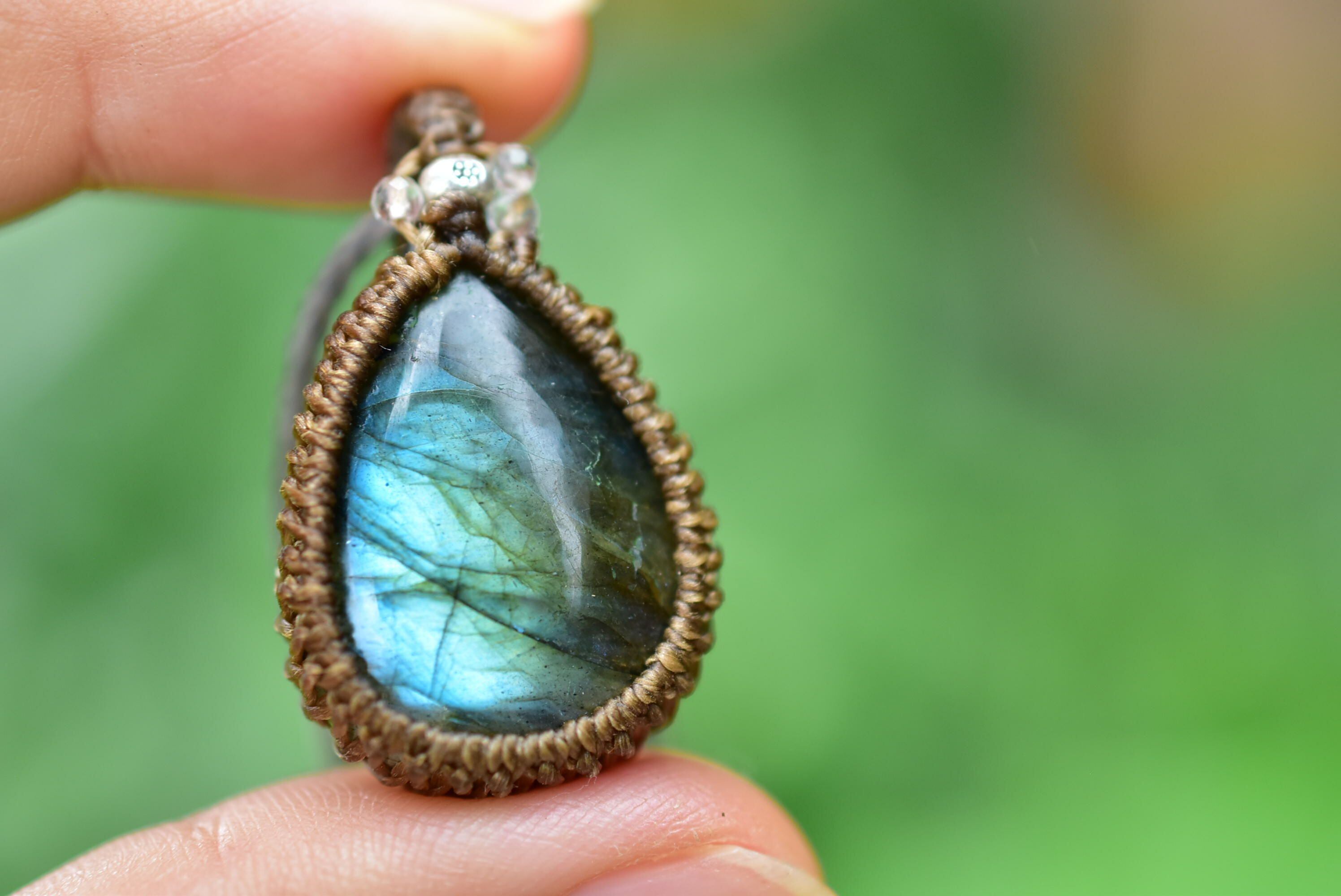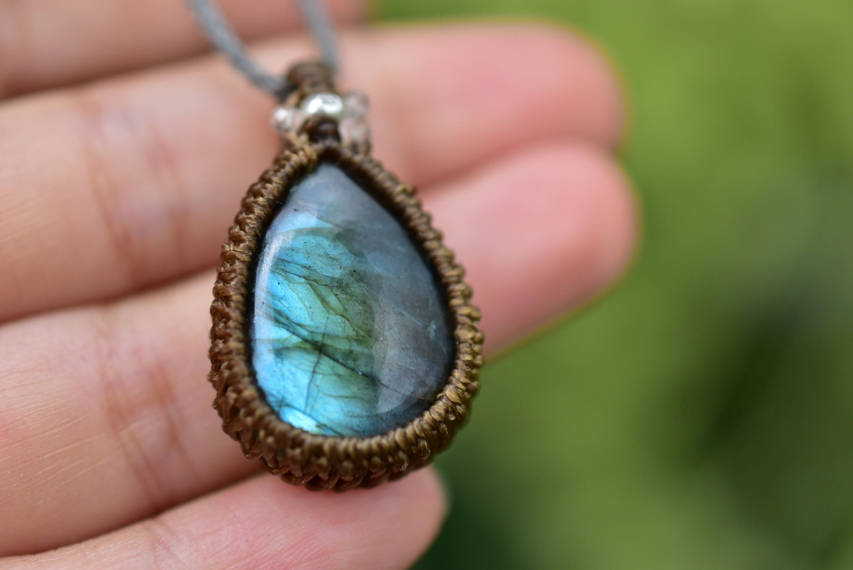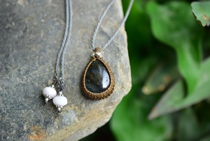華やかさと上品さを兼ね備えたラブラドライトを、シンプルなマクラメペンダントに仕上げました。
